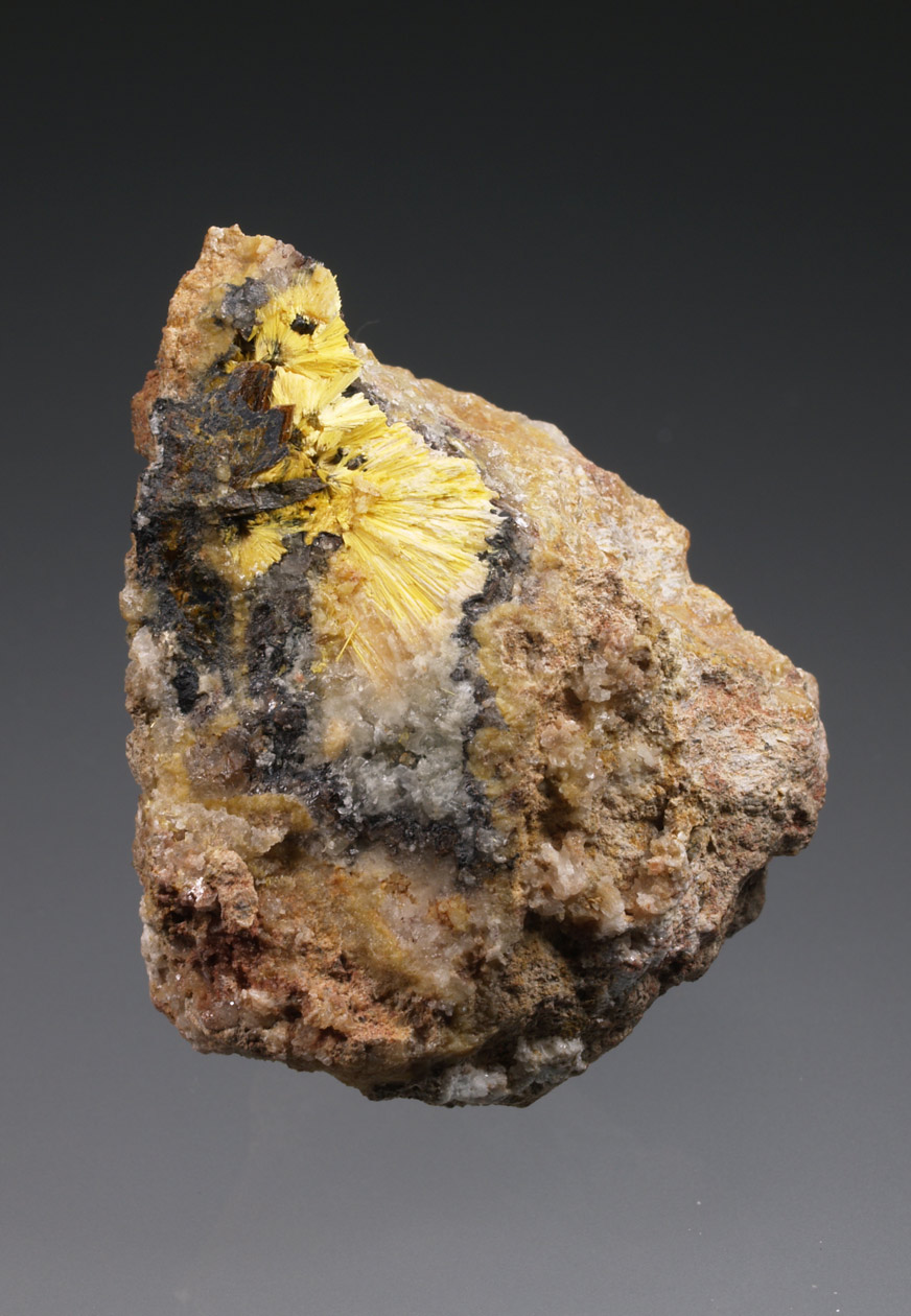 Estético agregado radial de cristales de boltwoodita, de esta localidad clásica para la especie. Buen brillo e intenso color. La etiqueta original indica Rössing mine, pero ene sa época se etiquetaron erróneamente.