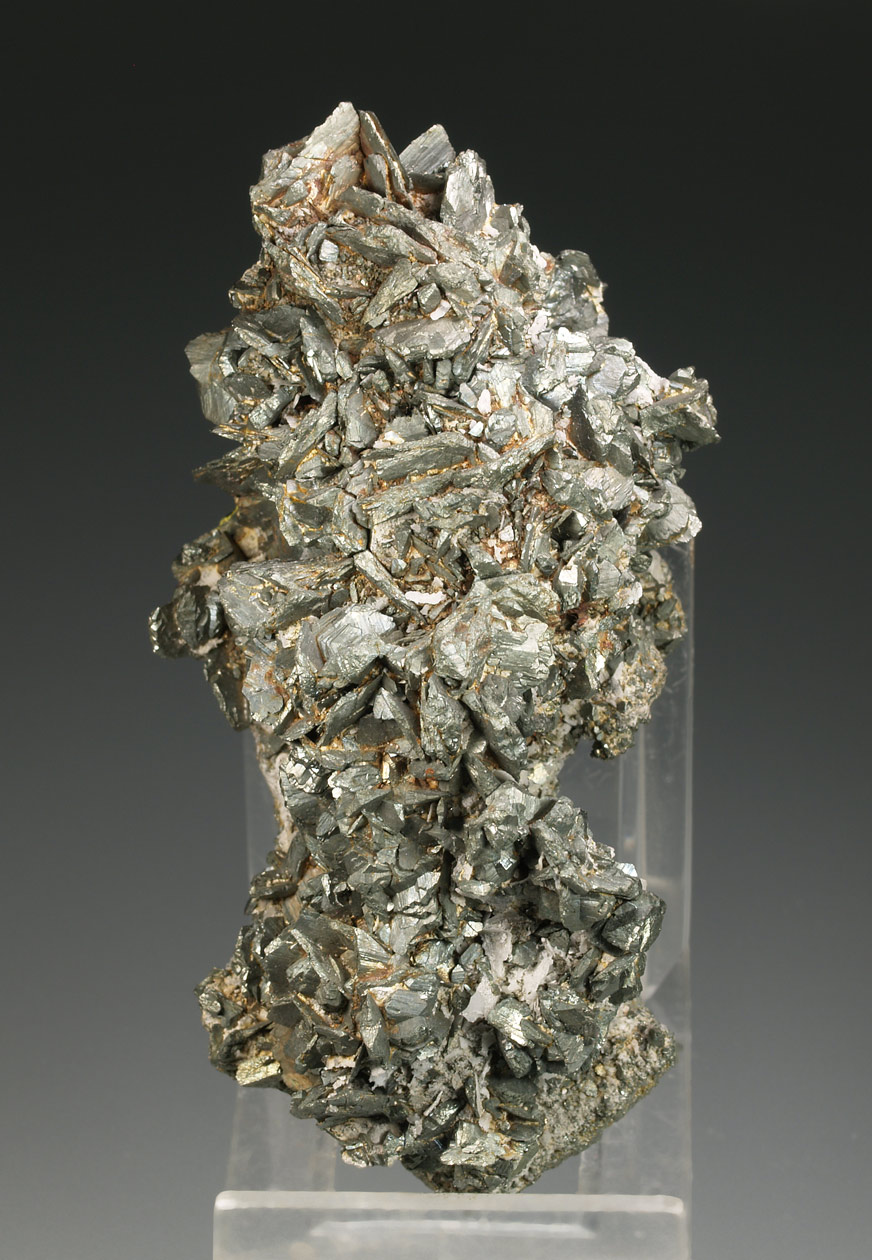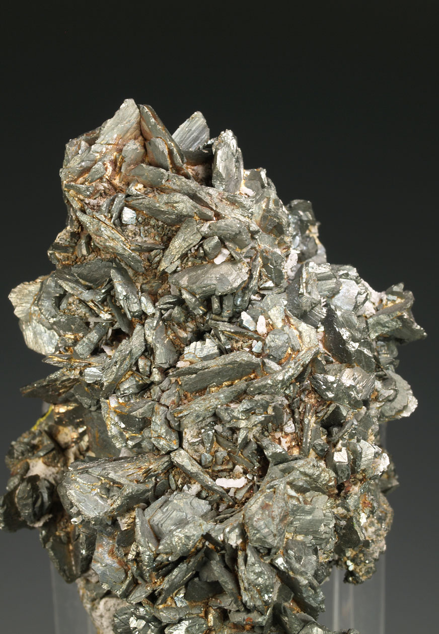 Vistoso ejemplar de marcasita de una localidad situada en nuestras antípodas, en Nueva Zelanda. La pieza muestra numerosos cristales maclados en cresta de gallo. Procede de una colección privada de Barcelona.
