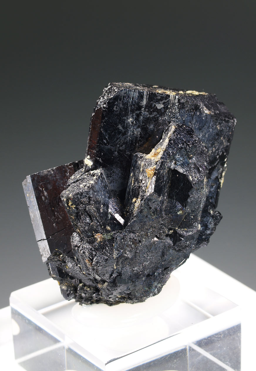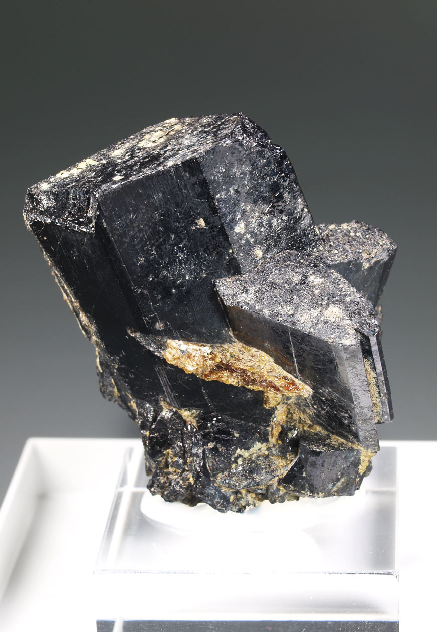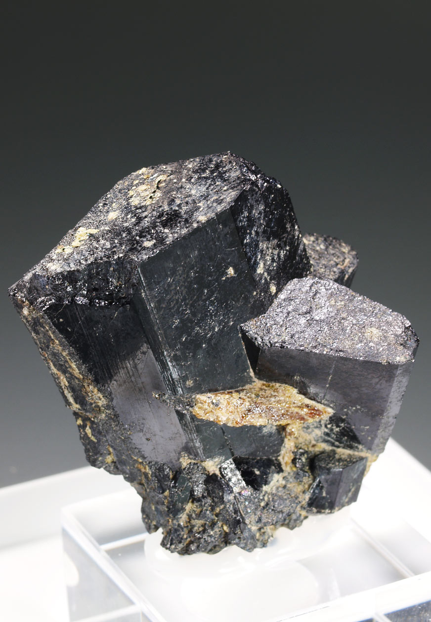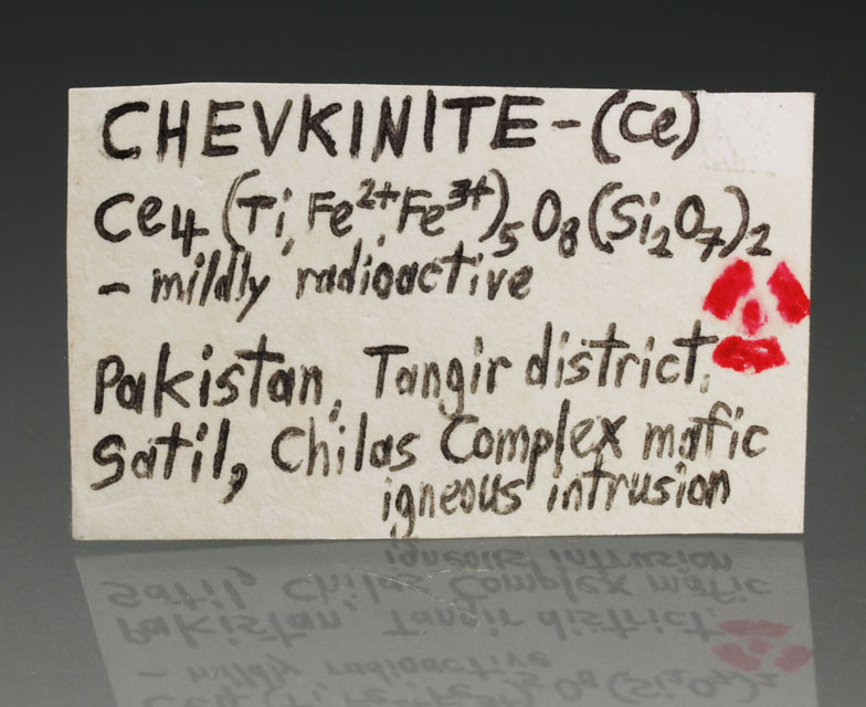 Un ejemplar de muy buen tamaño de este raro silicato de tierras raras: chevkinita-(Ce), procedente del mejor descubrimiento mundial para la especie. Esta remota localidad pakistaní comenzó a producir estos magníficos ejemplares a finales de la década de 1990, principios de los 2000. Este grupo muestra cristales euhedricos, definidos, facetados y con caras terminales negras, bastante brillantes, que miden hasta 4,5 cm sobre una matriz de chevkinita-(Ce). De los ejemplares de A. Petrov. Una pieza excepcional.