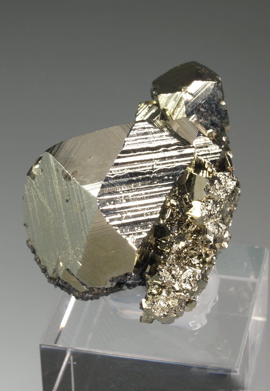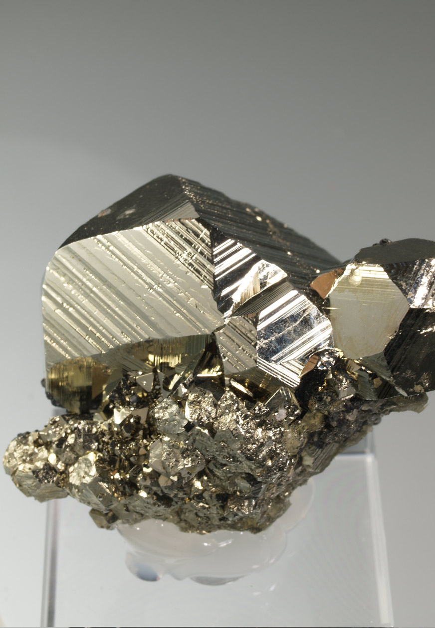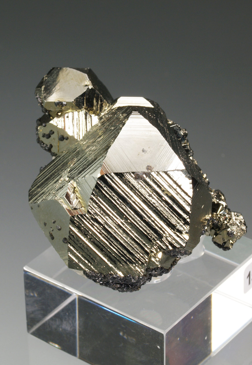 Excepcional ejemplar formado por diversos cristales de pirita, destacando el tamaño de uno de ellos, Con un brillo muy notable. Observamos interesantes crecimientos cristalográficos que nos muestran las caras del cubo con estriaciones triglifas y las caras del octaedro lisas. Se acompaña de pequeños y brillantes cristales de cuarzo y esfalerita. Una pieza muy interesante tanto desde el punto de vista estético como cristalográfico. De esta mina procede la base del "Balón de Oro" que se otorga cada año al mejor jugador del mundo.