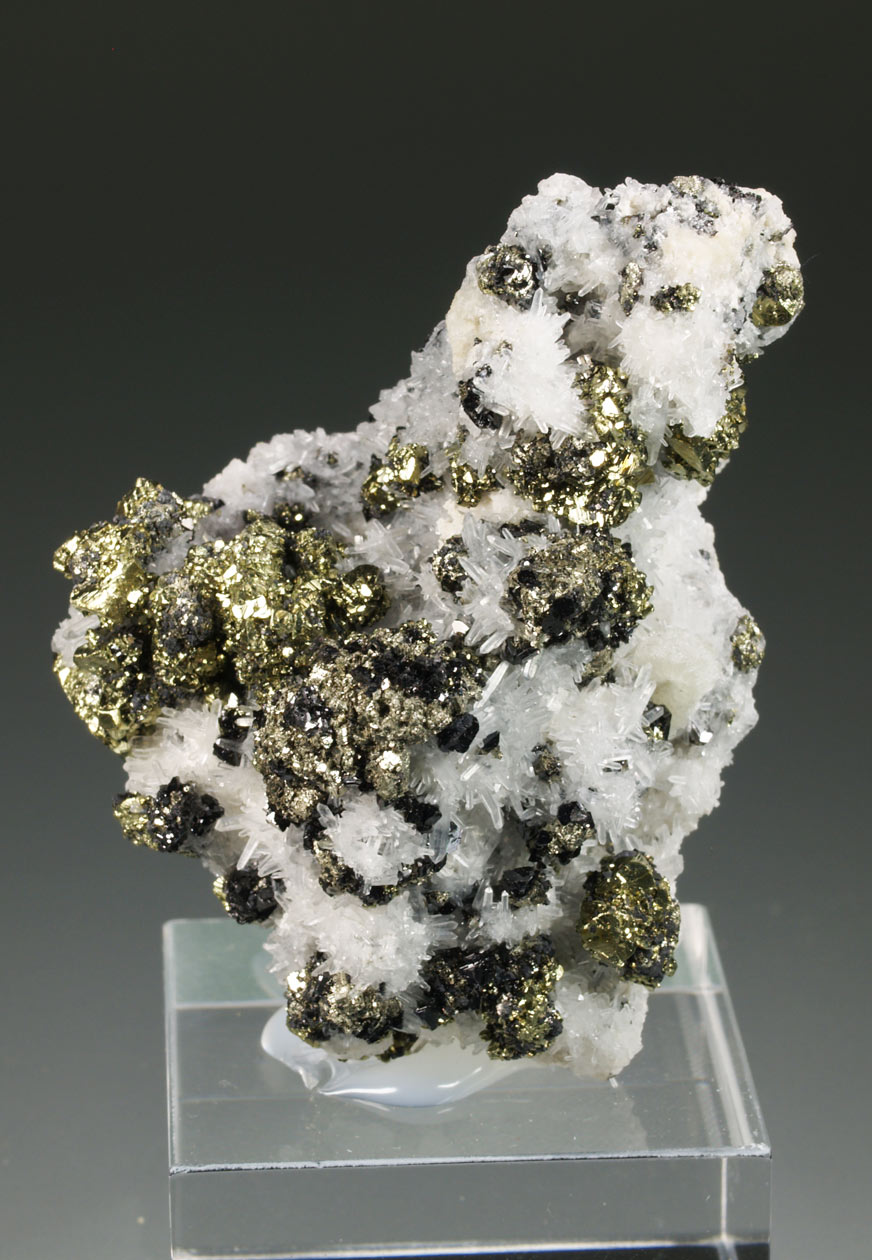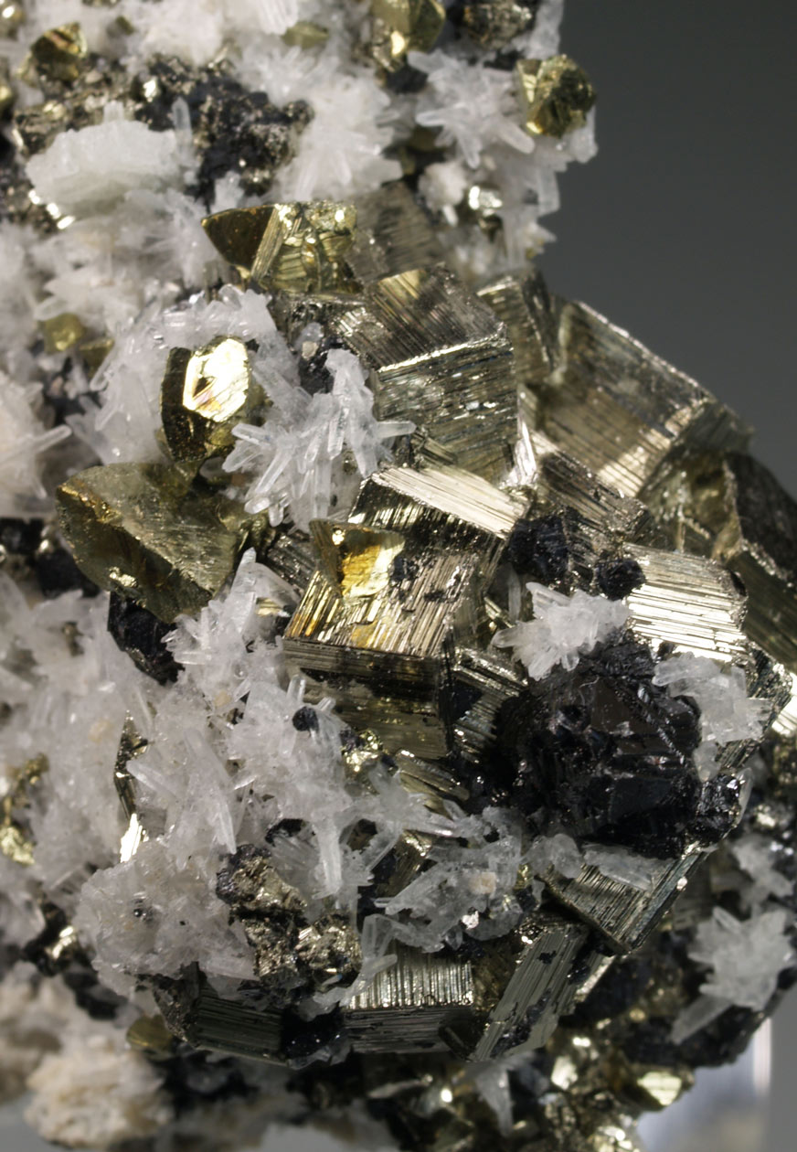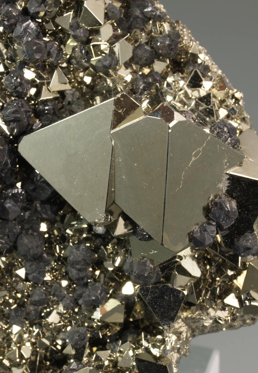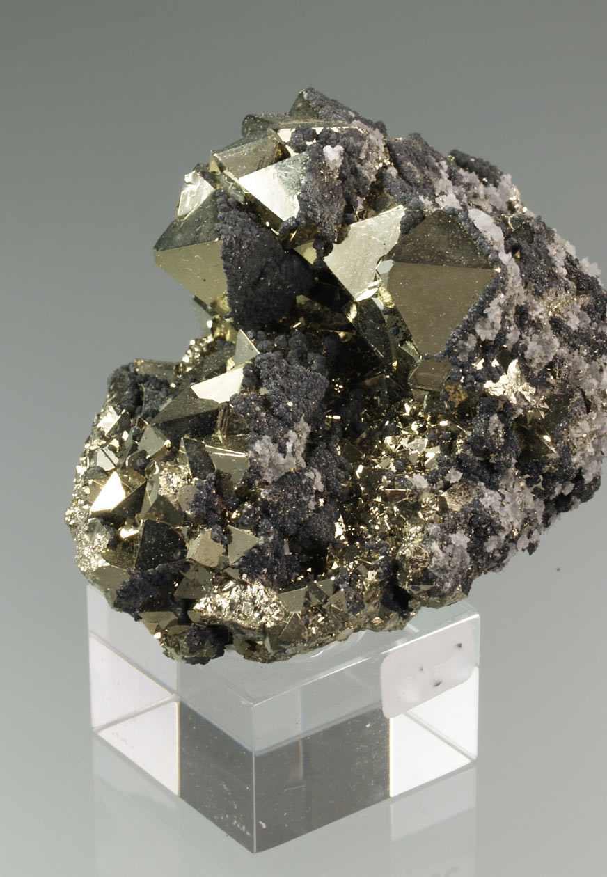 Excepcional ejemplar formado por diversos cristales de pirita, destacando el tamaño de uno de ellos, Con un brillo muy notable. Observamos interesantes crecimientos cristalográficos que nos muestran las caras del cubo con estriaciones triglifas y las caras del octaedro lisas. Se acompaña de pequeños y brillantes cristales de cuarzo y esfalerita. Una pieza muy interesante tanto desde el punto de vista estético como cristalográfico. De esta mina procede la base del "Balón de Oro" que se otorga cada año al mejor jugador del mundo.