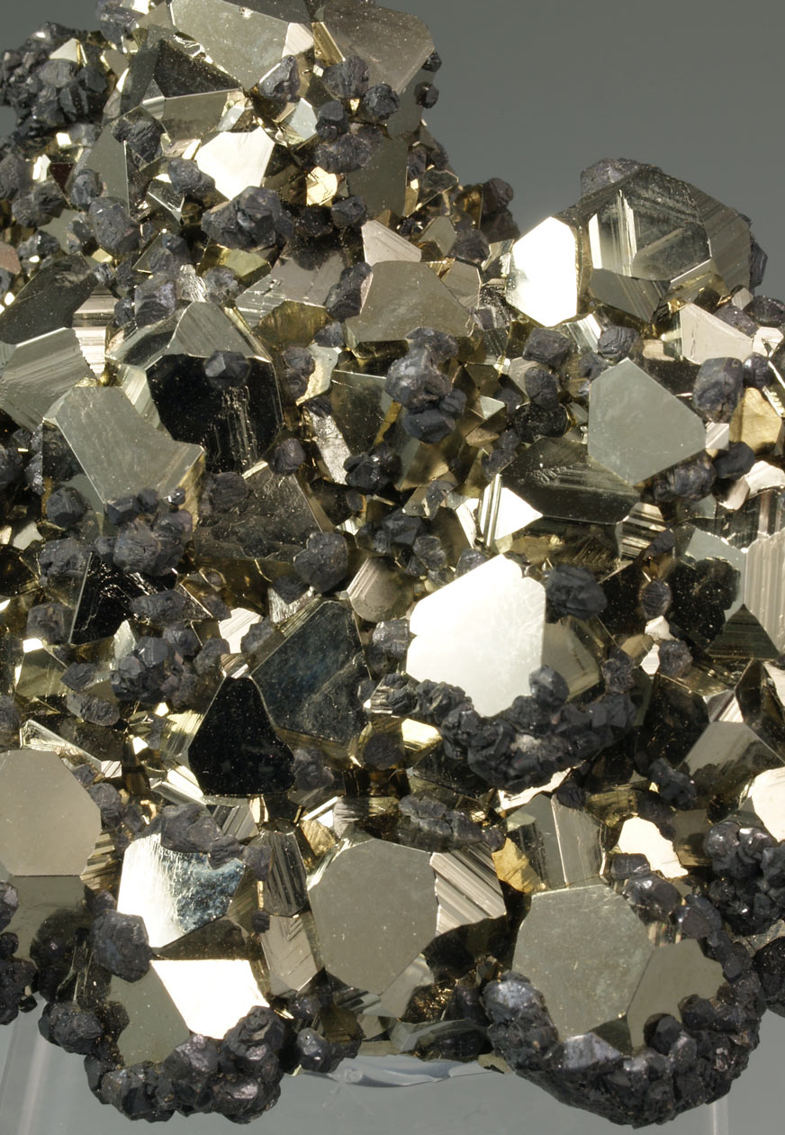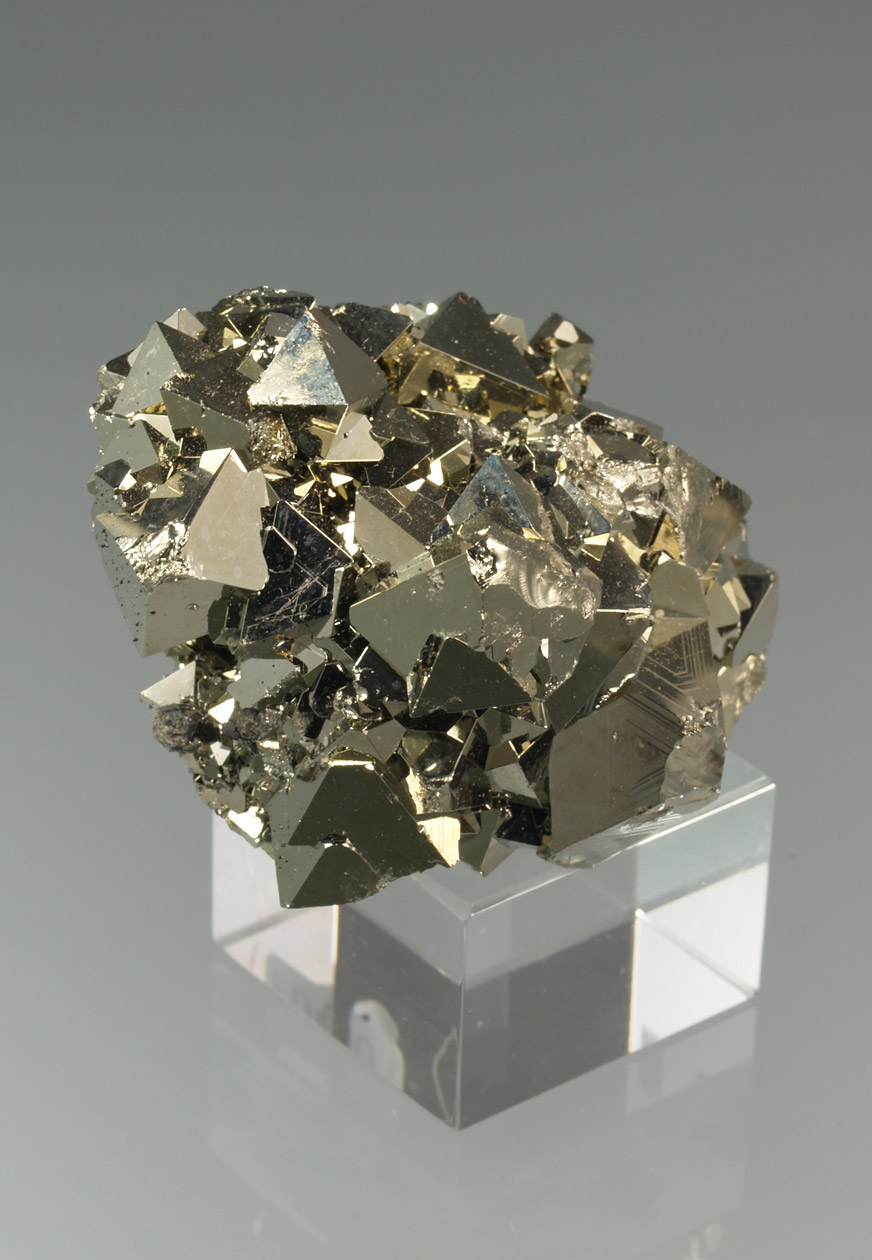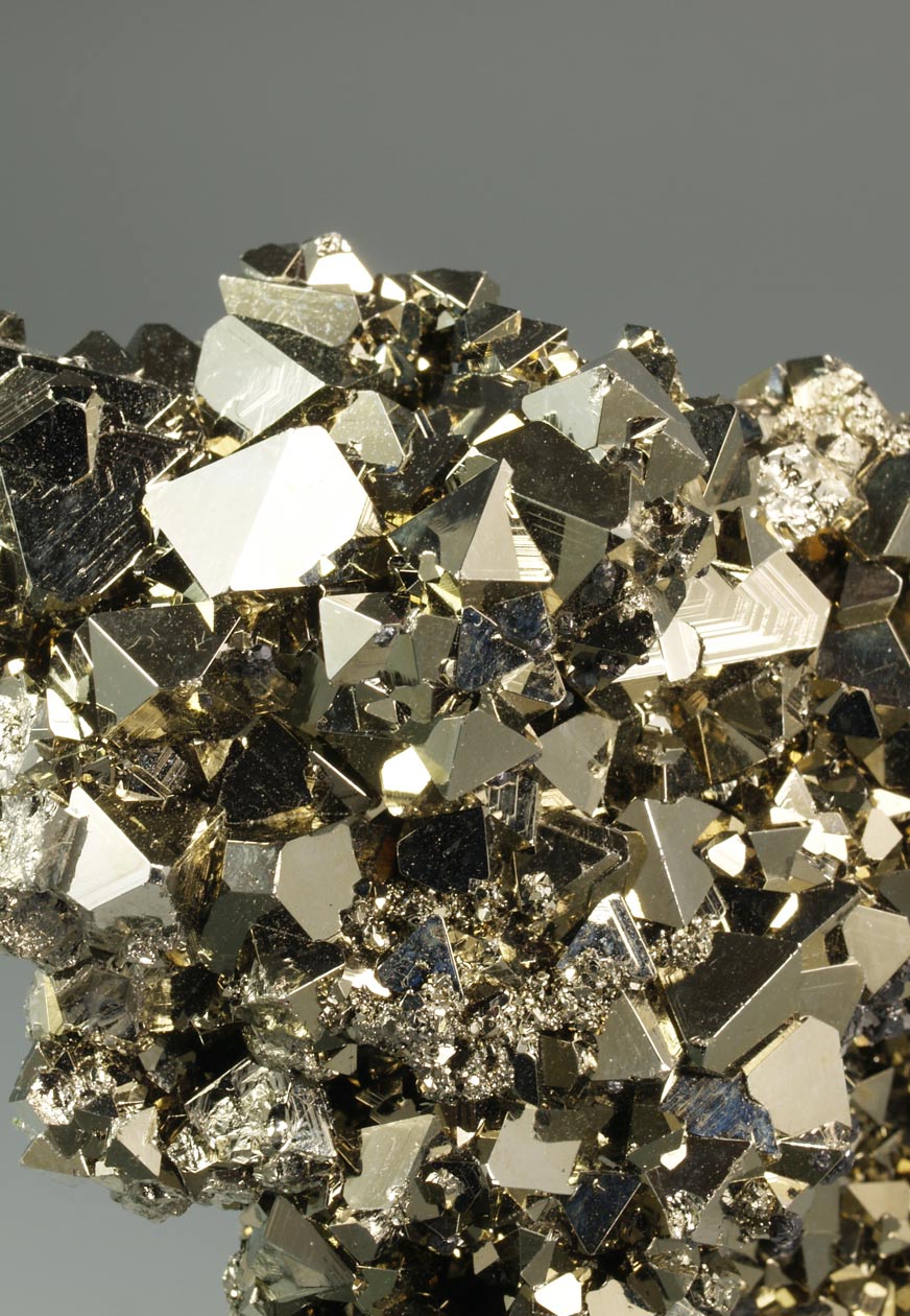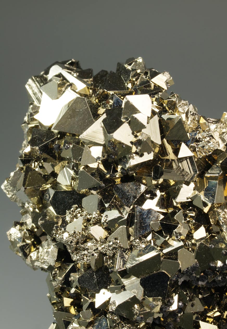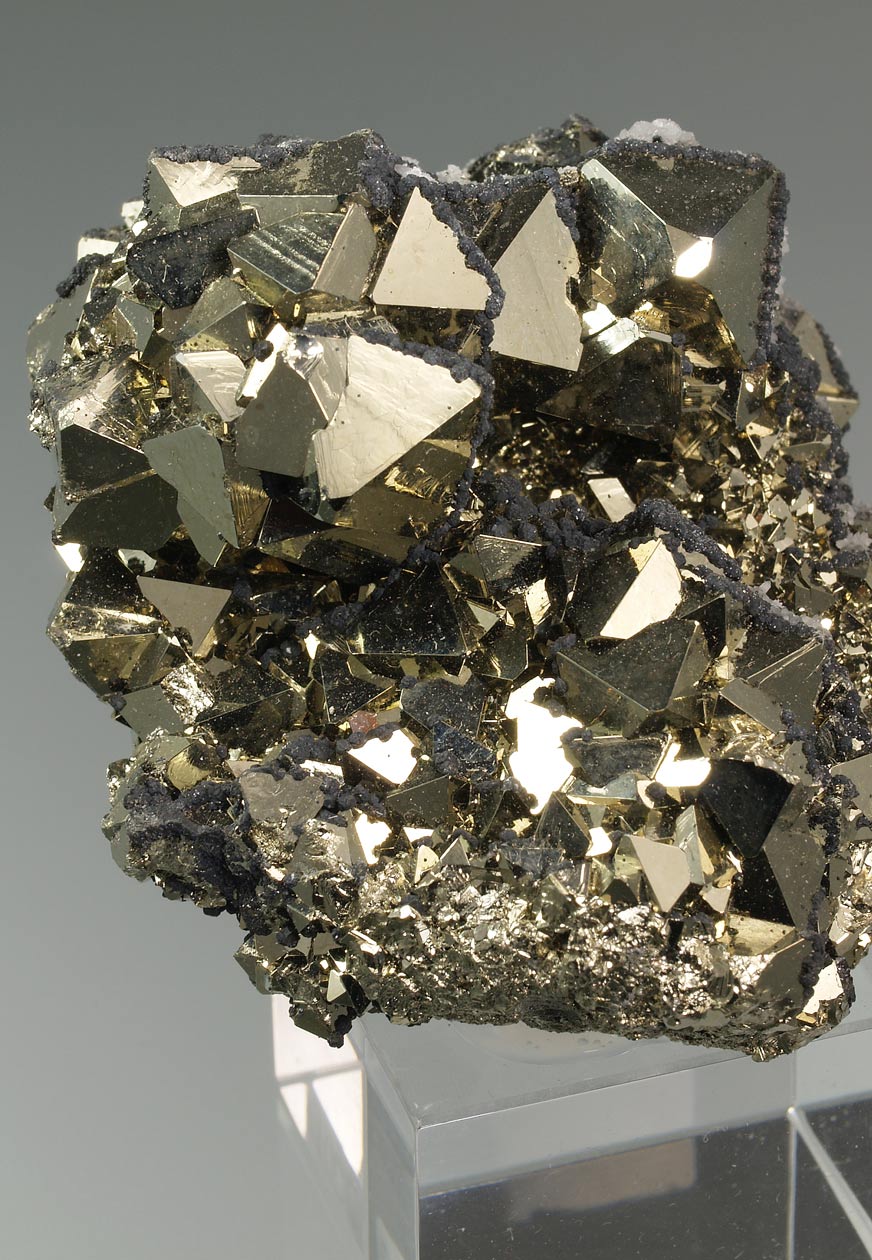 Nutrido grupo de cristales octaédricos de pirita, con un brillo excepcional y con caras y aristas muy definidas. De esta mina procede la base del "Balón de Oro" que se otorga cada año al mejor jugador del mundo.