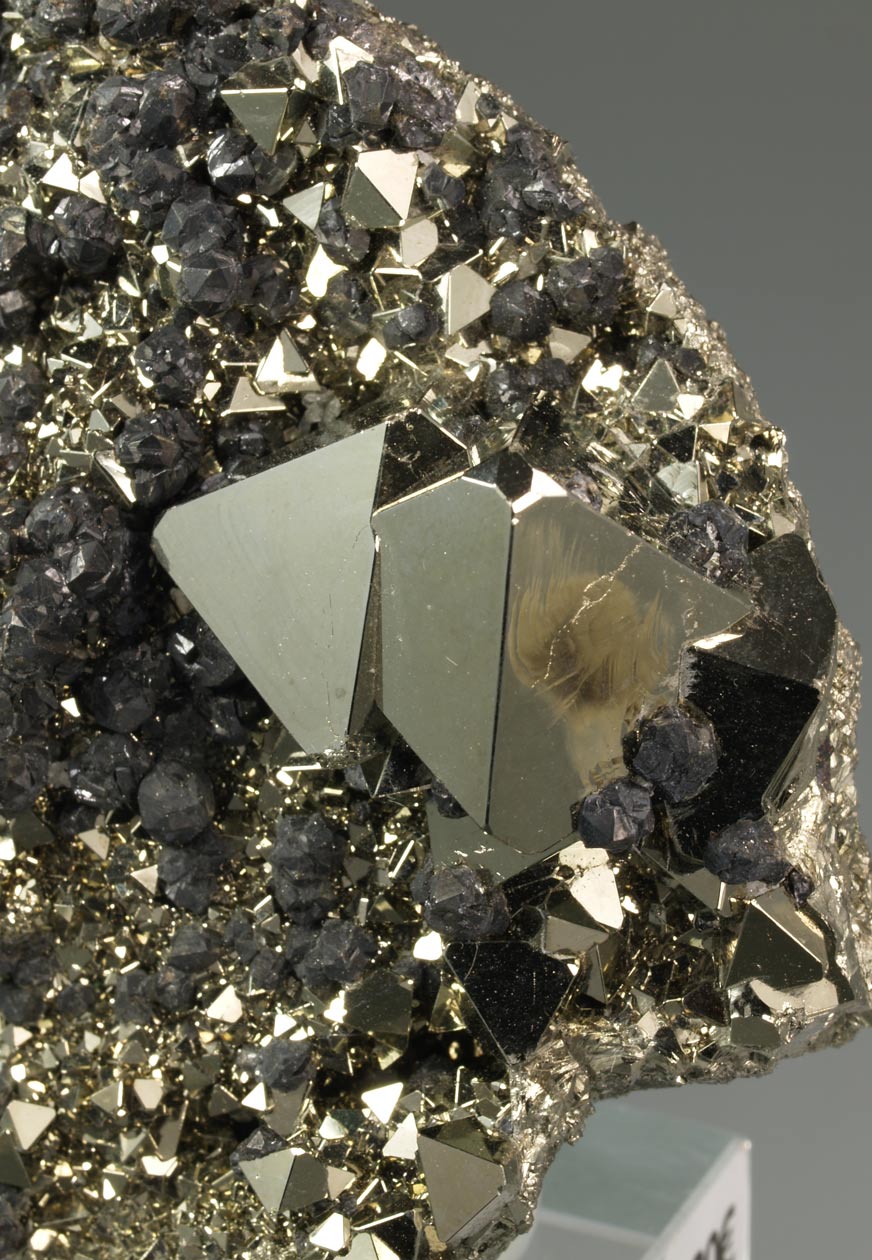 Grupo de cristales pentadodecaédricos de pirita sobre una matriz de pequeños cristales de cuarzo y de tennantita. Los cristales de pirita muestran las caras estriadas y un brillo es excepcional. En alguno de los cristales pentadodecaédricos de pirita se puede apreciar las aristas truncadas por las caras de cubo y los vértices por las del octaedro.