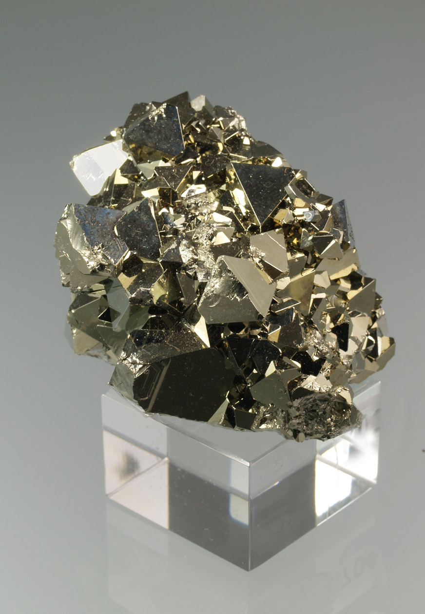Grupo de cristales de pirita interpenetrados, con un brillo excepcional. Este ejemplar destaca por sui compleja cristalografía, con formas del cubo, con estriados trigifos, y vértices ricos en caras probablemente trapezoédricas. Una pieza para disfrutar de su estudio, de las que me gustan...