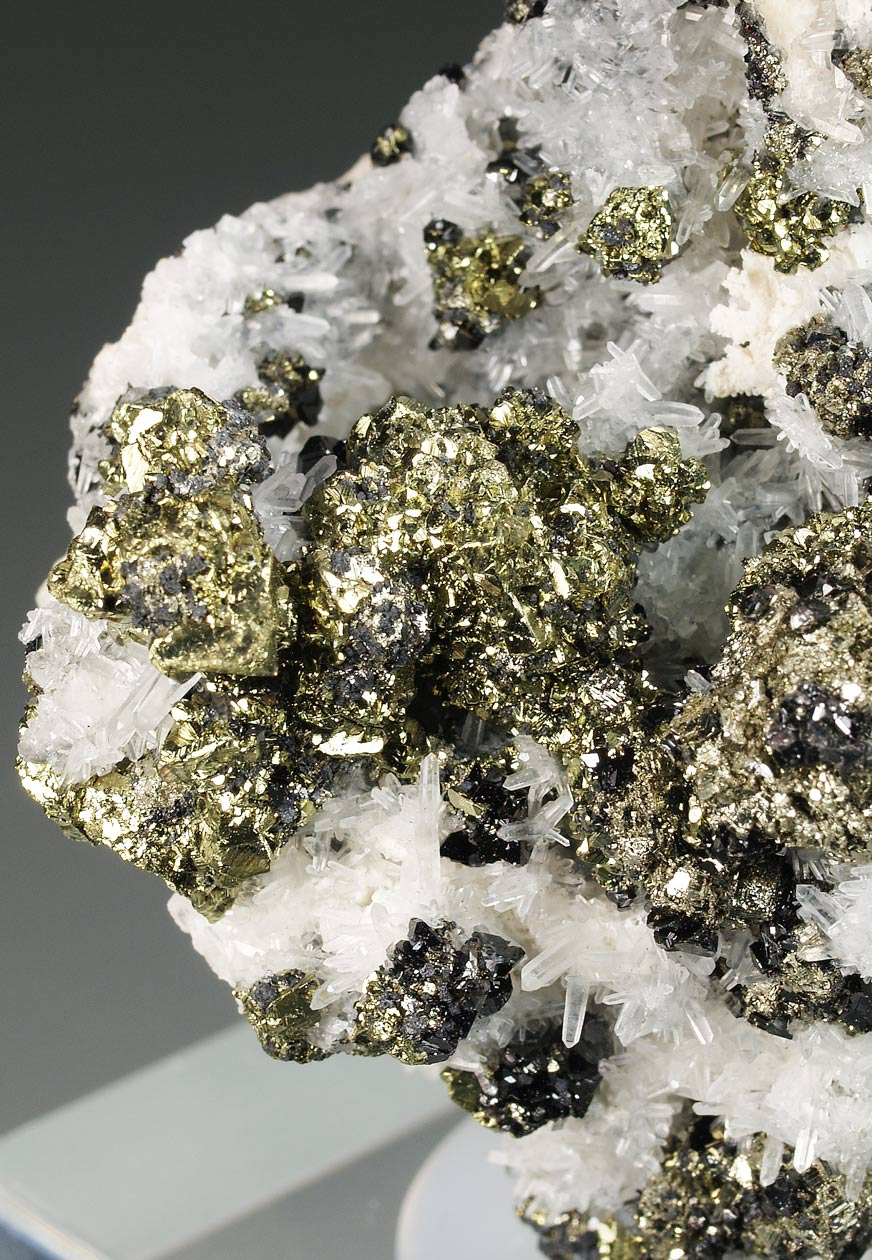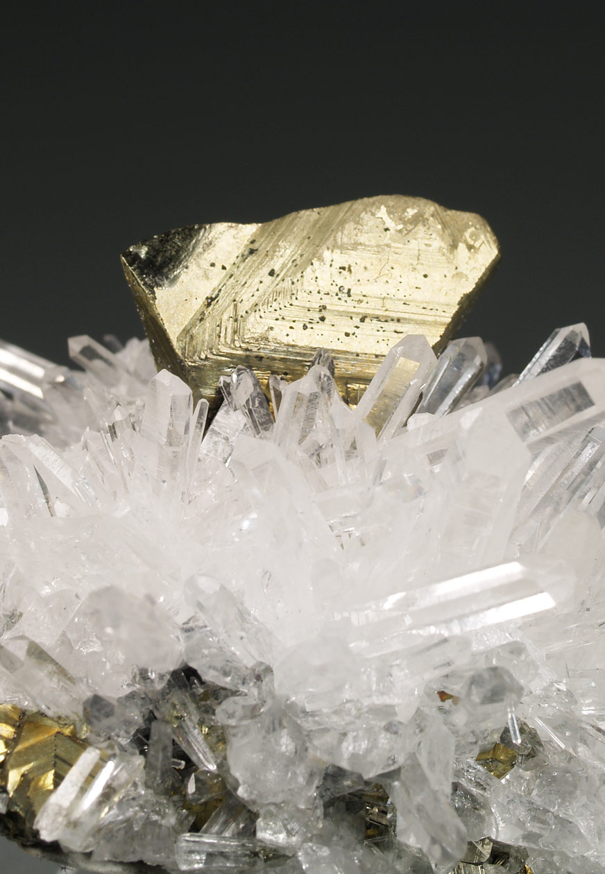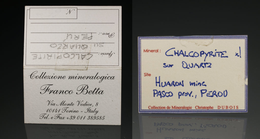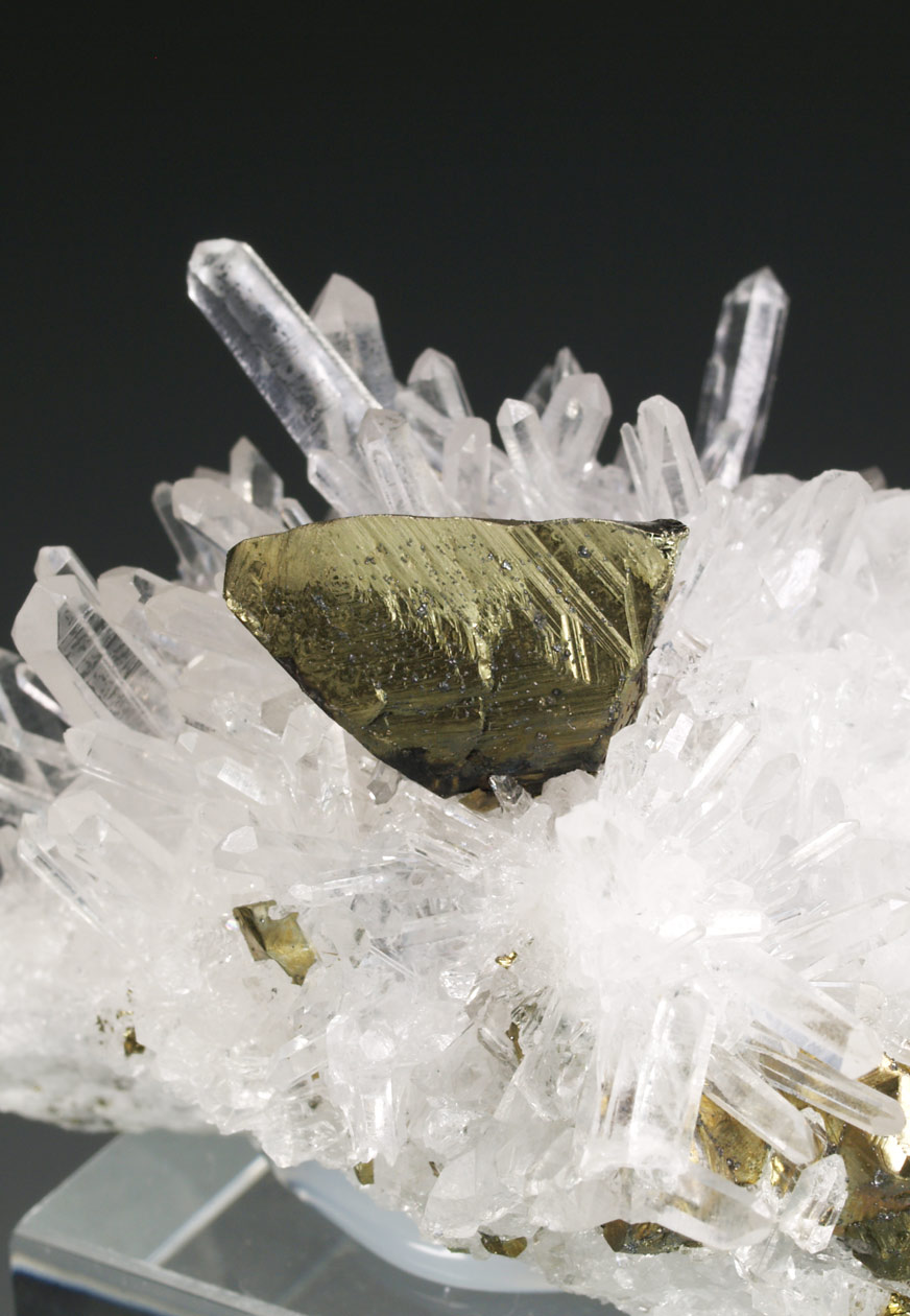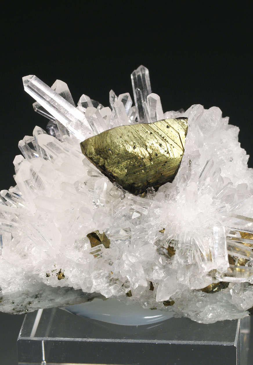 Cristal idiomórfico de calcopirita, de un tamaño considerable, con caras y aristas definidas. Algunas muestran crecimientos escalonados. Se dispone de forma muy aérea sobre una matriz formada por cristales de cuarzo hialino, transparentes, brillantes y elongados. Procede de la colección del ingeniero Franco Betta (Torino, Italia).