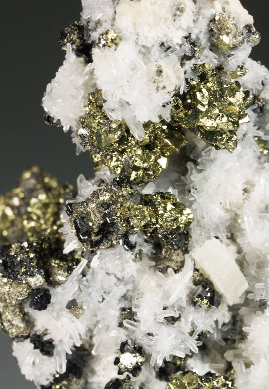 Ejemplar muy estético formado por numerosos cristales de calcopirita, brillantes y con formas tetraédricas. Se acompañan de numerosos cristales cúbicos de pirita, con las caras estriadas. También cristales de esfalerita negra. Desatacan algunos cristales hexagonales, parcialmente corroídos, de fluorapatito, fluorescentes bajo la luz UV-OL. Una pieza brillante para observar bajo aumento.