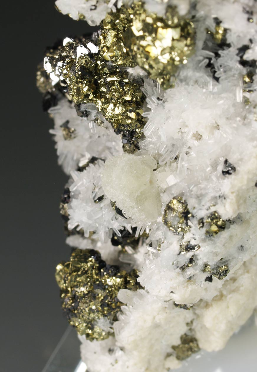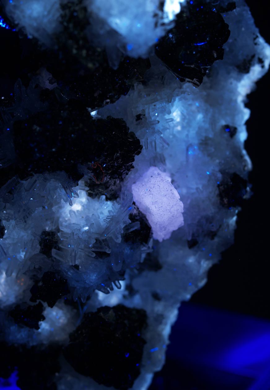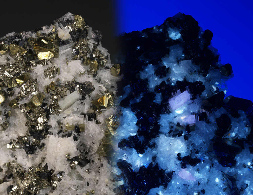 Ejemplar muy estético formado por numerosos cristales de calcopirita, brillantes y con formas tetraédricas. Se acompañan de cristales de esfalerita. Desatacan algunos cristales hexagonales, parcialmente corroídos, de fluorapatito, fluorescentes bajo la luz UV-OL. Una pieza brillante para observar bajo aumento.