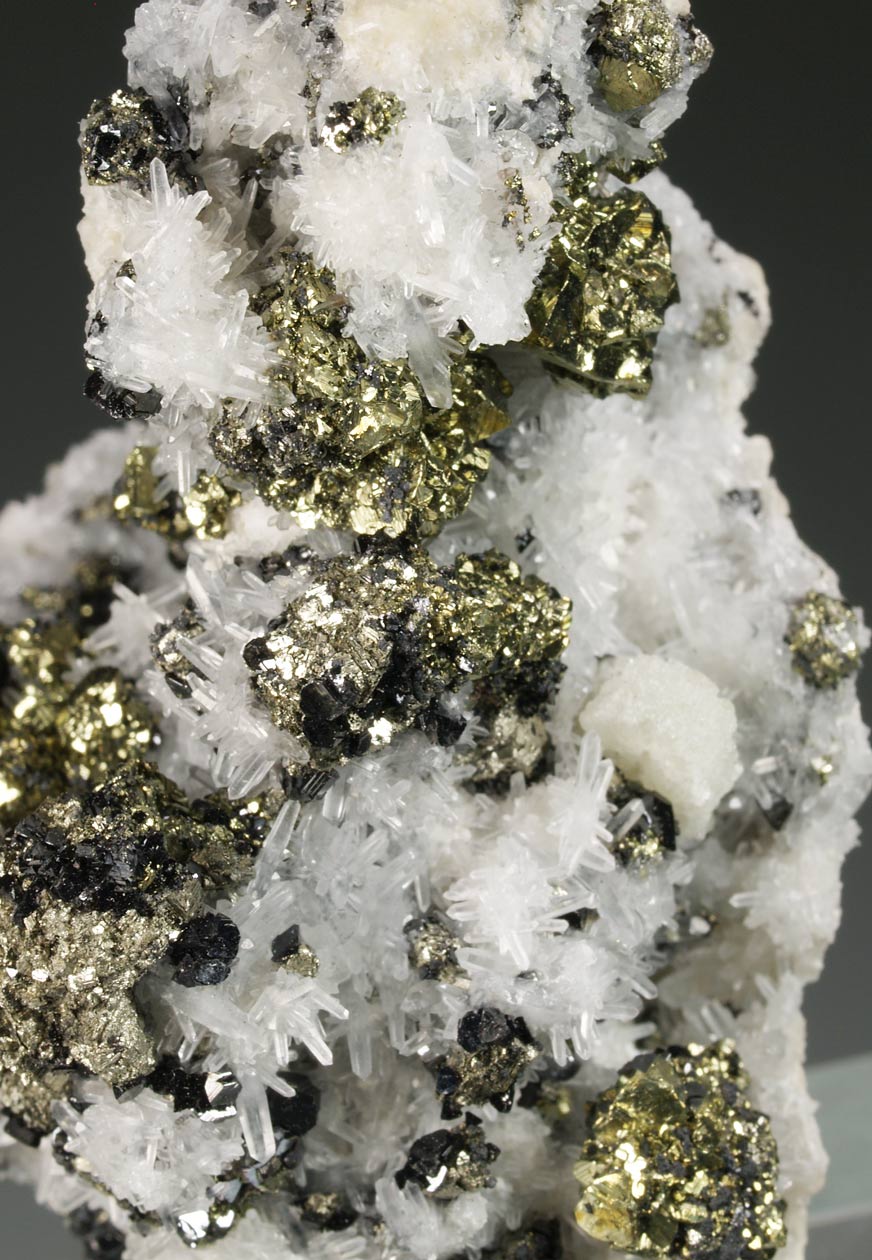 Nutrido grupo de cristales cubo-octaédricos de pirita, con un brillo excepcional y con caras y aristas muy definidas. Se acompaña de esfalerita y cuarzo. De esta mina procede la base del "Balón de Oro" que se otorga cada año al mejor jugador del mundo. Muy buen tamaño y notable calidad.