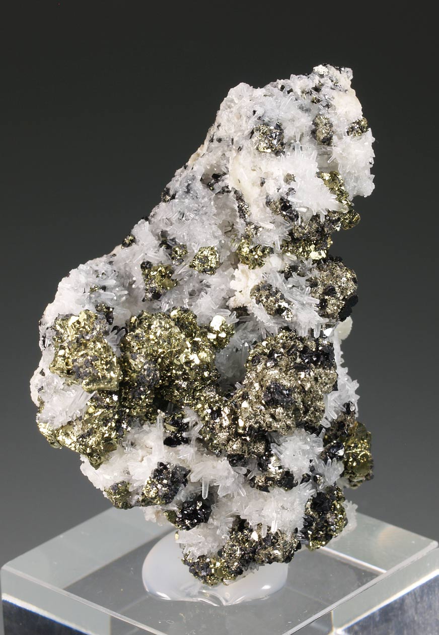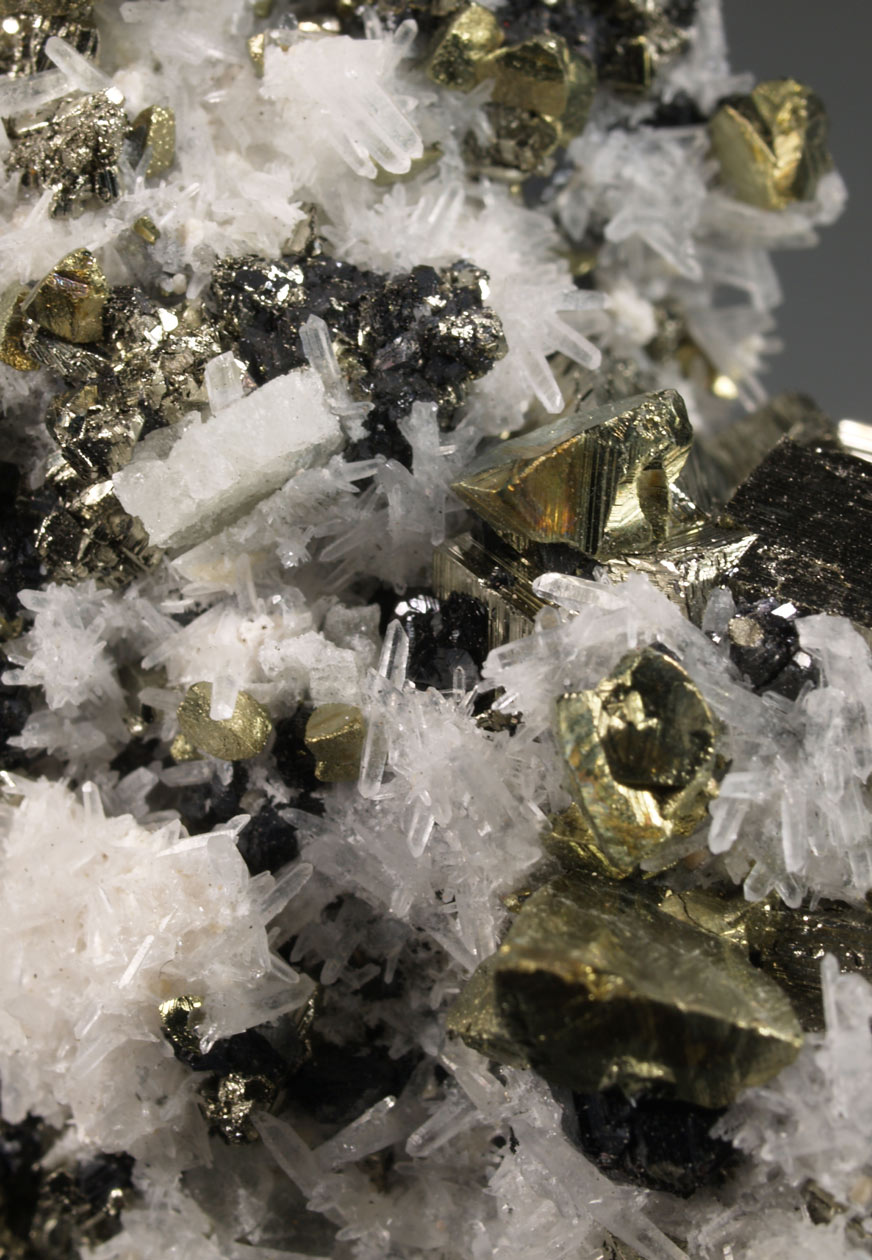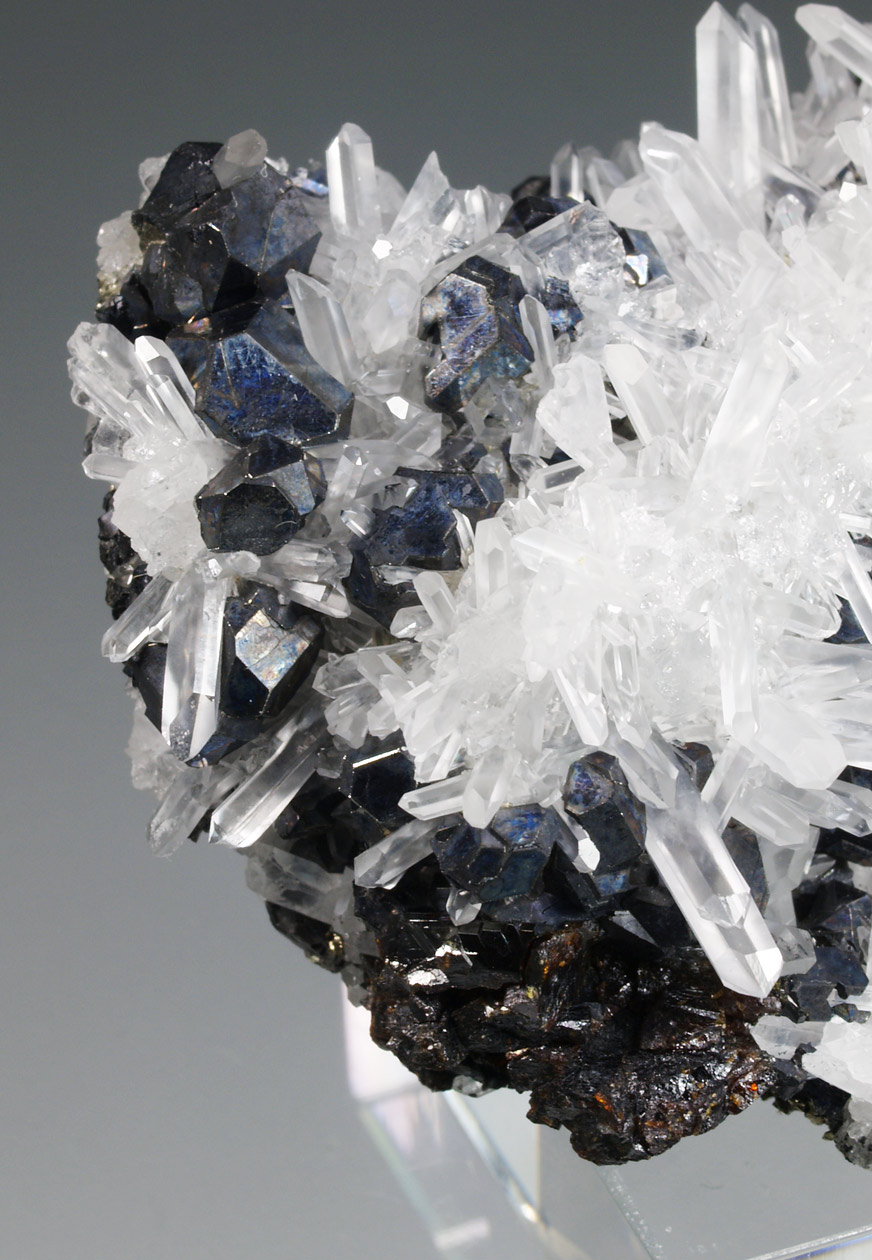 Interesante ejemplar que nos muestra una matriz tapizada de cristales de cuarzo hialino. Se acompañan de cristales de galena, facetados, con caras del cubo y del octaedro, y aristas muy definidas. Se acompaña de cristales de esfalerita, más complejos, pero facetados también. Un ejemplar para observar con la lupa de medio aumento.