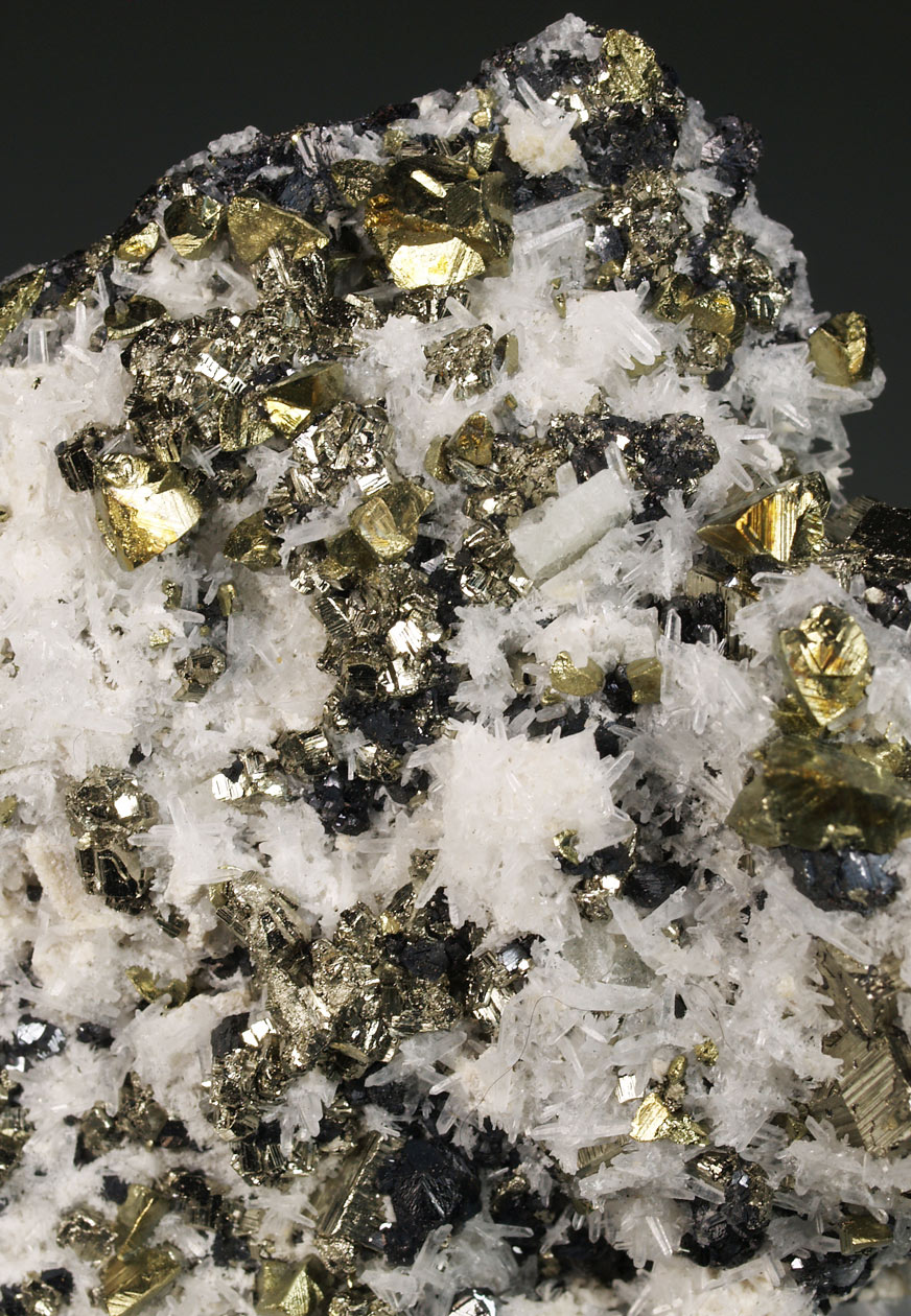 Nutrido grupo de cristales octaédricos de pirita, con un brillo excepcional y con caras y aristas muy definidas. Se acompaña de esfalerita y cuarzo. De esta mina procede la base del "Balón de Oro" que se otorga cada año al mejor jugador del mundo.