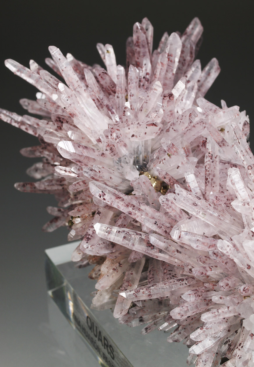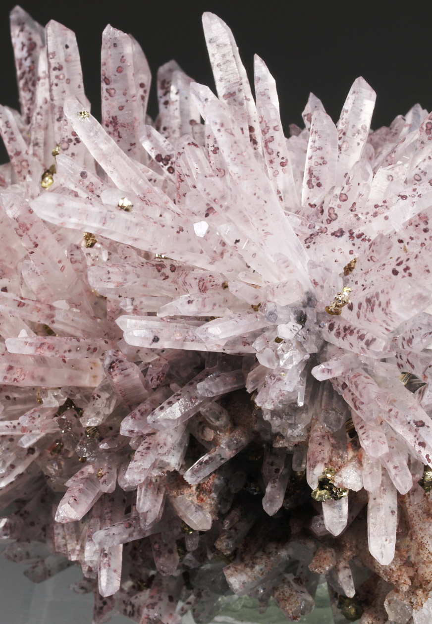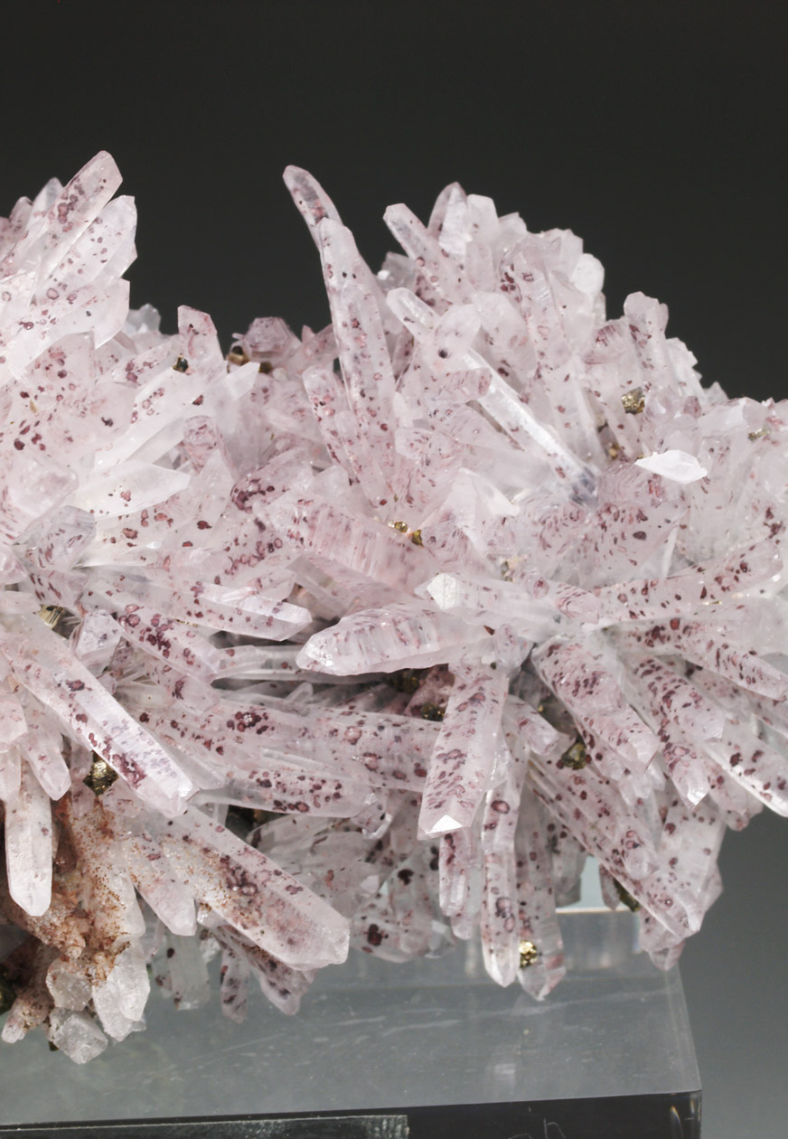 Excepcional ejemplar de cuarzo, con prismas alargados, formando agregados divergentes, transparentes a translúcidos. Con una tonalidad ligeramente rojiza debido a la presencia de hematites que salpica los cristales. Se acompaña de pequeños cristales de pirita y calcopirita. Un ejemplar de vitrina de esta clásica localidad peruana.