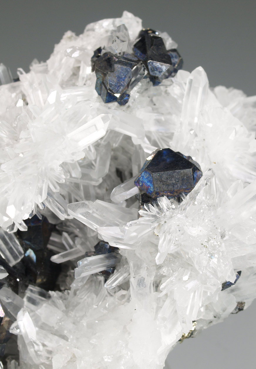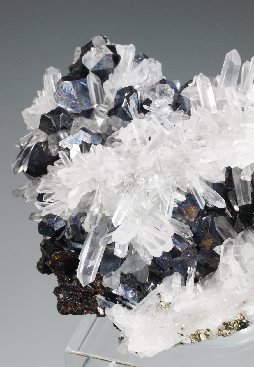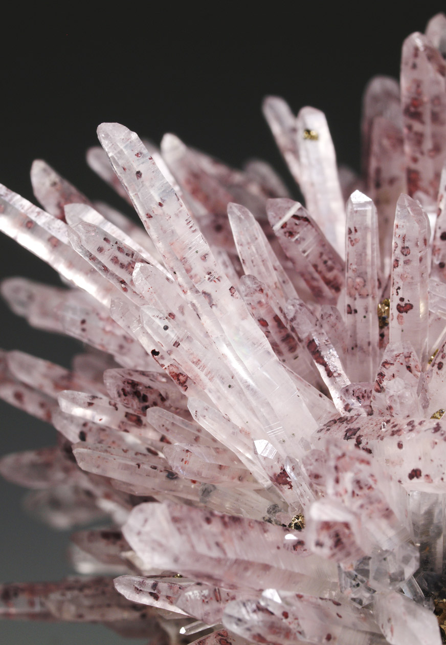 Excepcional ejemplar de cuarzo, con prismas alargados, formando agregados divergentes, transparentes a translúcidos. Con una tonalidad ligeramente rojiza debido a la presencia de hematites que salpica los cristales. Se acompaña de pequeños cristales de pirita y calcopirita. Un ejemplar de vitrina de esta clásica localidad peruana.