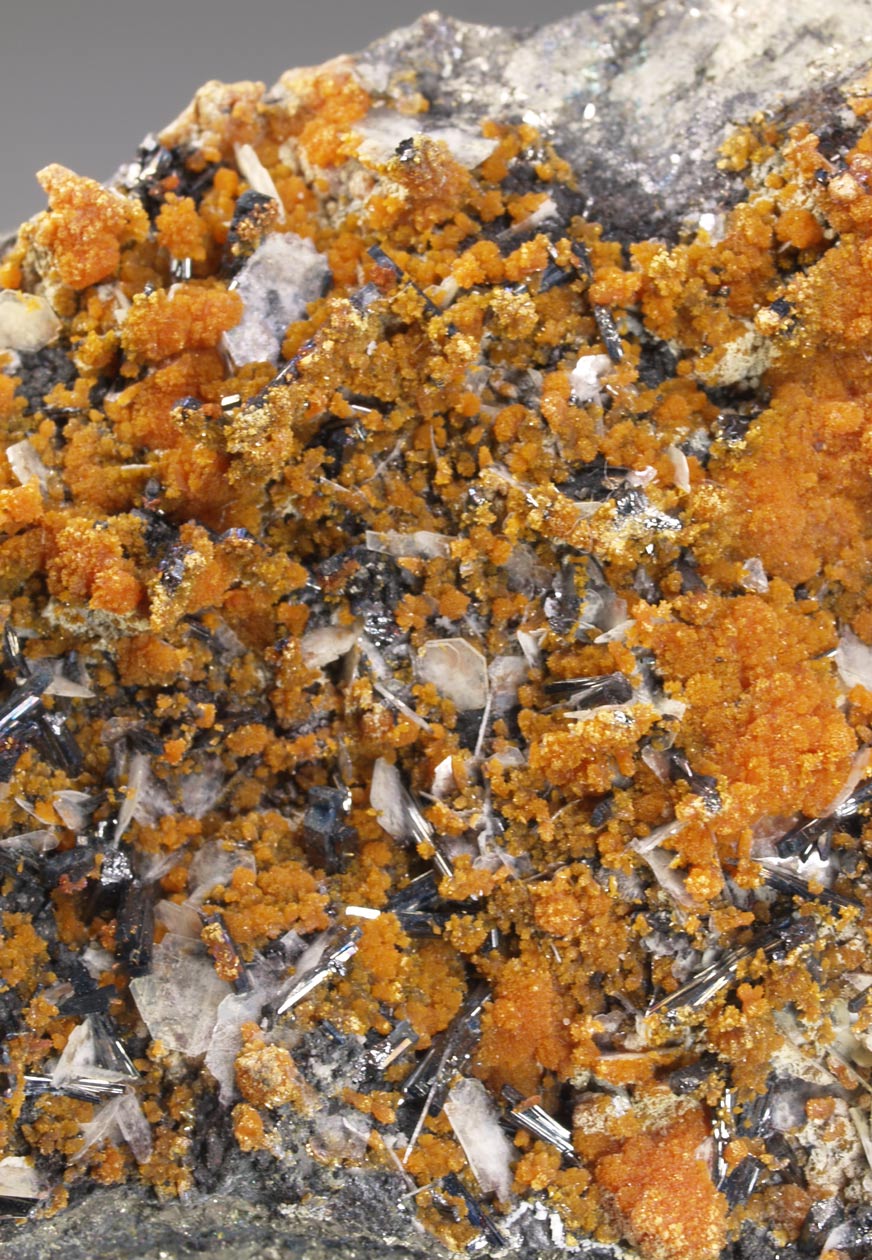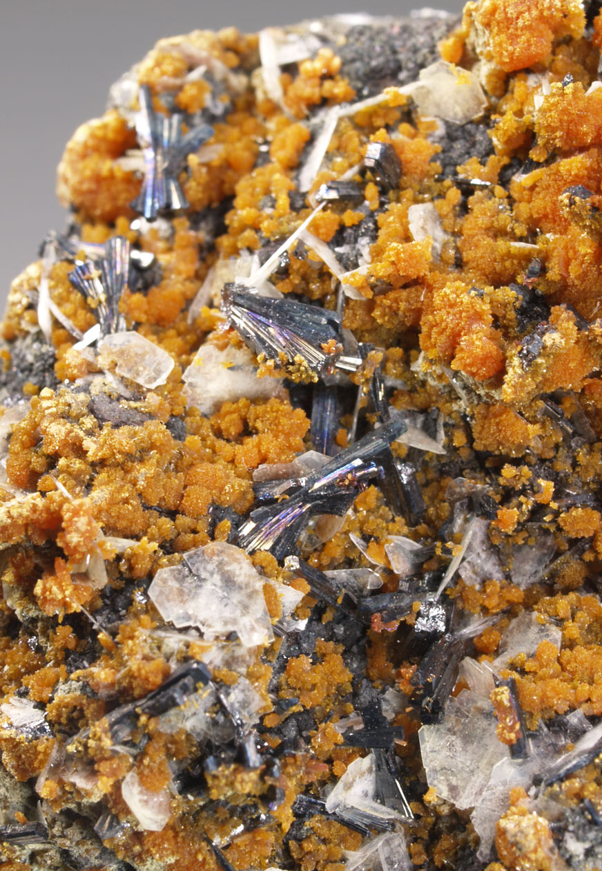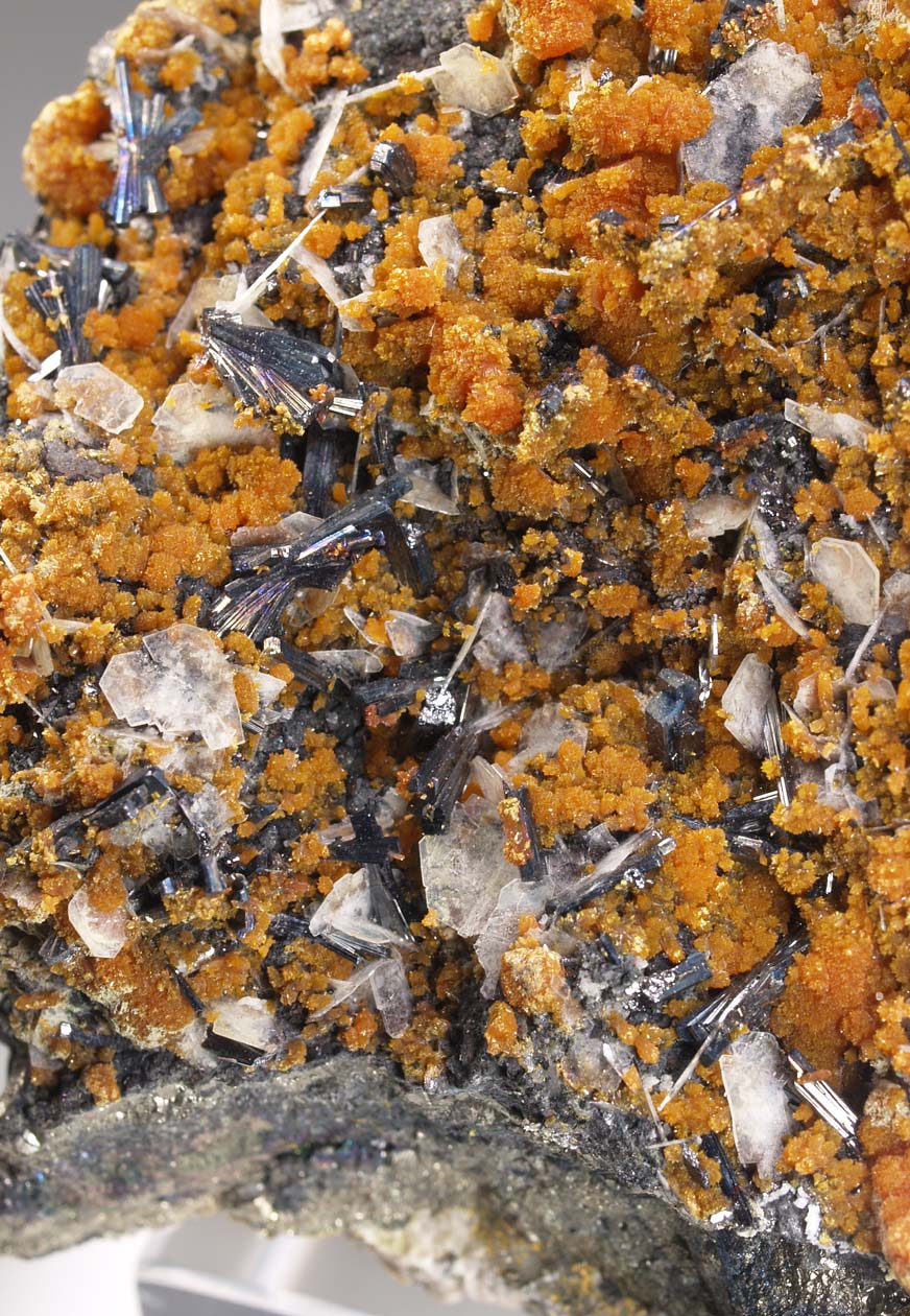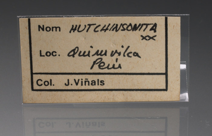 Sobre una matriz de sulfuros polimetálicos, parcialmente recubiertos por estéticos agregados de cristales anaranjados de rejalgar, se disponen numerosos agregados de cristales de hutchinsonita, una interesante sulfosal con talio, formando gavillas; muy definidos y con brillo. Se acompaña de cristales tabulares de barita. Ya no se ven muchos de estos ejemplares en el mercado.
