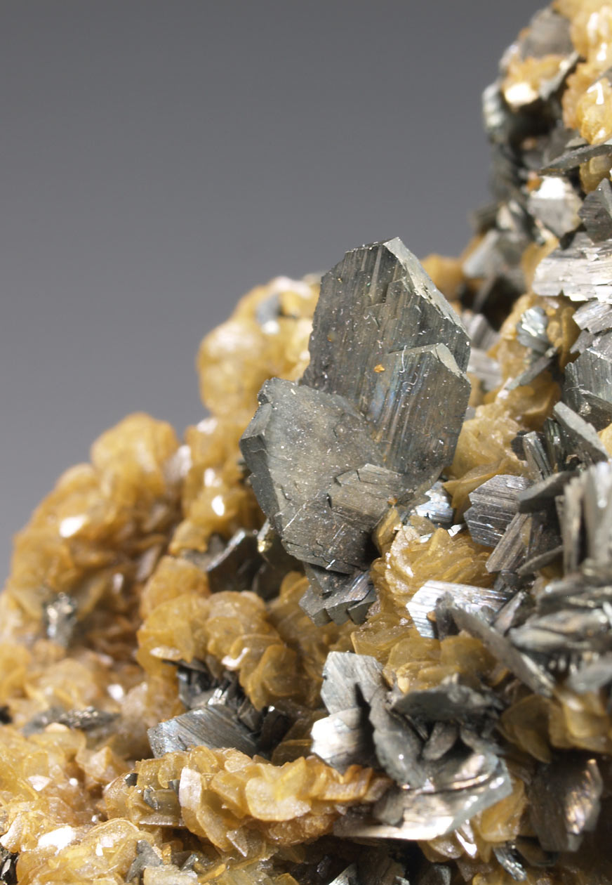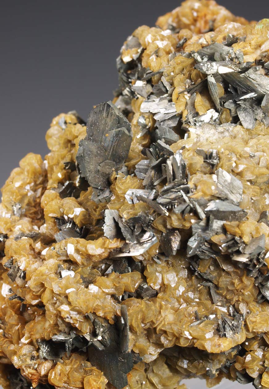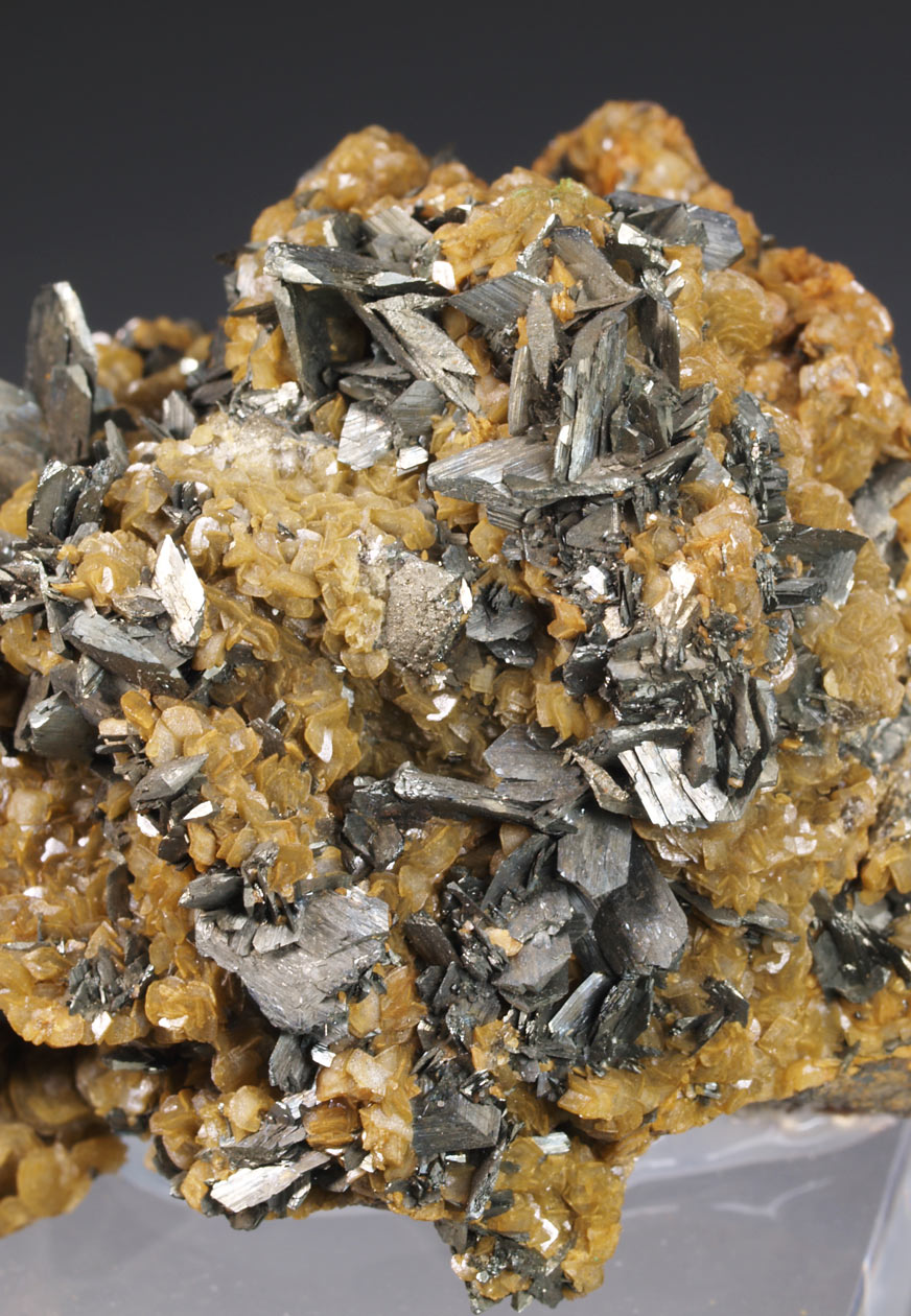 Un ejemplar de arsenopirita muy estético, de color dorado pálido a plateado con una ligera iridiscencia y brillo metálico, con varios cristales interpenetrados, todos muestran estriaciones complejas y aristas serradas. Acompañado de ferberita negra. Ejemplar de buen tamaño y calidad.
