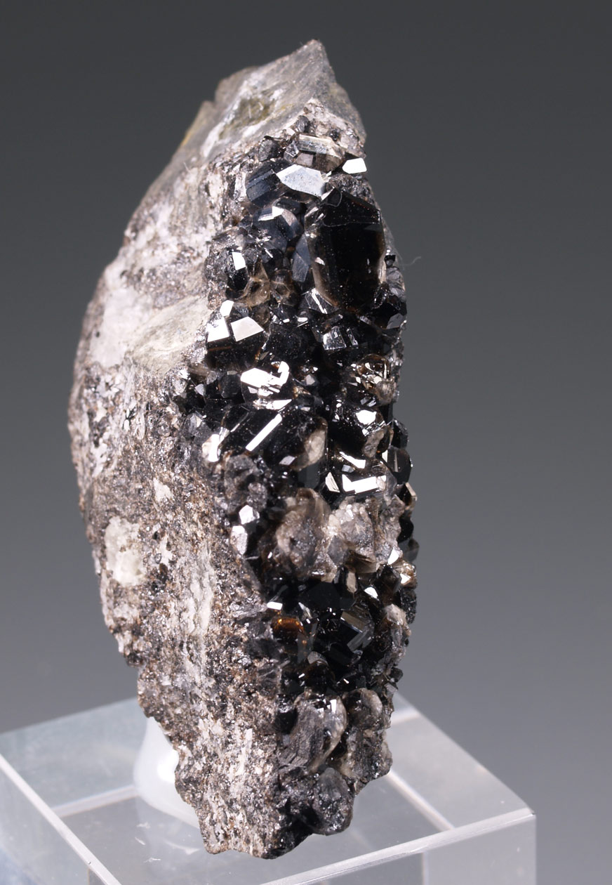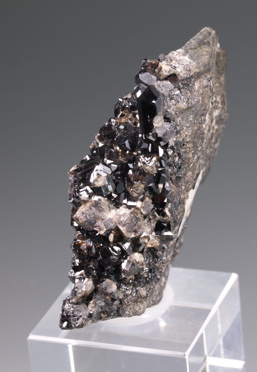Ejemplar muy rico en cristales de casiterita, muy brillantes, ricamente facetados y de intenso color marrón oscuro. El ejemplar ha sido reparado sin afectar al interés del ejemplar, desde mi punto de vista. Una pieza muy interesante de estas minas de estaño del distrito minero de St Agnes, un clásico inglés.