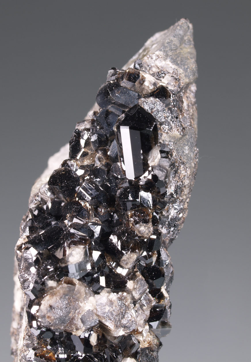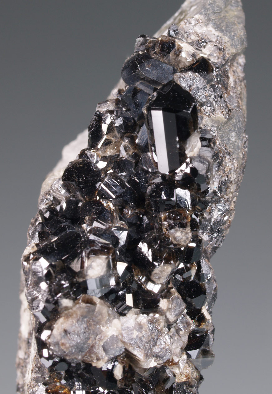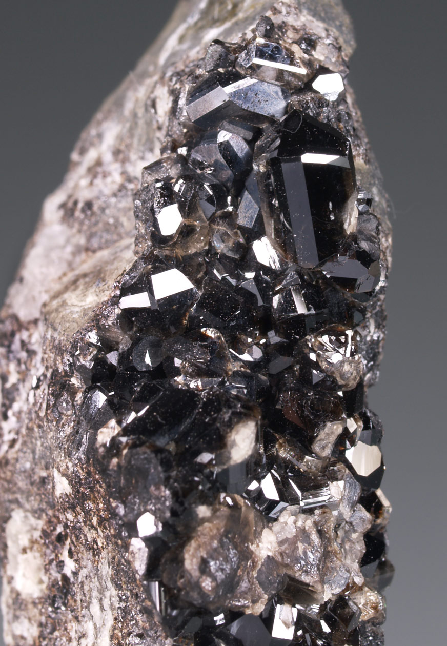 Estético ejemplar formado por numerosos cristales de casiterita, prismáticos,muy facetados, con un brillo excepcional y translúcidos, con luces meladas. Este un excelente ejemplar antiguo de la poco conocida mina Seal Hole de Cornualles. Espécimen muy vistoso y poco común en esta mina.
