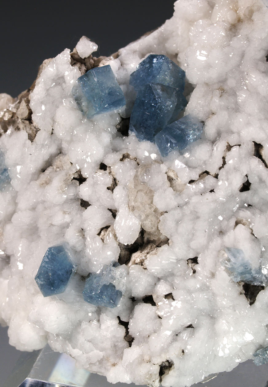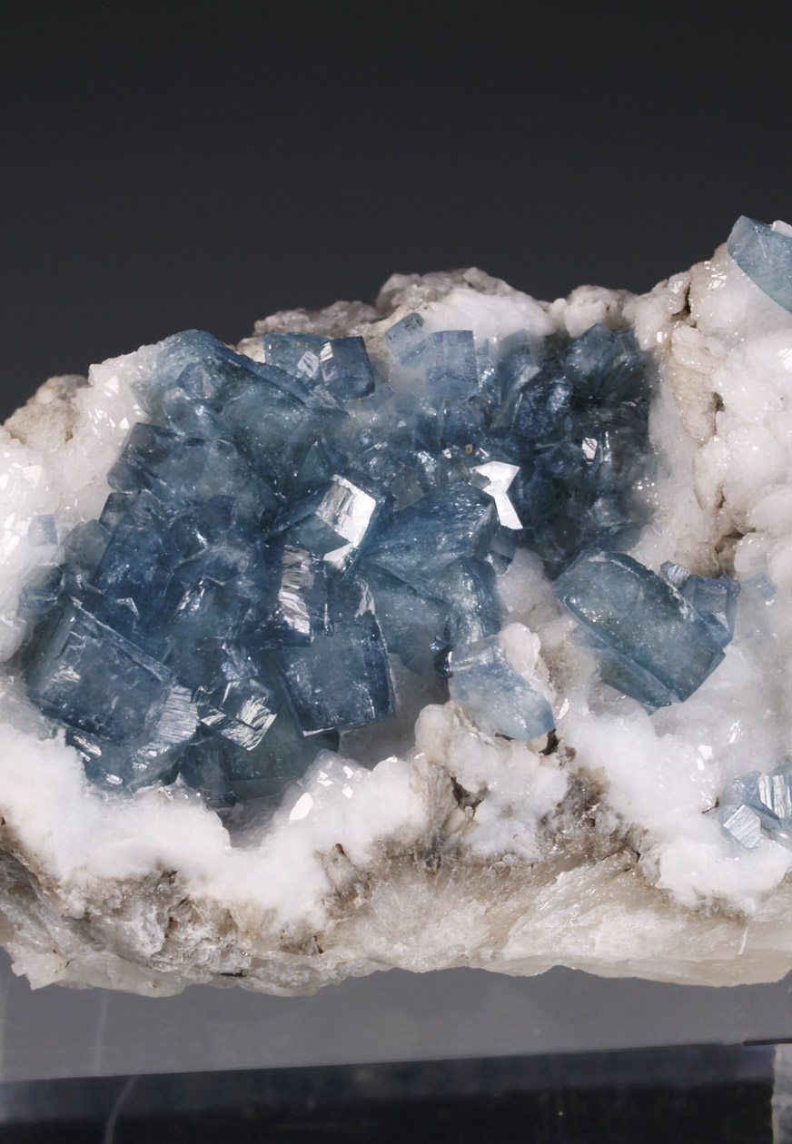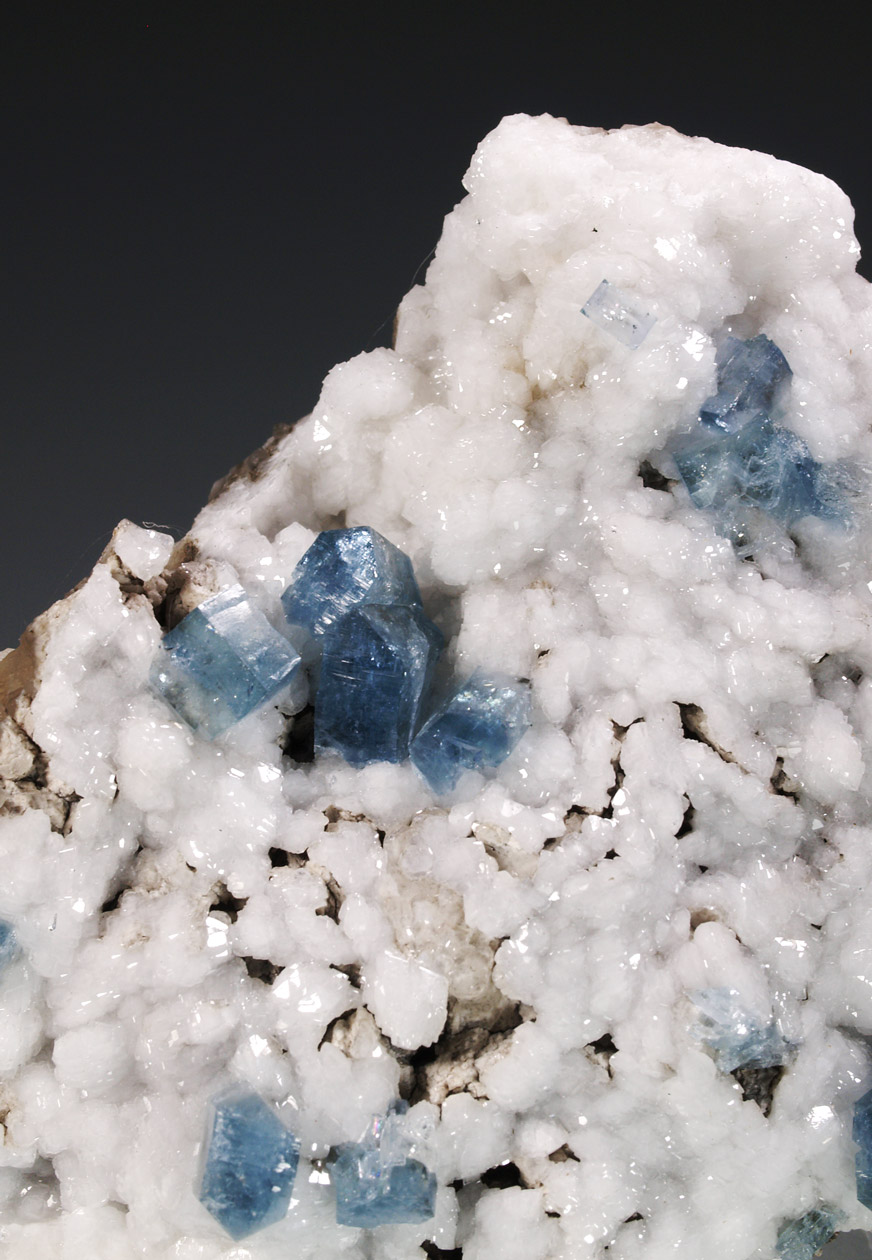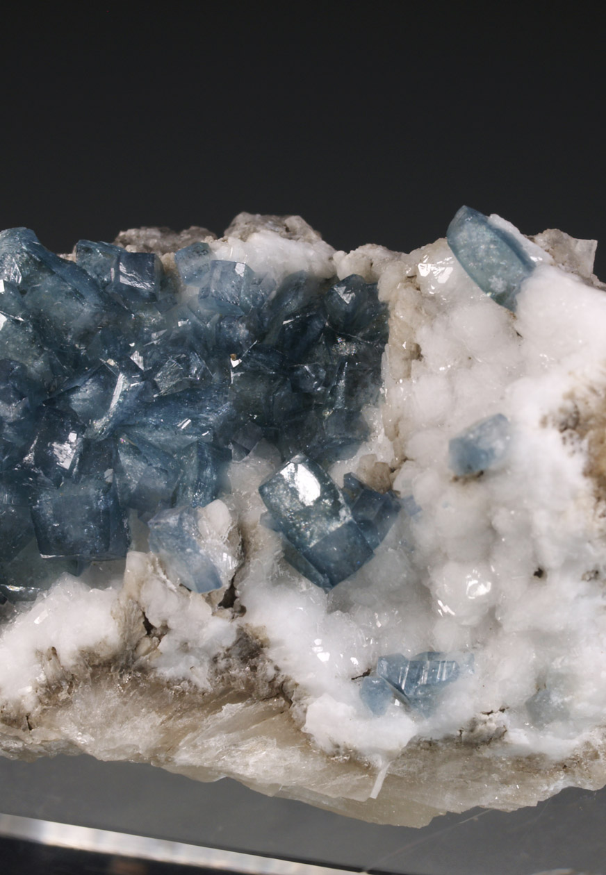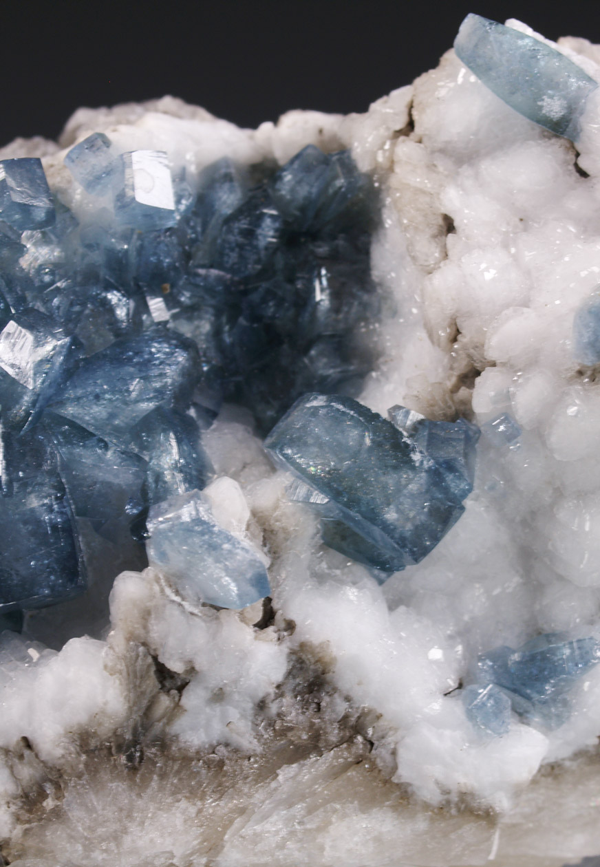 Brillantes, gemas, definidos cristales de celestina, de color azul aguamarina, que se disponen con un estético contraste sobre una matriz tapizada de cristales de colemanita. Una pieza de excepcional estética y de una localidad conocida por sus boratos, pero de la que pocos ejemplares de este tipo de han visto.