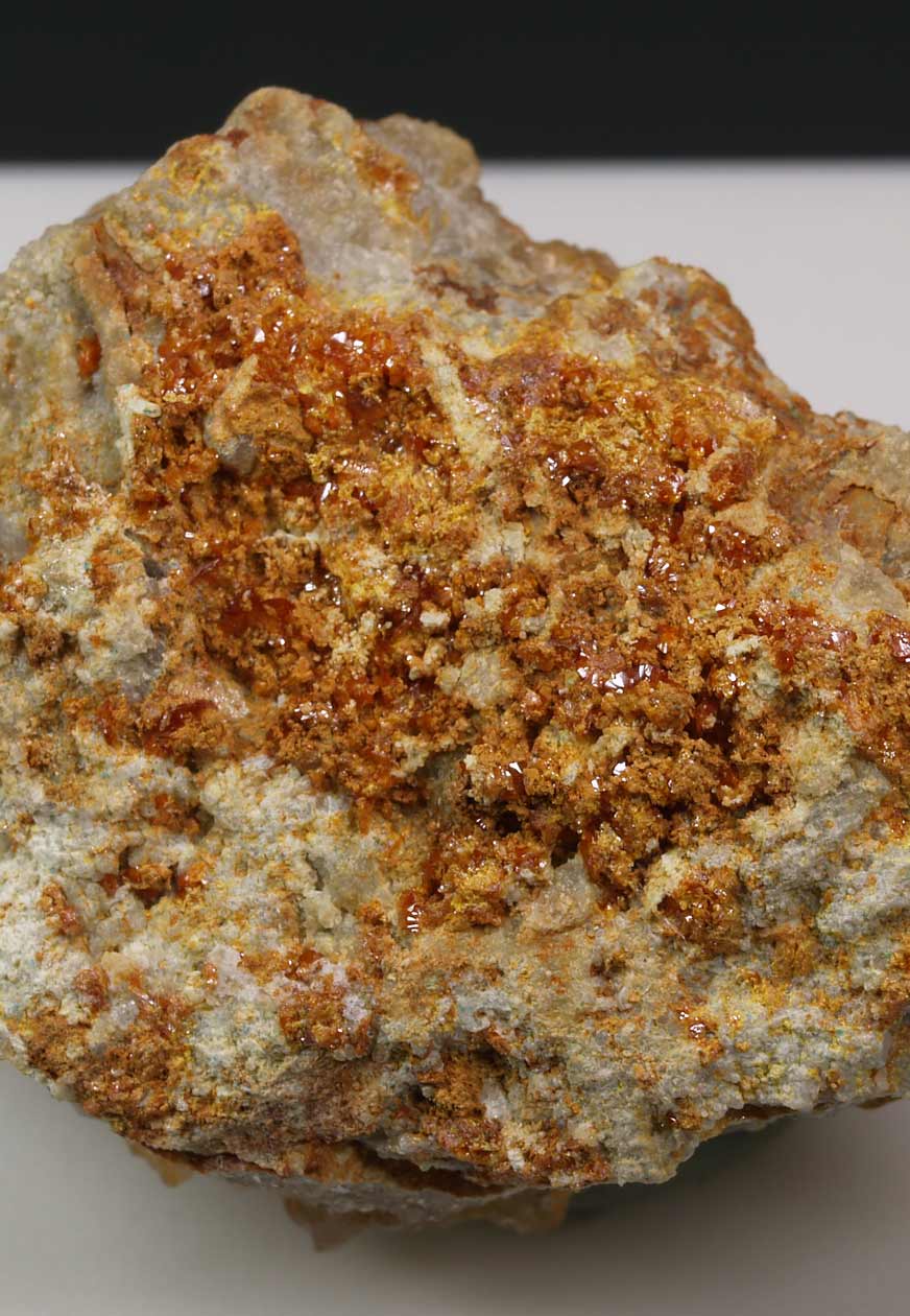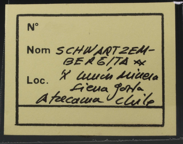 Nutrido grupo de cristales lenticulares anaranjados de schwartzembergita, analizada mediante SEM-EDS, se acompaña de seeligerita, de color amarillo claro. Ambos son cloroiodatos de plomo. Es uno de los varios ejemplares que trajo y estudió el recordado Dr. Joan Viñals (1951-2013) de su viaje a Chile en los primeros años de la década del 2000. Este lleva la etiqueta de Kucera.