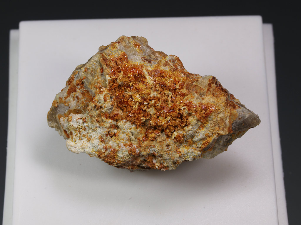 Ejemplar muy rico en grupos de cristales lenticulares de schwartzembergita, de color naranja, muy definidos y con transparencia. Se trata de un cloroyodato de plomo muy poco habitual, Pb₅H₂(IO₂)O₄Cl₃. Con lupa de aumento, se observan algunos agregados azulados de percylita (una mezcla de cloruros de plomo y cobre). Es uno de los ejemplares que el recordado Dr. Joan Viñals (1951-2013) trajo y estudió de su viaje a Chile, a principios de la década del 2000. Este ejemplar procede de la colección de E. Nicolau (Barcelona).