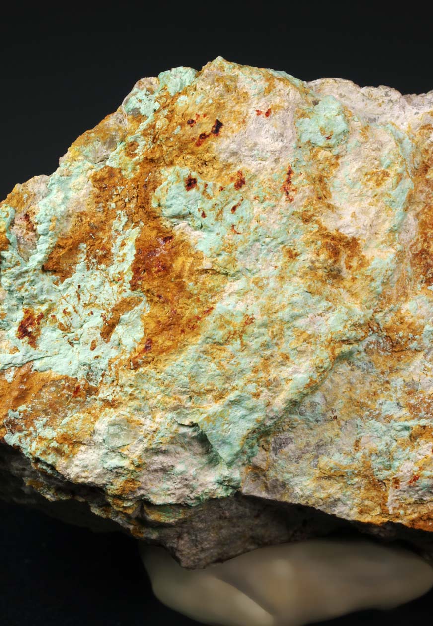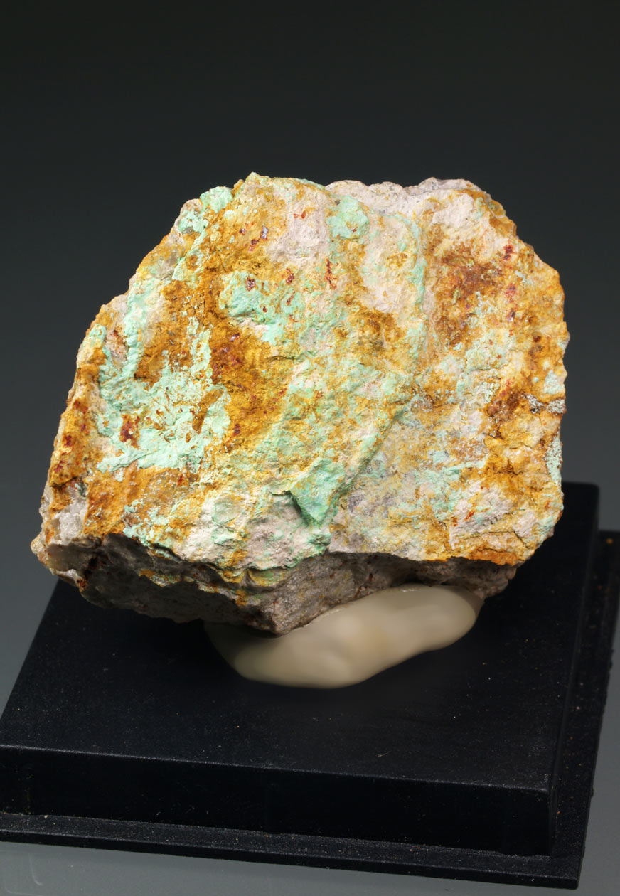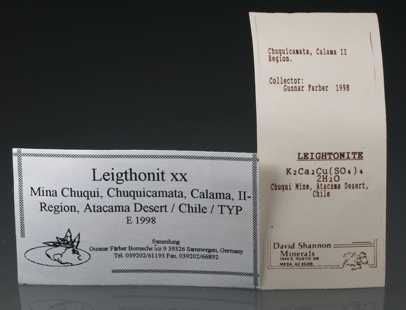 La leightonita es un raro sulfato de cobre con calcio y potasio, K₂Ca₂Cu(SO₄)₄·2H₂O, que se forma en climas áridos, como es el caso de este ejemplar procedente de la localidad tipo de la mina de Chuquicamata, en Chile. En este ejemplar podemos observar diversas zonas de color verdoso de este mineral. El ejemplar fue recogido por el vendedor de minerales G. Farber en 1988 y adquirido, posteriormente, a David Shannon por el coleccionista barcelonés Emili Nicolau.