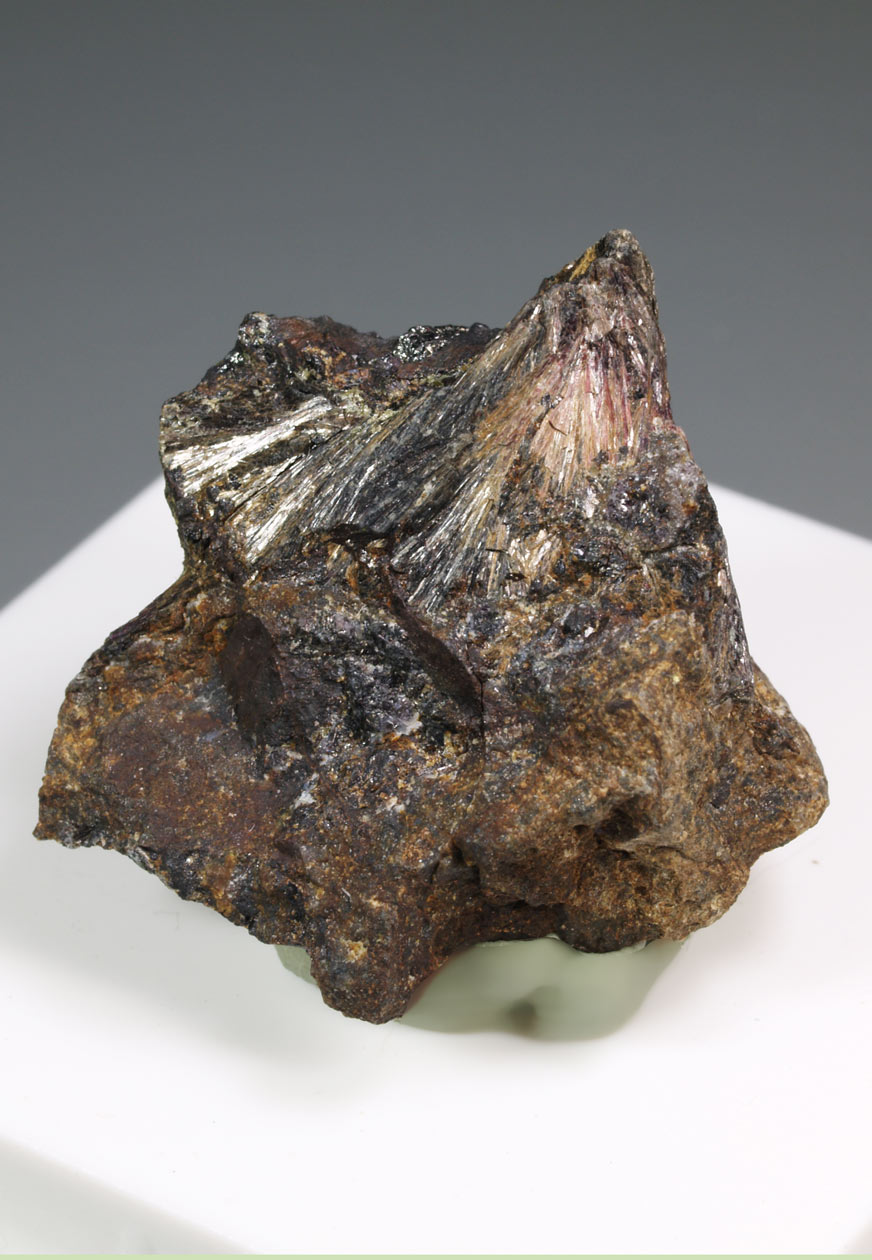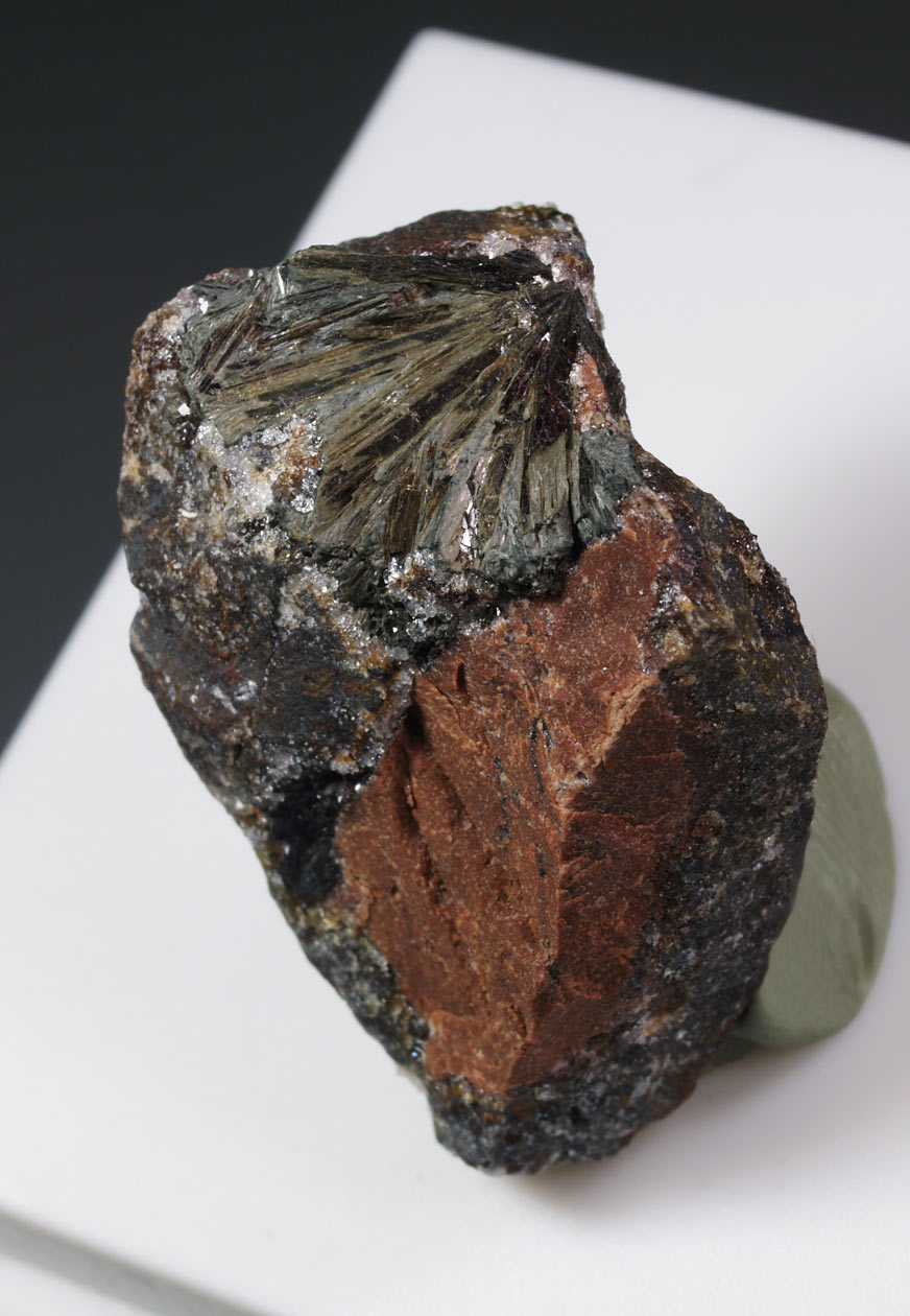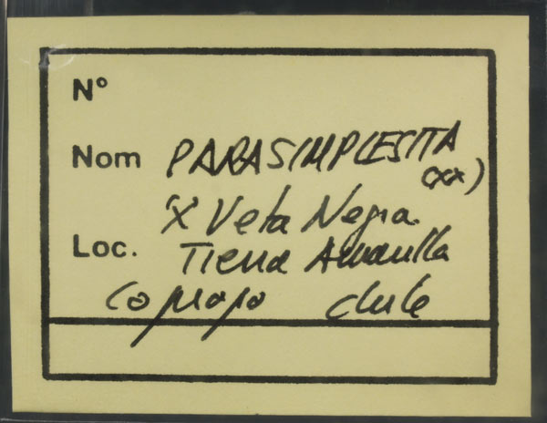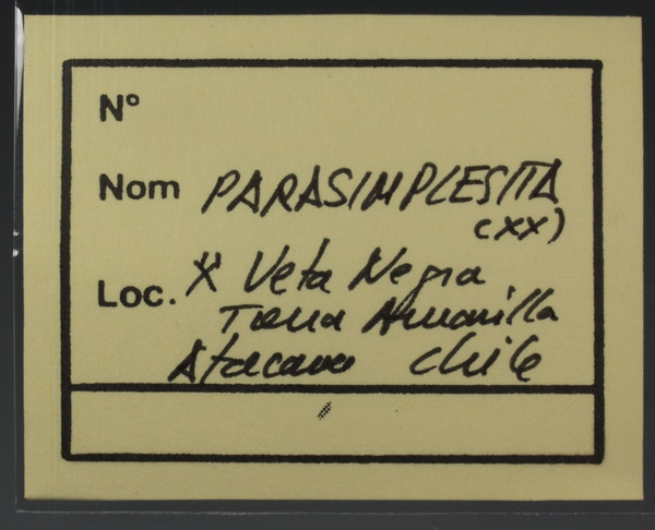 Estos ejemplares fueron adquiridos e identificados por el recordado Dr. Joan Viñals (1951-2013) quien los trajo de un viaje a tierra chilenas a principios de la década del 2000.Podemos observar agregados radiales de parasimplesita, según reza la etiqueta, de intenso brillo y color verde azulado, con fórmula Fe²⁺₃(AsO₄)₂·8H₂O. Muy probablemente se acompaña de simplesita. Un representativo ejemplar procedente de la colección de E. Nicolau (Barcelona).