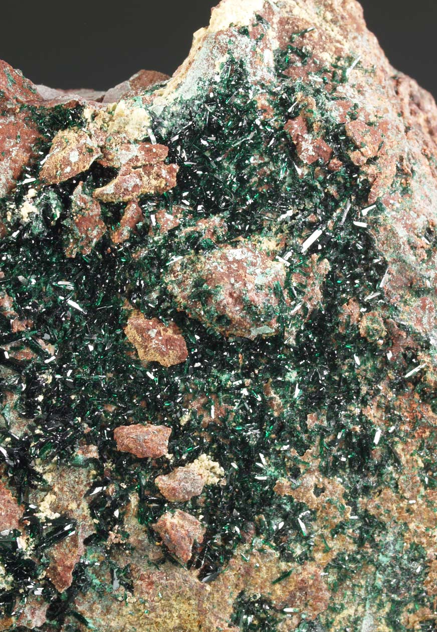 Muy rica drusa de cristales de pseudomalaquita de intenso color verde, formando cristales tabulares prismáticos definidos, translúcidos. Ejemplares de esta especie en esta mina son poco habituales. La pieza pertenció a la colección E. Laskowski (Tucson, USA), con etiqute del vendedor. Muy interesante ejemplar.
