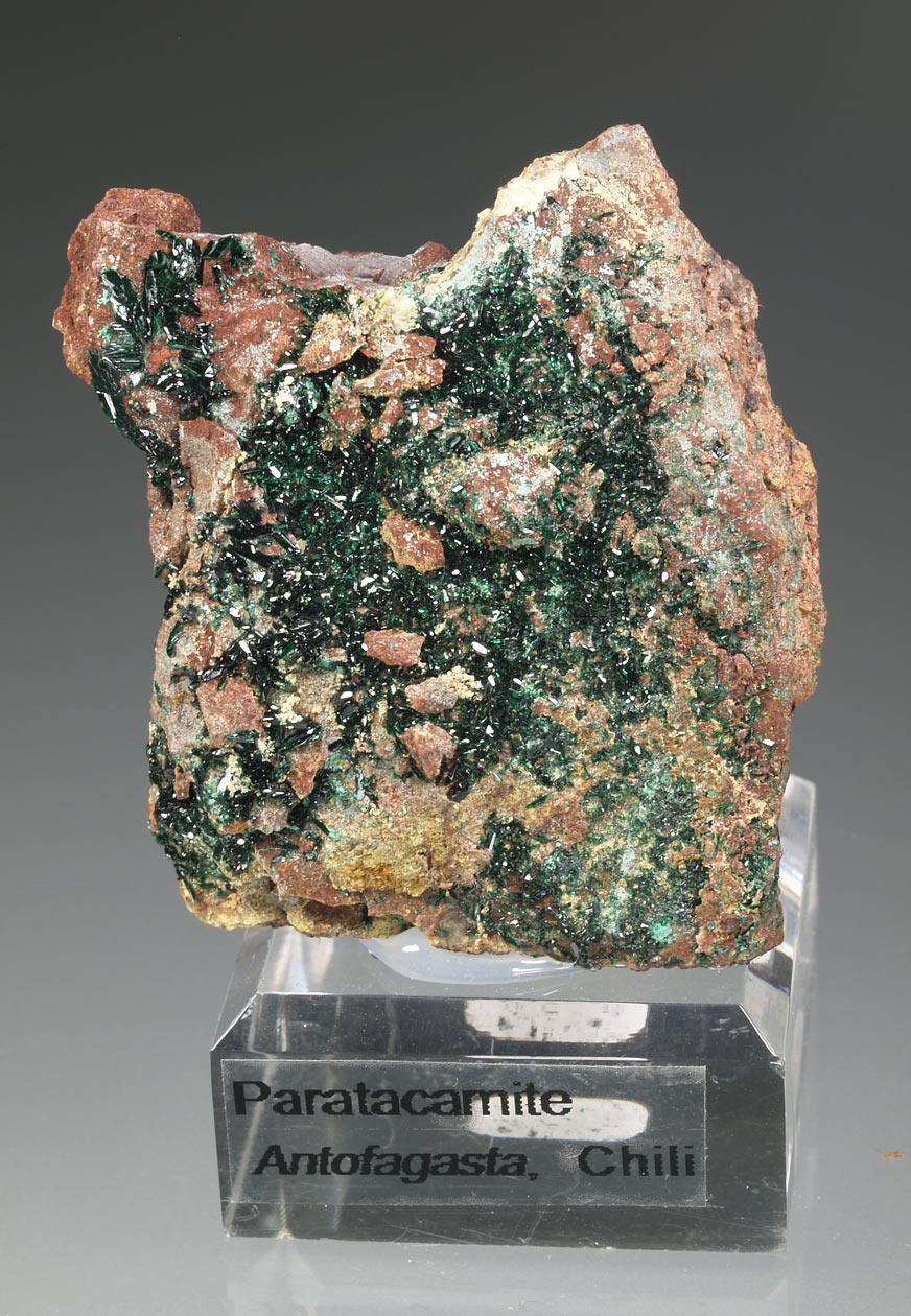 Cristales de paratacamita de intenso color verde, procedentes de una mina chilena donde la especie ha sido bien identificada. Cristales prismáticos, definidos, brillantes y con transparencia. Una pieza muy buena para la especie.