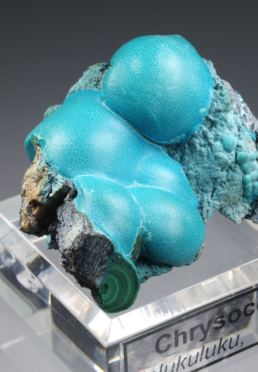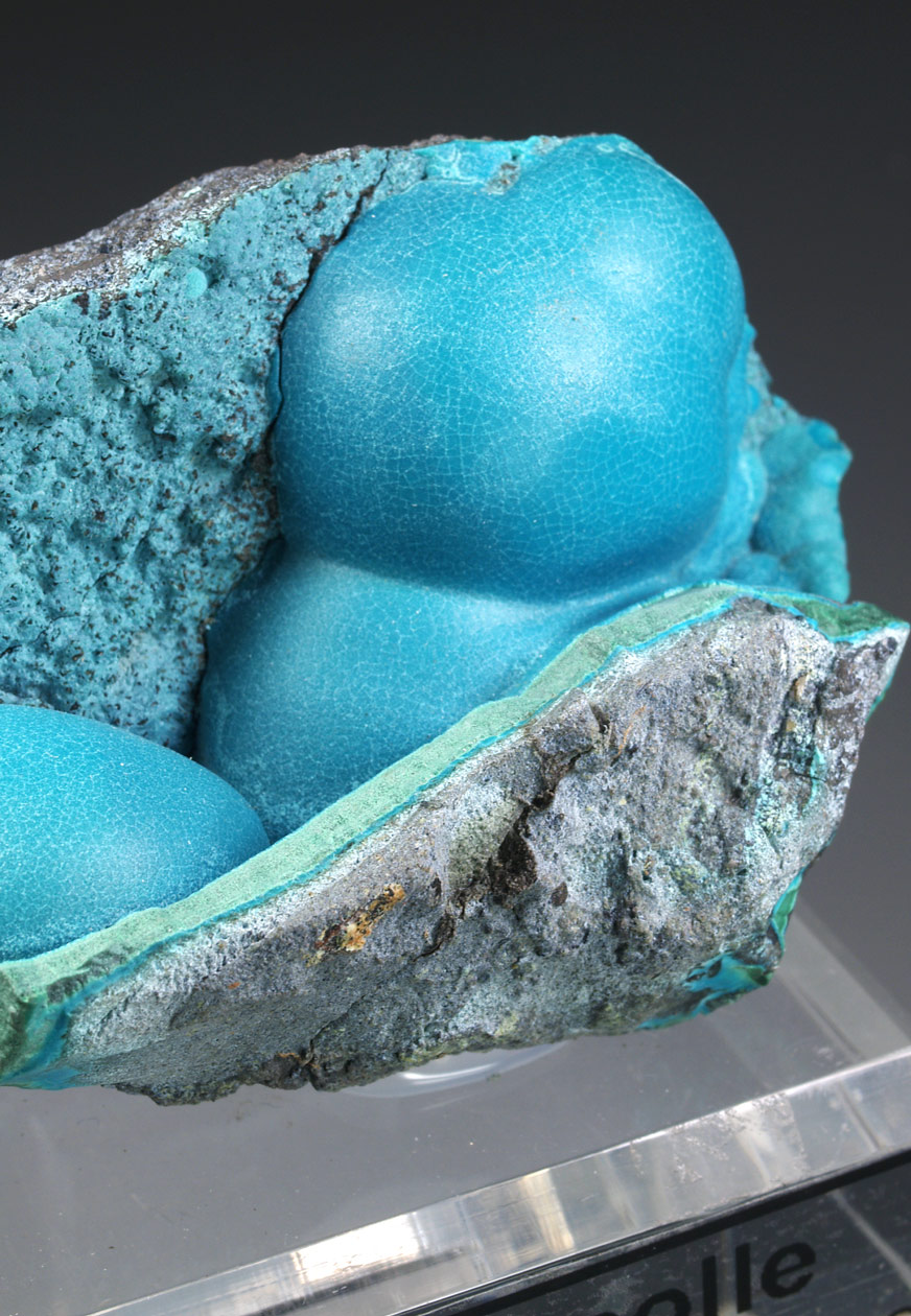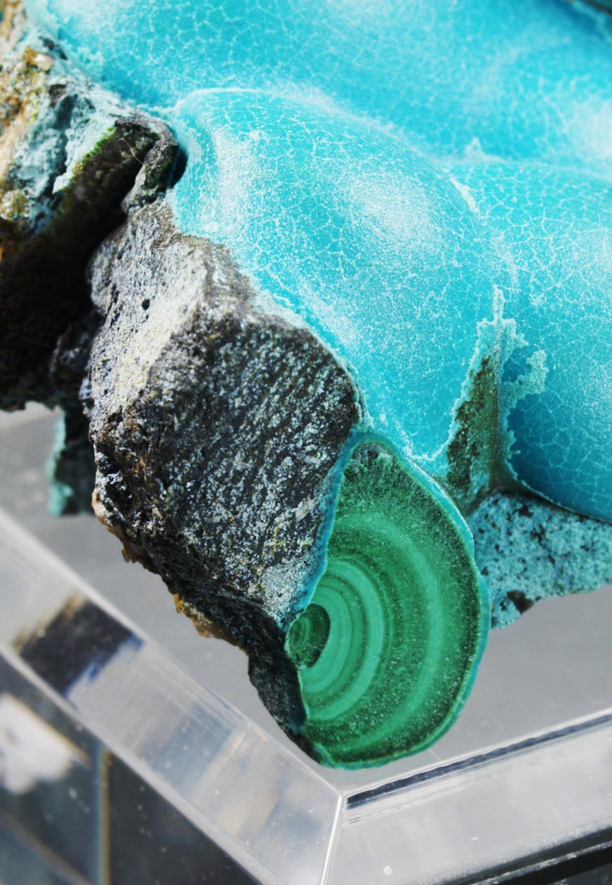 Muy estéticos agregados botroidales de malaquita totalmente recubiertos por una capa de crisocola de un azul, ligeramente verdoso. Podemos ver la malaquita, con crecimientos concéntricos, en alguna fractura. La belleza de estos ejemplares los hace dignos de la mejor colección y vitrina.