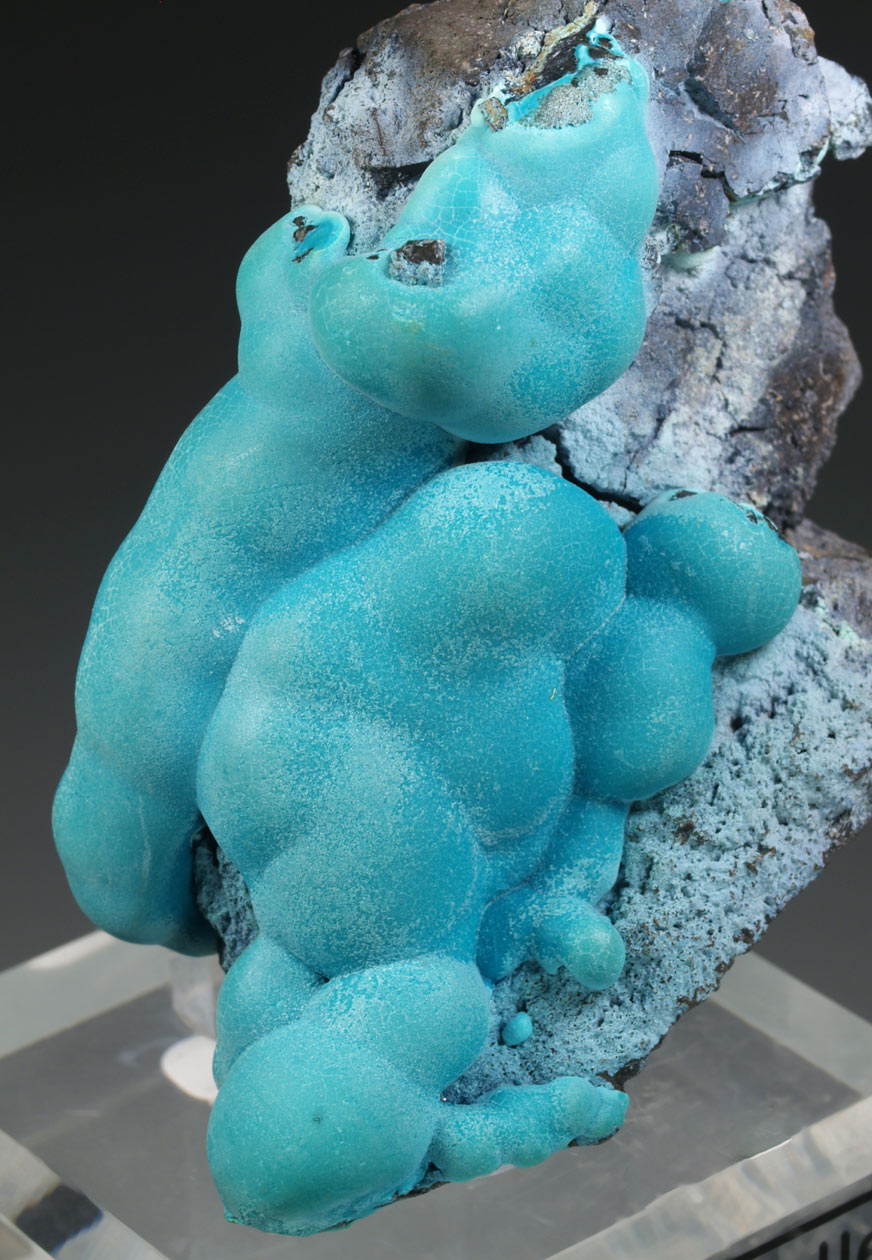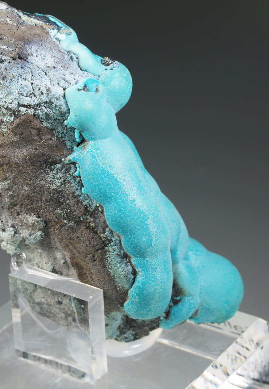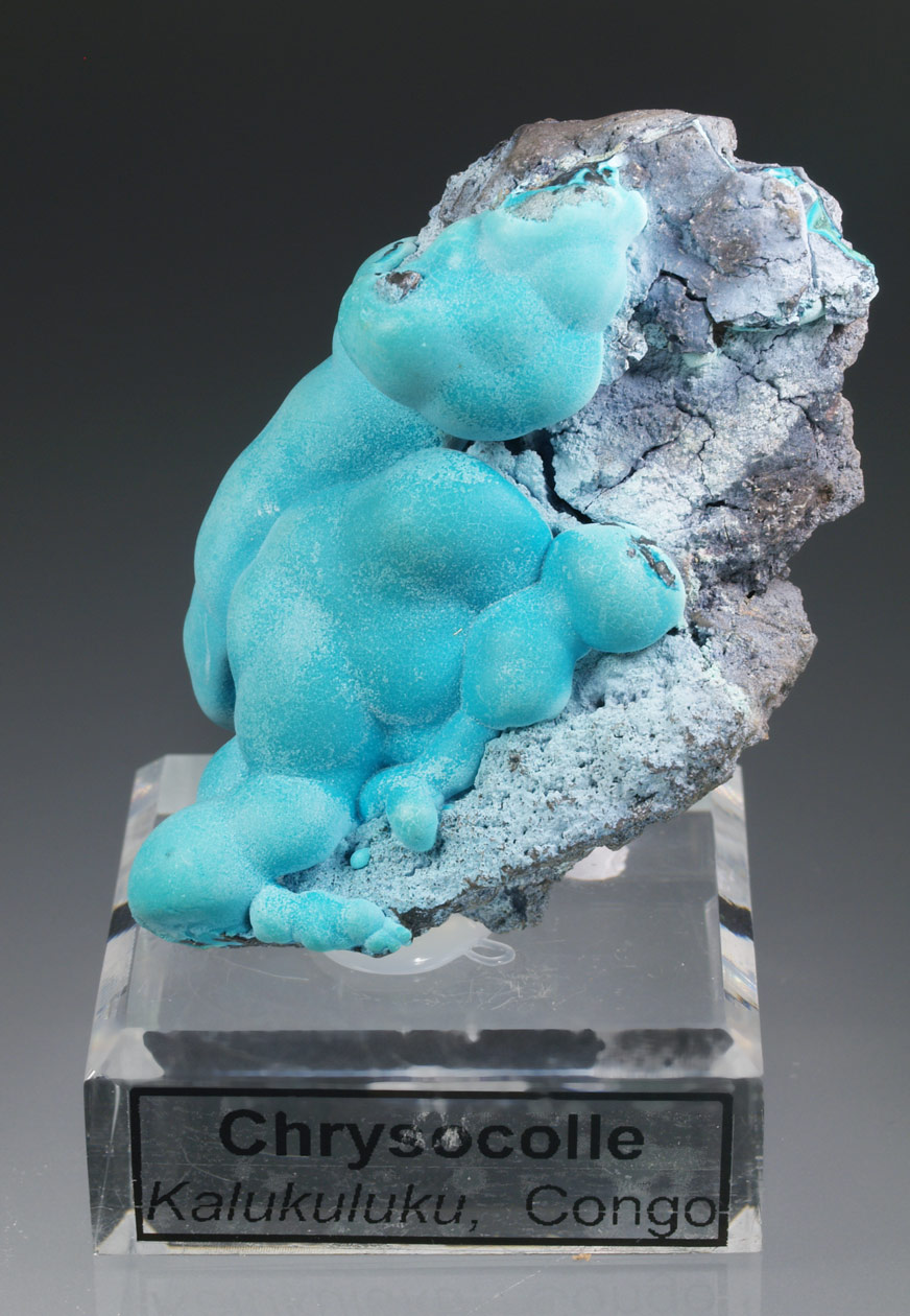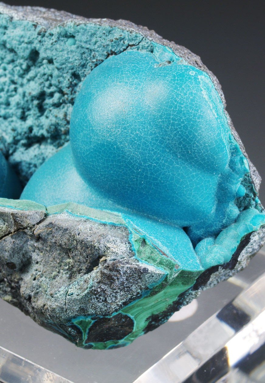 Muy estéticos agregados botroidales de malaquita totalmente recubiertos por una capa de crisocola de un azul, ligeramente verdoso. Podemos ver la malaquita, con crecimientos concéntricos, en alguna fractura. La belleza de estos ejemplares los hace dignos de la mejor colección y vitrina.