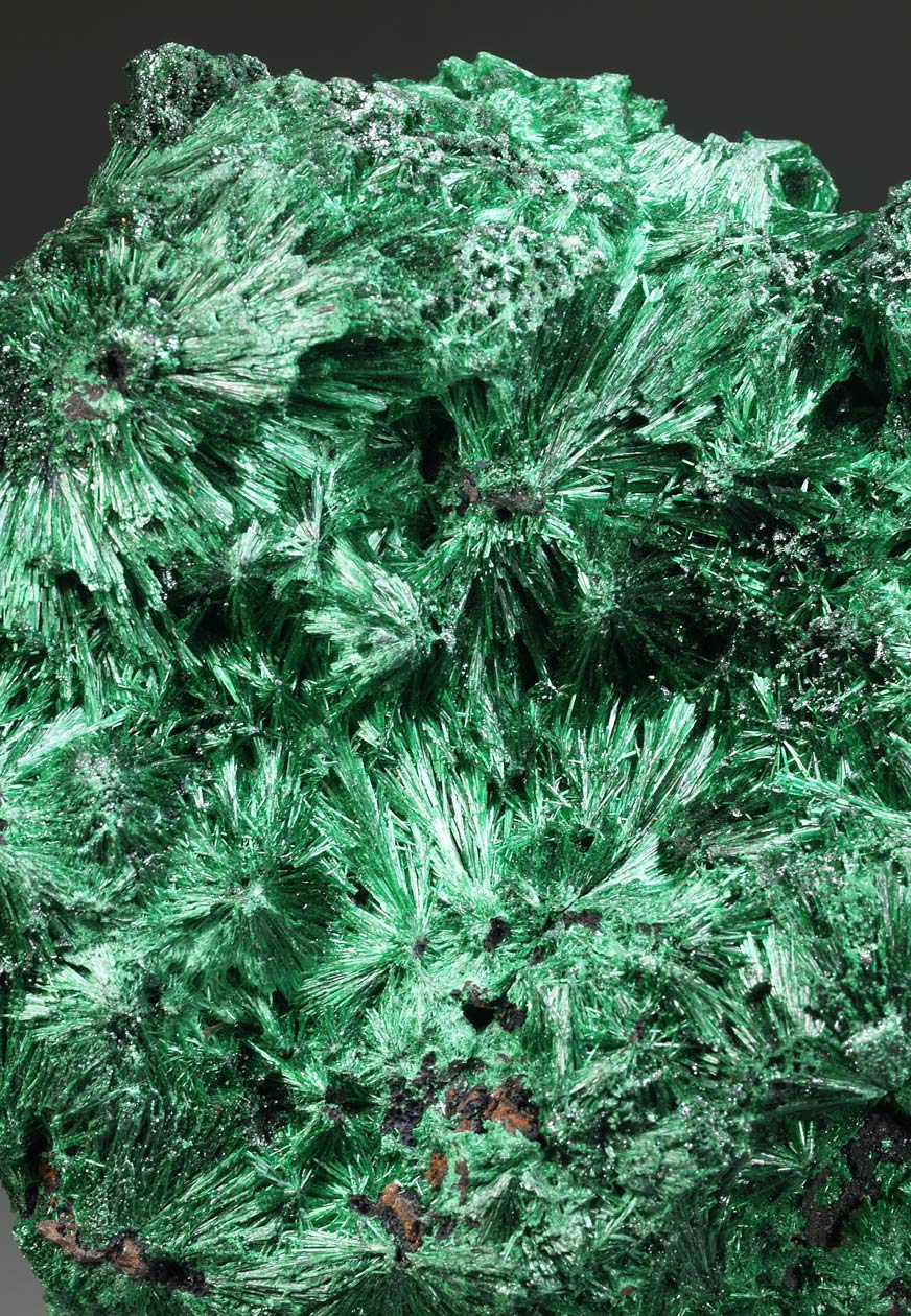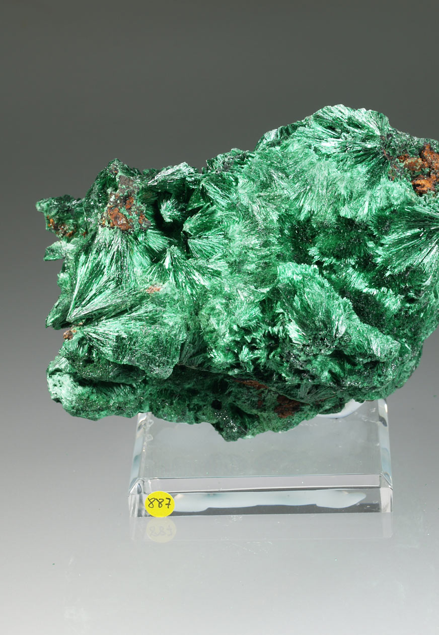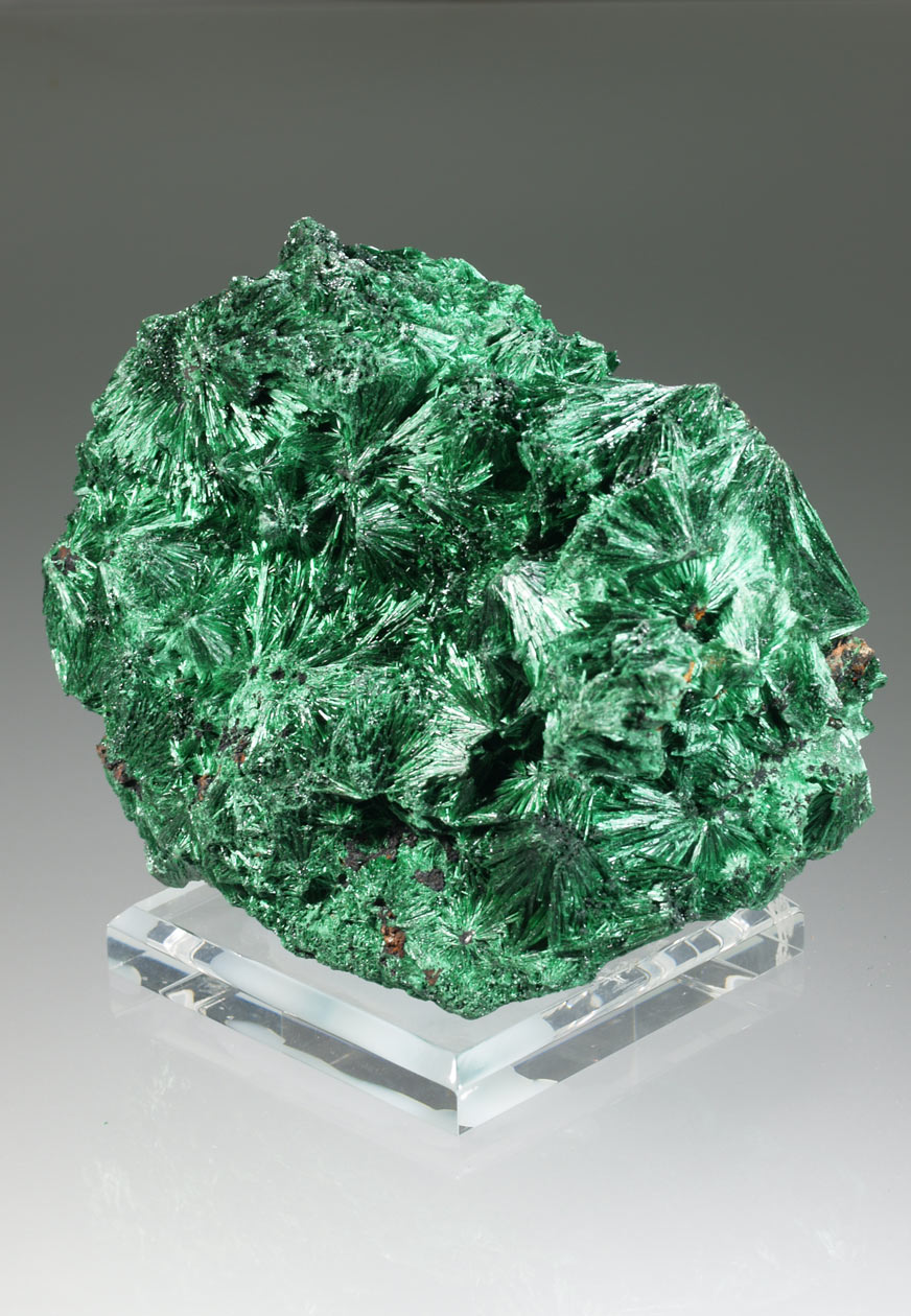 Los ejemplares de malaquita de esta mina del Alto Katanga destacan por los agregados radiales, en abanico, de finos cristales que, en conjunto, presentan un aspecto aterciopelado y un brillo excelente. Intenso color verde, buen tamaño y muy estético por ambas caras.