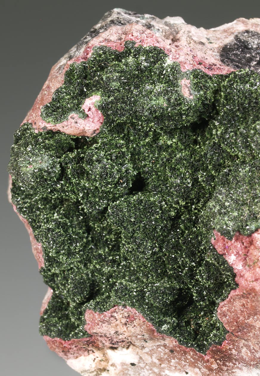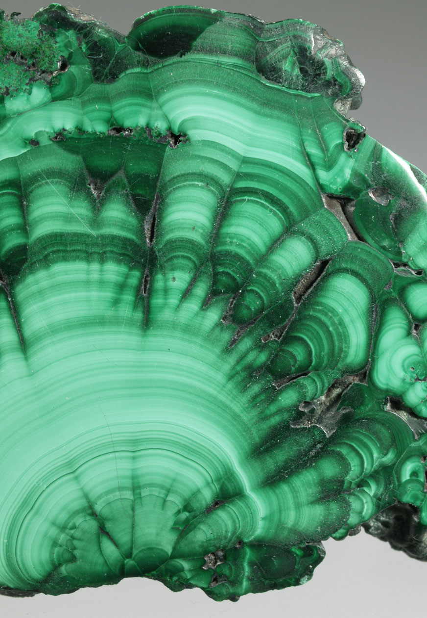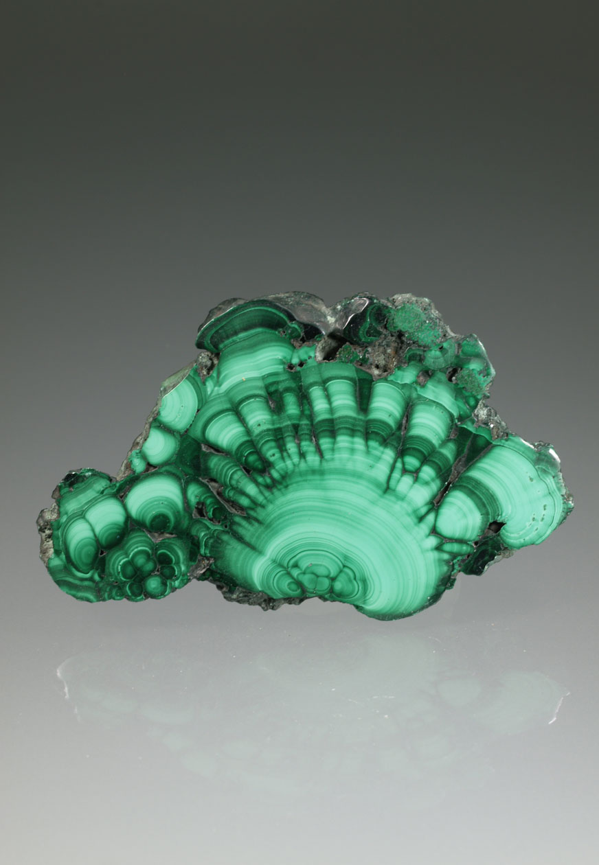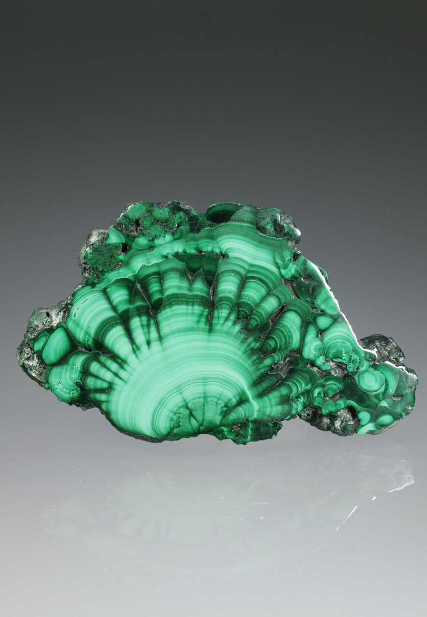 Los ejemplares de malaquita de esta mina del Alto Katanga destacan por los agregados radiales, en abanico, de finos cristales que, en conjunto, presentan un aspecto aterciopelado y un brillo excelente. Intenso color verde, buen tamaño y muy estético por ambas caras.