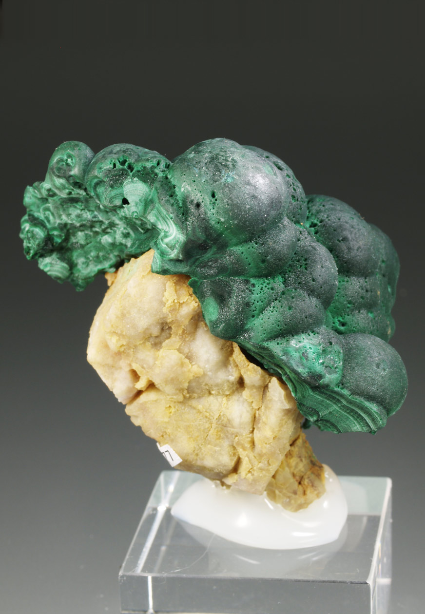 Habitaulmente los ejemplares de malaquita de esta mina aparecen sin matriz. Este ejemplar nos muestra un agregado botroidal de intenso color verde que se dispone de forma muy aérea sobre una matriz de cuarzo. Muy estético.