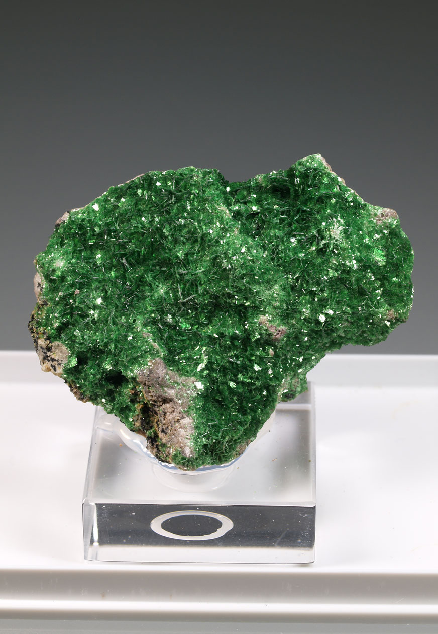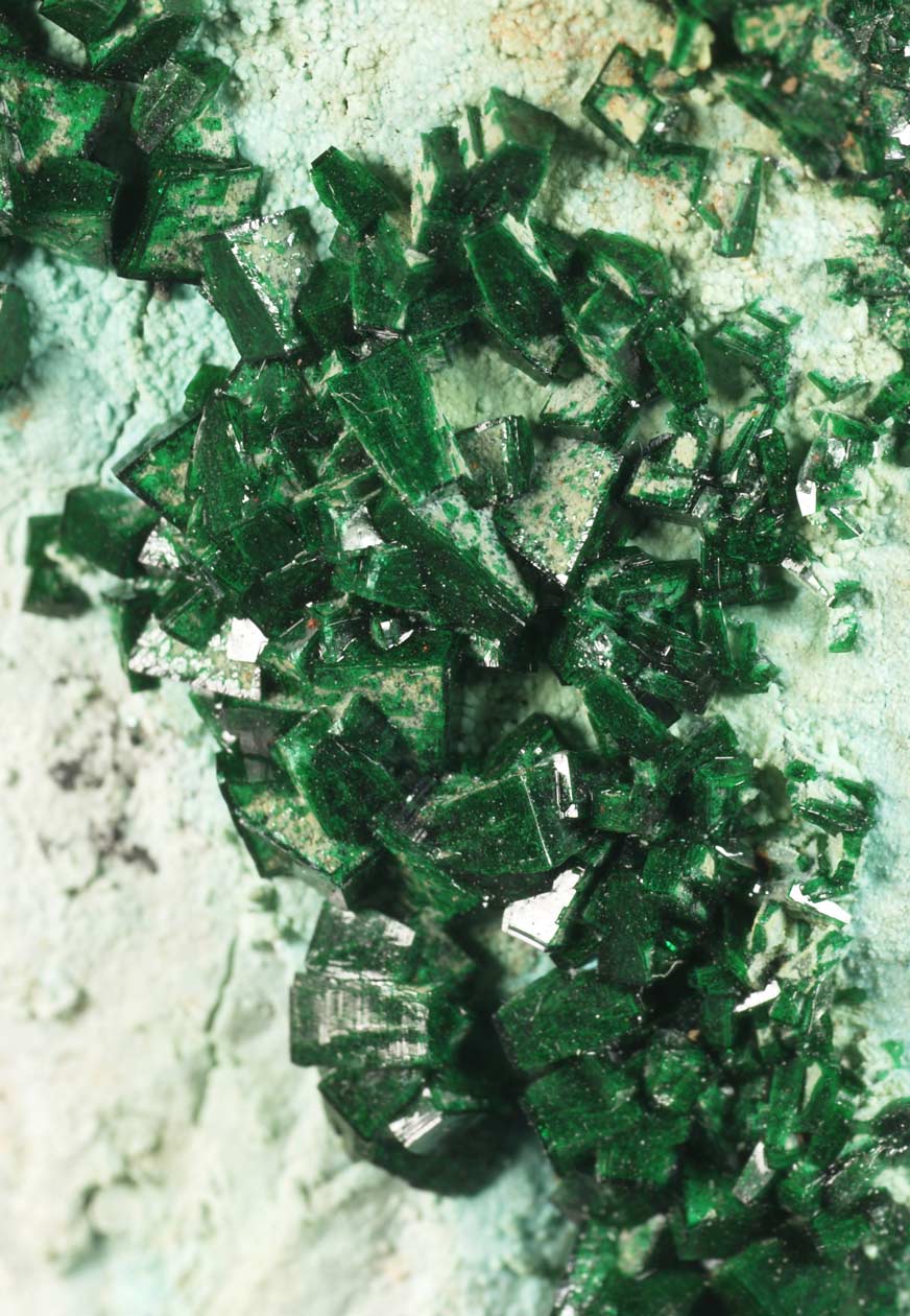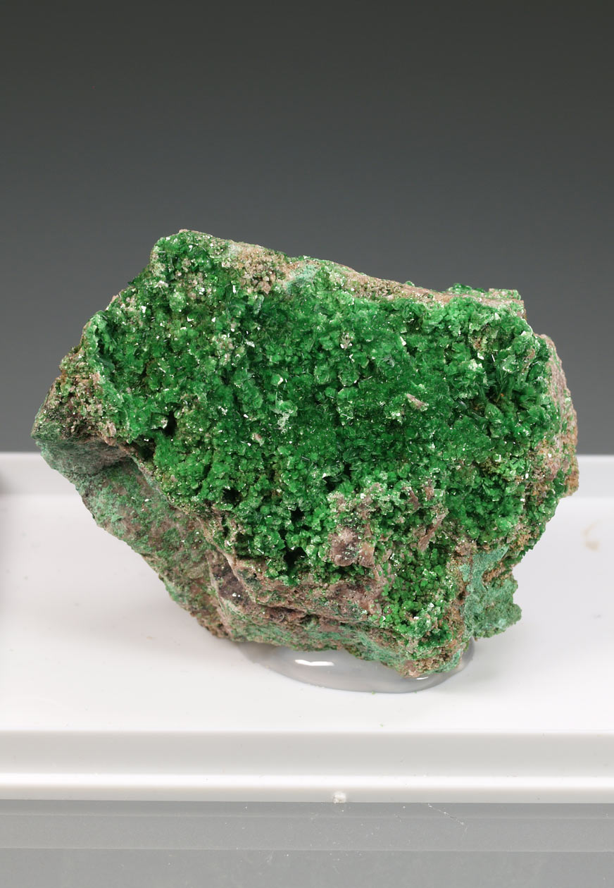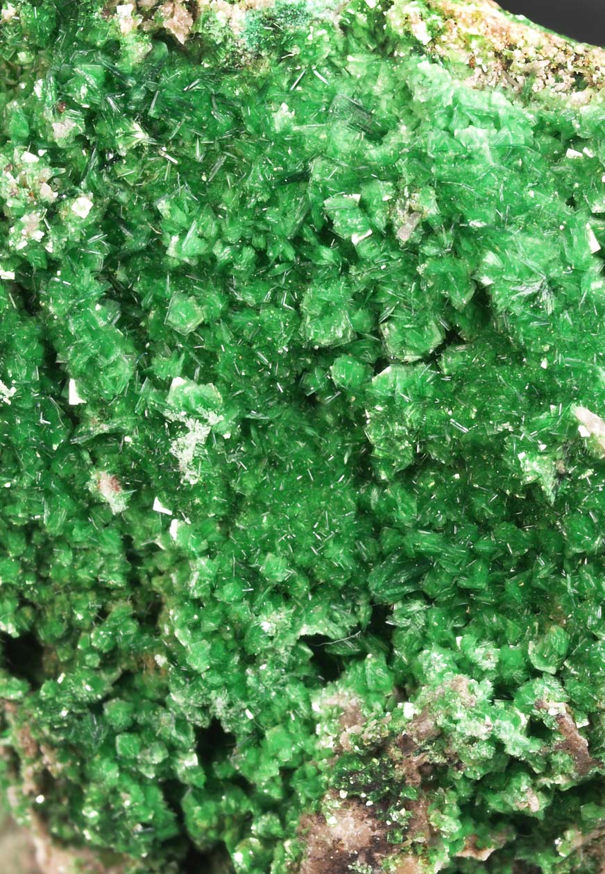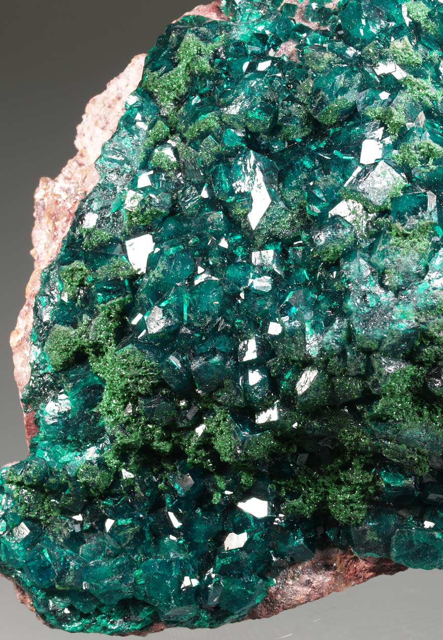 Drusa de cristales de dioptasa, con caras y aristas muy definidas, brillantes, con transparencia y dispuestos sobre la matriz con cuarzo. El color es muy característico, difícil de reproducir en fotografía. Se acompaña de pequeños agregados de cristales de malaquita, visibles por su color verde diferente. Una pieza de buen tamaño y calidad.