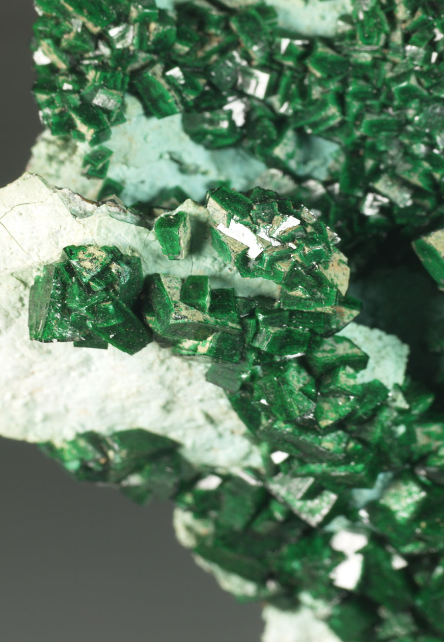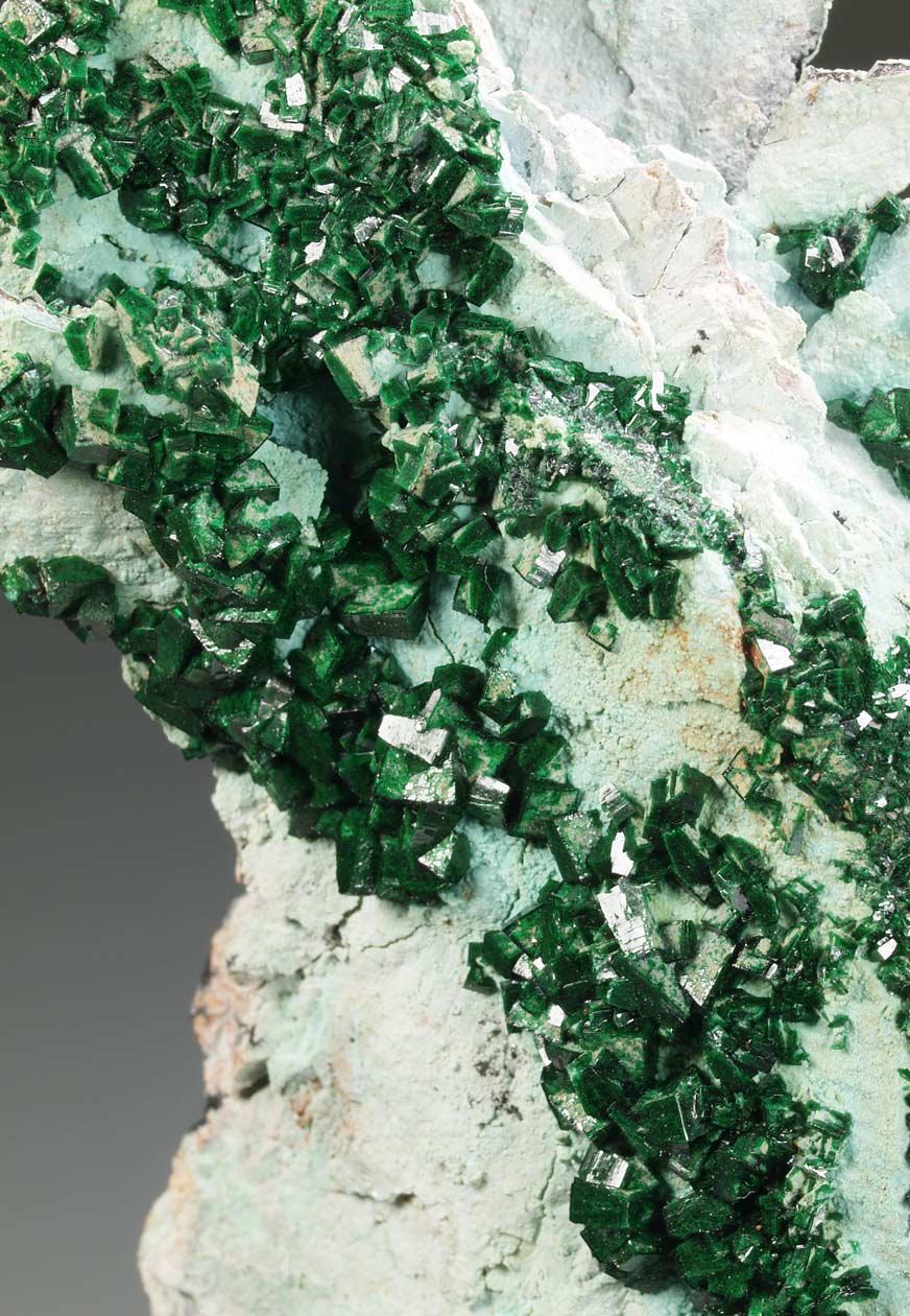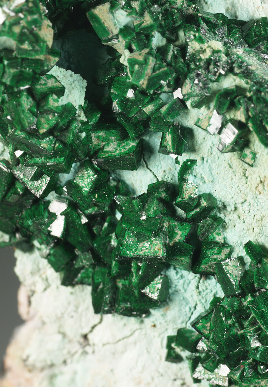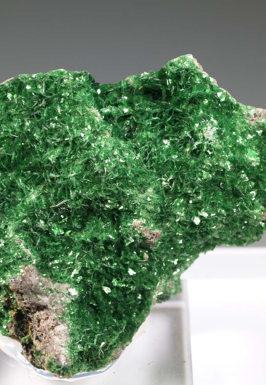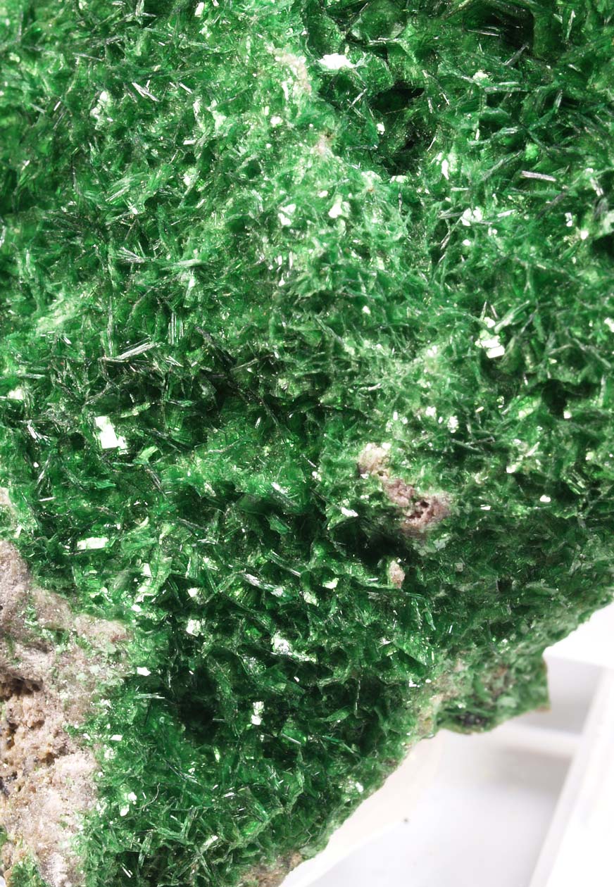 Drusa de cristales de dioptasa, con caras y aristas muy definidas, brillantes, con transparencia y dispuestos sobre la matriz con cuarzo. El color es muy característico, difícil de reproducir en fotografía. Se acompaña de pequeños agregados de cristales de malaquita, visibles por su color verde diferente. Una pieza de buen tamaño y calidad.