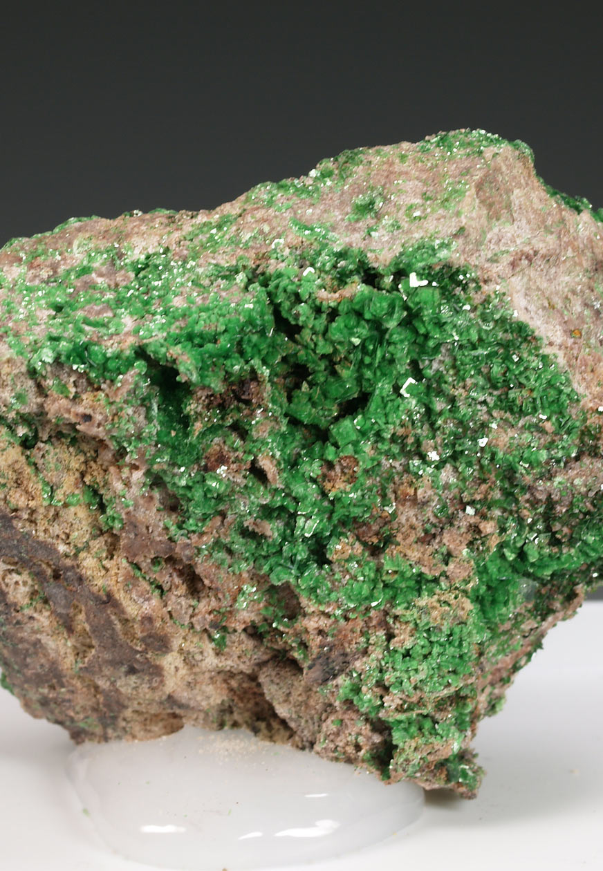 Pequeños cristales anaranjados a amarillos de kasolita, muy estéticos bajo aumento. Se disponen sobre una matriz de gres con malaquita. Un clásico de Musonoi.