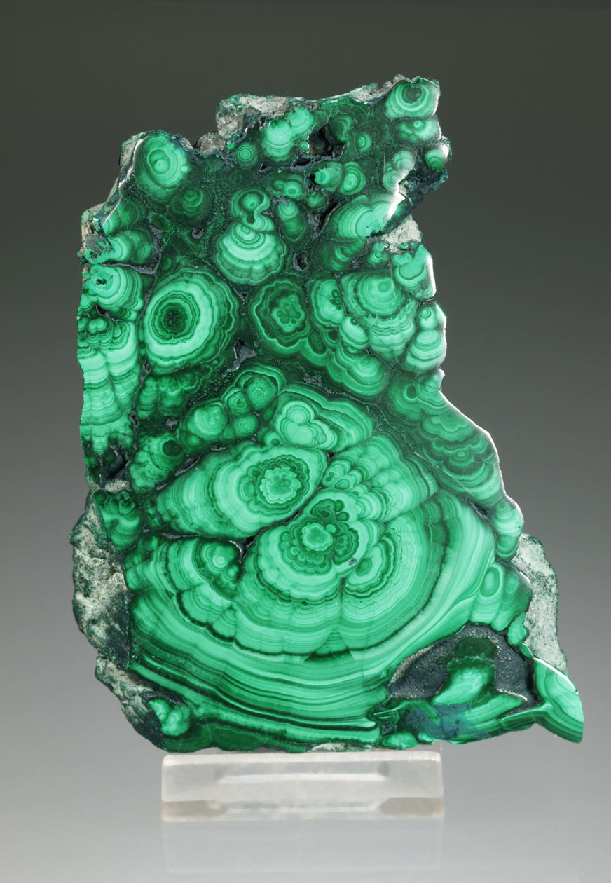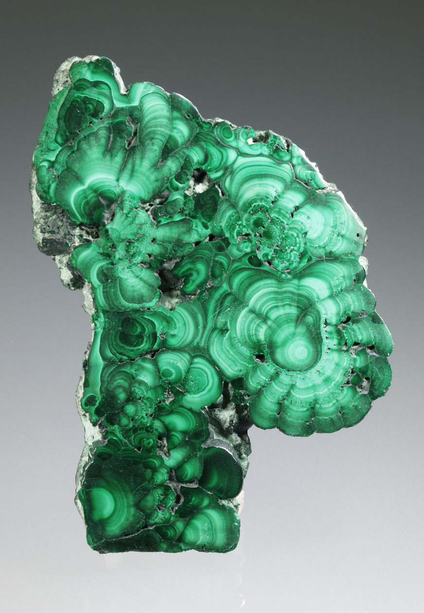 Placa de malaquita pulida por ambos lados. Ofrecemos este tipo de producto, no simplemente a nivel decorativo, sinó des de un punto de vista didáctico y científico. La sección nos permite ver las bellas estructuras de crecimiento concentricos de estas malaquitas.