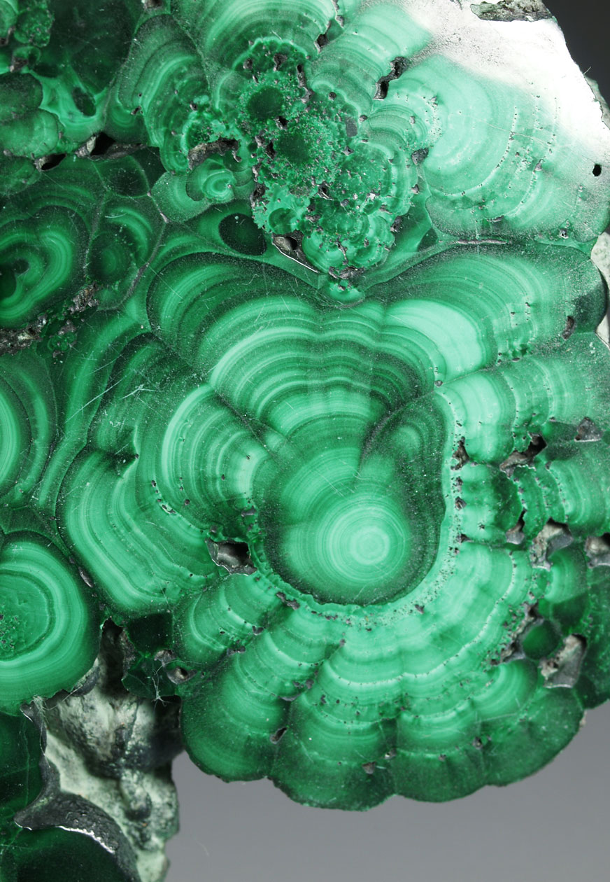 Placa de malaquita pulida por ambos lados. Ofrecemos este tipo de producto, no simplemente a nivel decorativo, sinó des de un punto de vista didáctico y científico. La sección nos permite ver las estructuras de crecimiento concentricos de estas malaquitas.