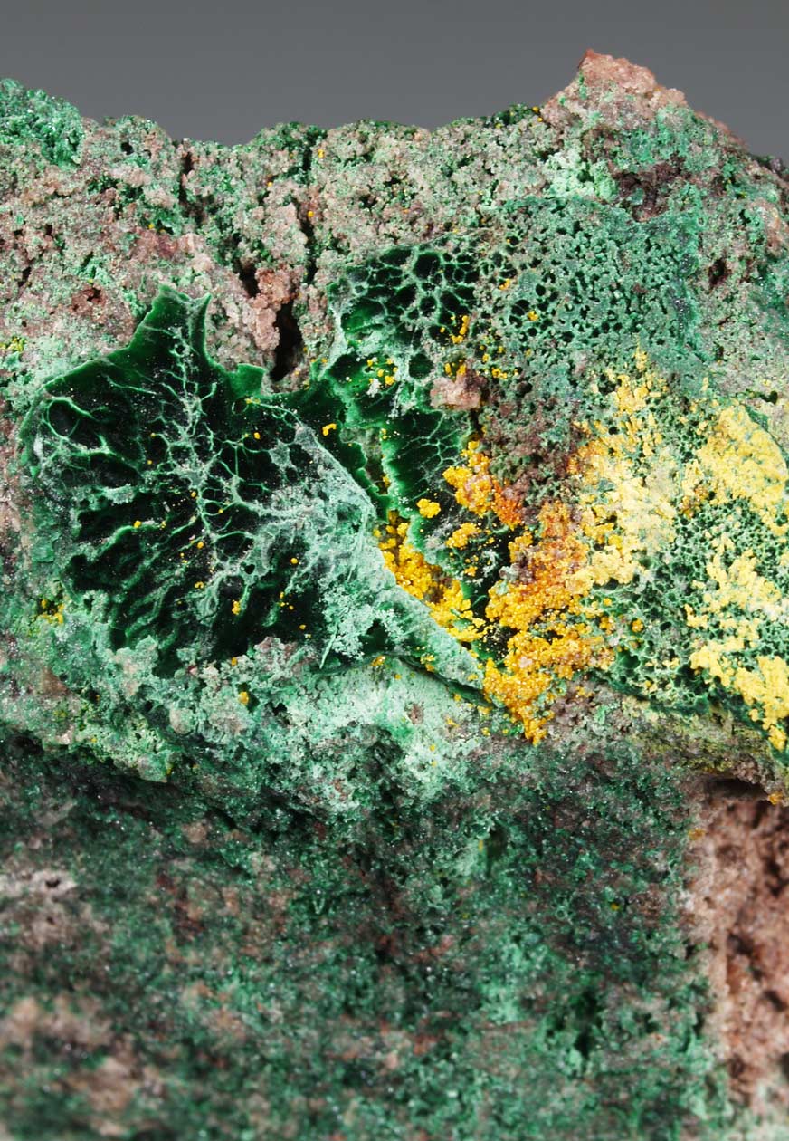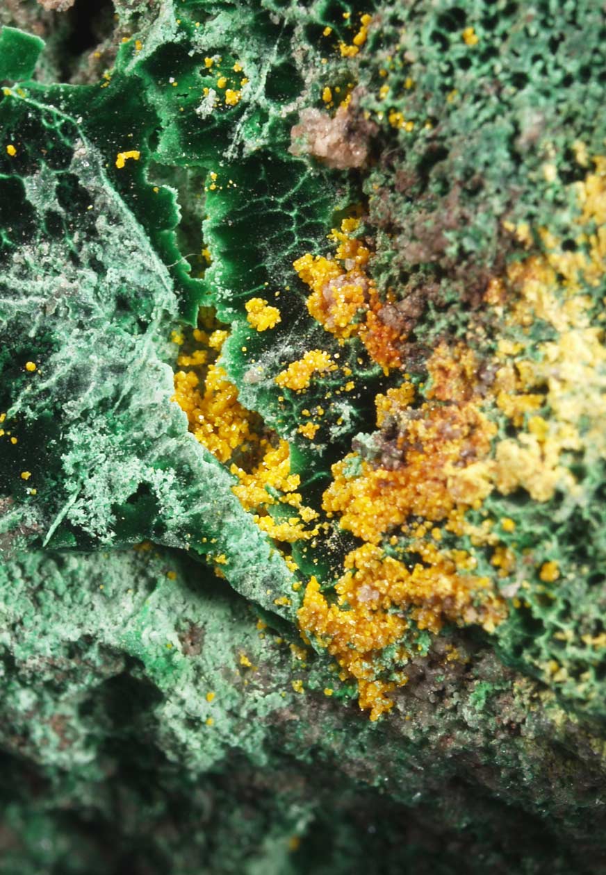 Estos ejemplares proceden de la localidad tipo para la kolwezita, un carbonato de cobre y cobalto. La mayoría de las piezas de "kolwezita" que se ven en el mercado no tienen la relación 1:1 Cu:Co, que se exige para llamarlas así, suelen tener la relación Cu:Co 2:1. De todas las que he analizado (y van unas cuantas) incluso las de color verde oliva mantienen esa relación. En este caso podemos decir, para ser honestos, que se trata de malaquita rica en cobalto. Aún así, los ejemplares son muy estéticos. Si algún día encuentro una kolwezita 1:1 Cu:Co, probablemente hallaré el grial...
