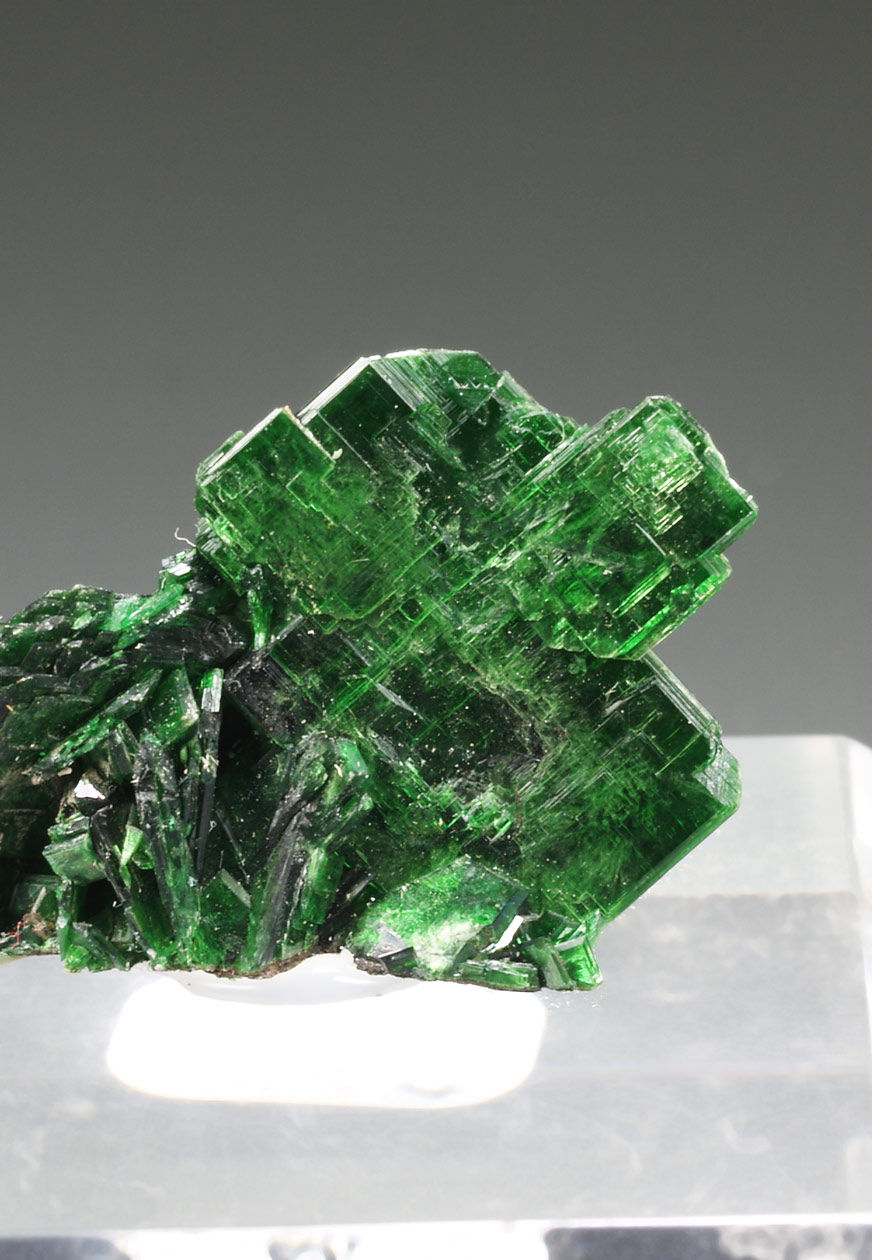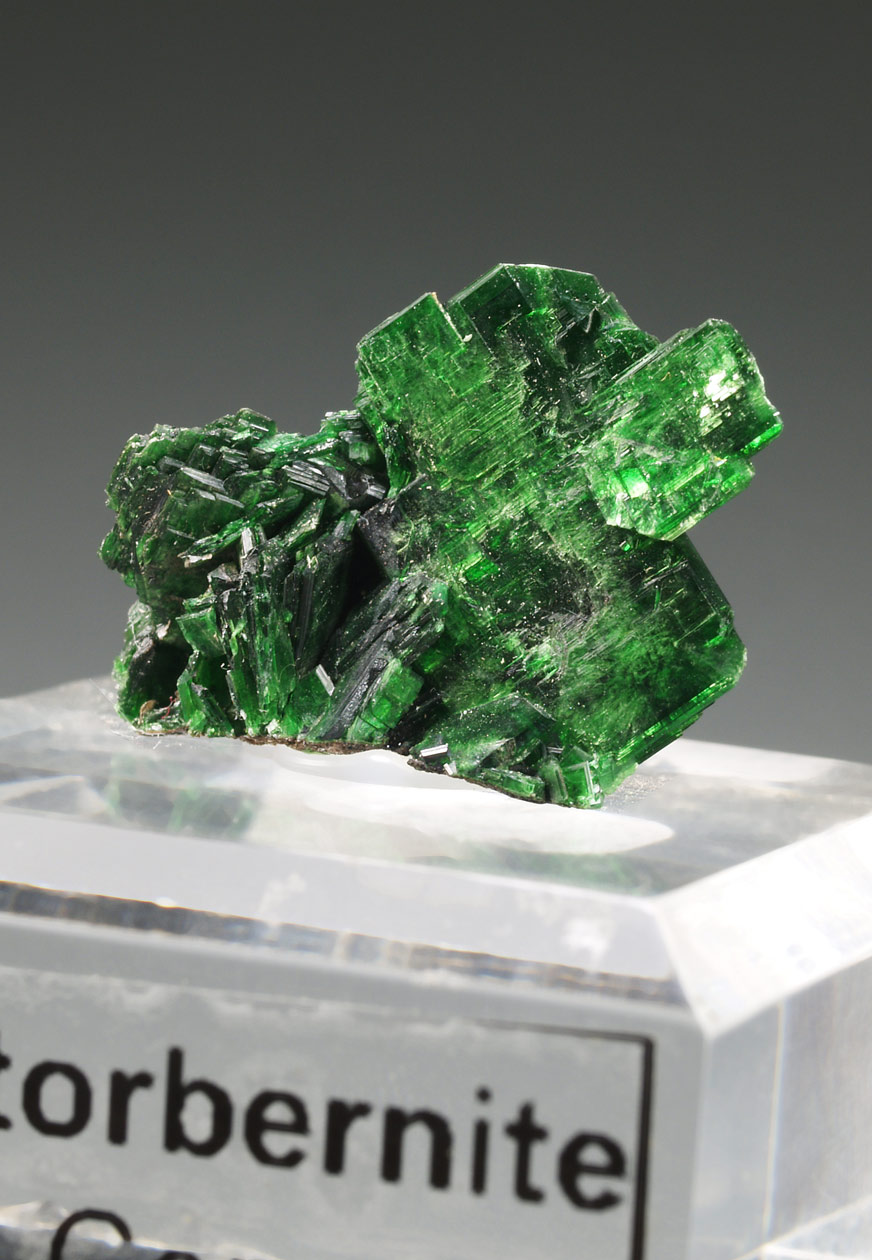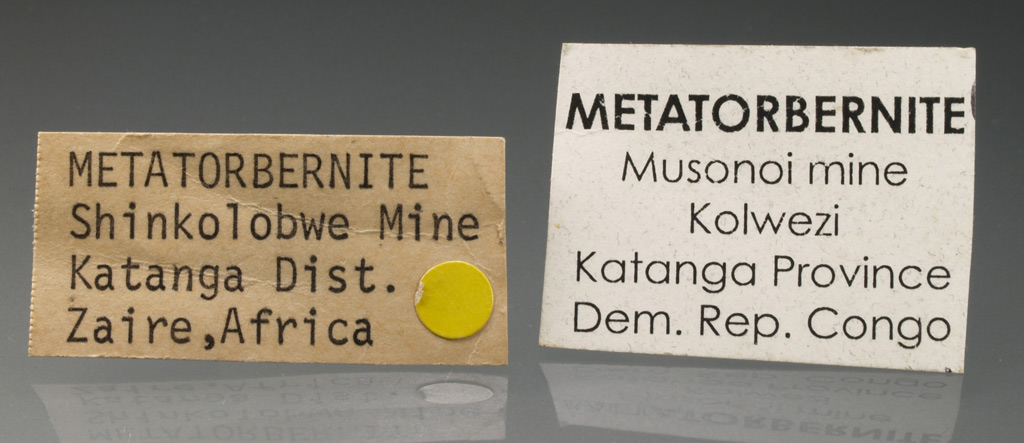 Grupo de cristales tabulares de metatorbernita (torbernita deshidratada) con un tamaño excepcional, translúcido y con mucho brillo. El color verde presenta reflejos internos muy estéticos. Procedente de esta localidad clásica en la zona de Katanga. Se acompaña d dos etiquetas antiguas. Una miniatura excepcional.