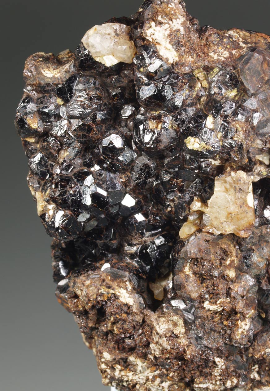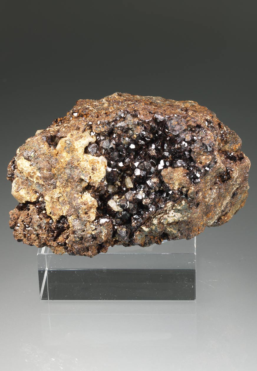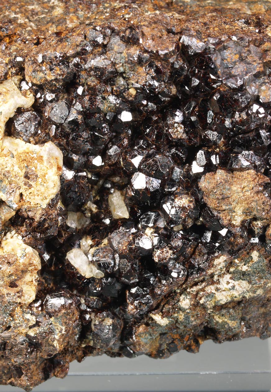 Estos ejemplares proceden de un hallazgo antiguo en la zona de Felhuns. Se trata de un skarn donde aparecieron vetas de granate. Actualmente está totalmente prohibido extraer ejemplares, debido, como sucede a menudo, a los actos de desaprensivos que no sólo extraen ejemplares sino que destrozan el lugar. Se trata de cristales dodecaédricos a menudo biselados por el trapezoedro, muy brillantes, con un color de miel tostada muy intenso, con cierta transparencia. Este ejemplar es flotante. Se han analizado y los resultados indican una proporción andradita-grosularia alrededor del 65-35% (anàlisis RM333A).