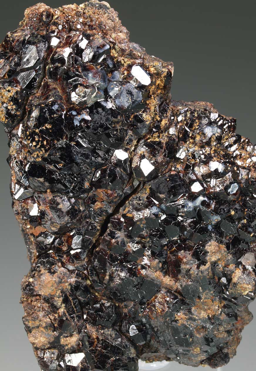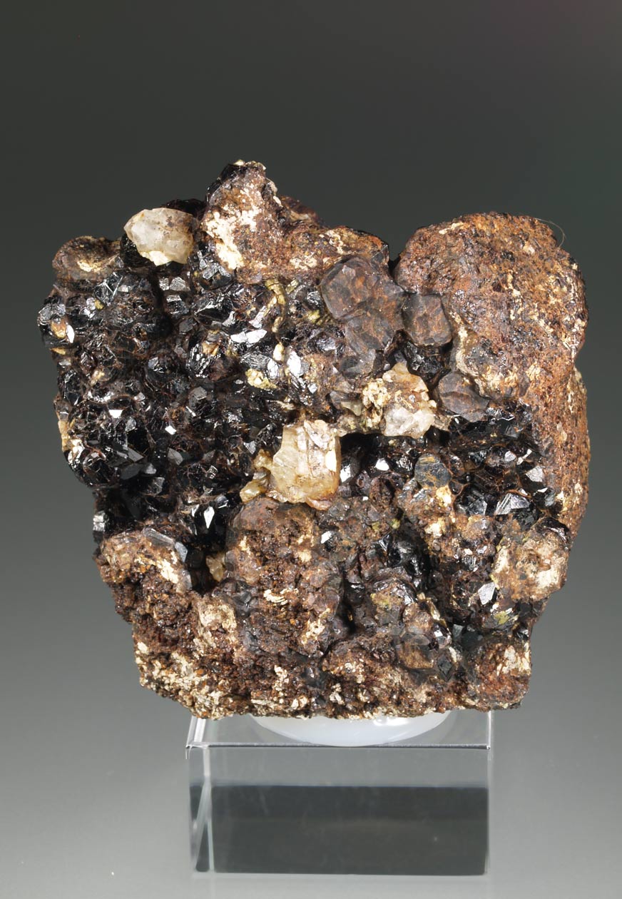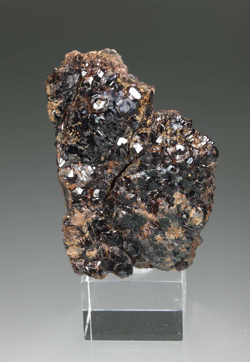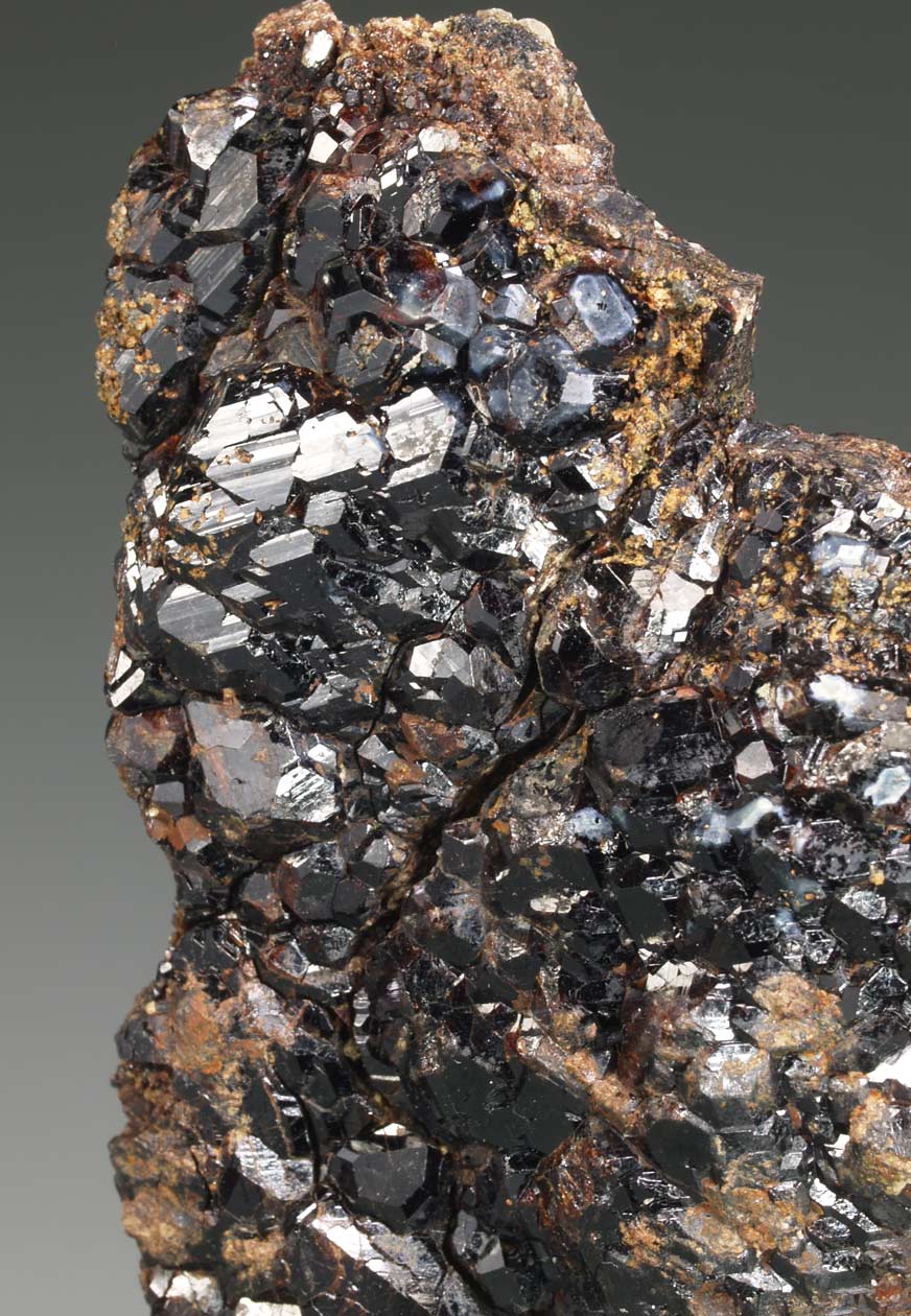 Nutrido grupo de cristales de bournonita, brillantes, con caras complejas e interpenetrados. Se acompañan de cristales de esfalerita melada. El ejemplar se acompaña de una etiqueta que lo identifica como de Saint-Laurent-Le-Minier (Sent Laurenç del Minièr), aunque sea más probalble que sea de la mina Saguinede en Montdardier, muy cercana a Saint-Laurent.