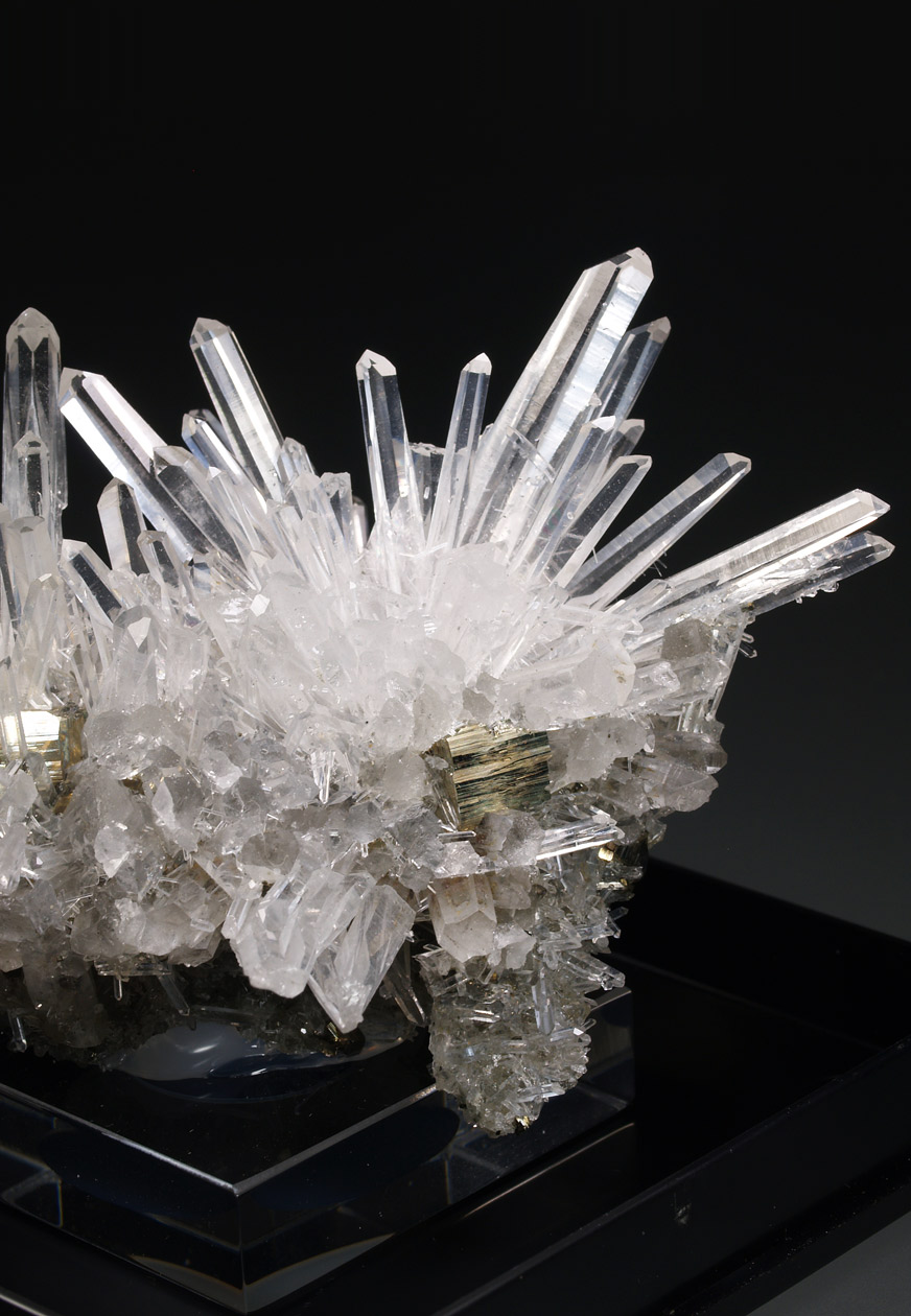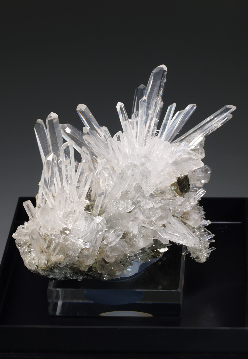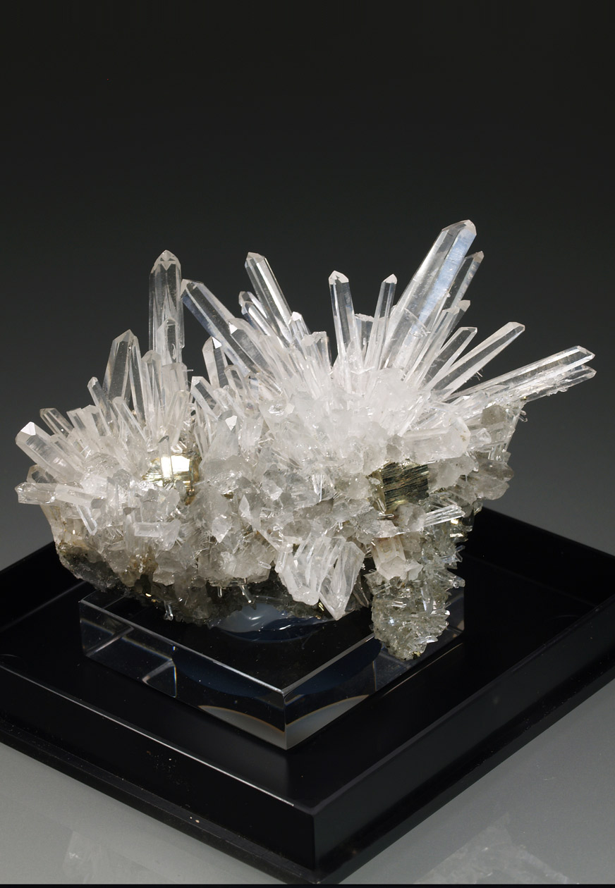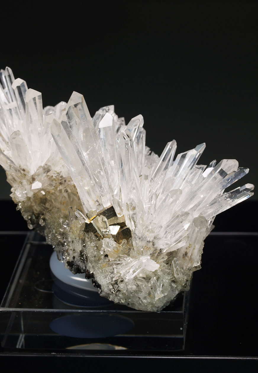 Este ejemplar venia como procedente de Bourg d'Oisans, aunque lo más seguro, por su aspecto y paragénesis, se trata de uno de los ejemplares procedentes de la zona de La Gardette. Se trata de un nutrido grupo de cristales de cuarzo hialino, muy alargados, con el hábito "dauphiné". Se acompaña de diversos cristales de pirita. Una pieza muy estética de una localidad clásica que no puede faltar en cualquier colección.