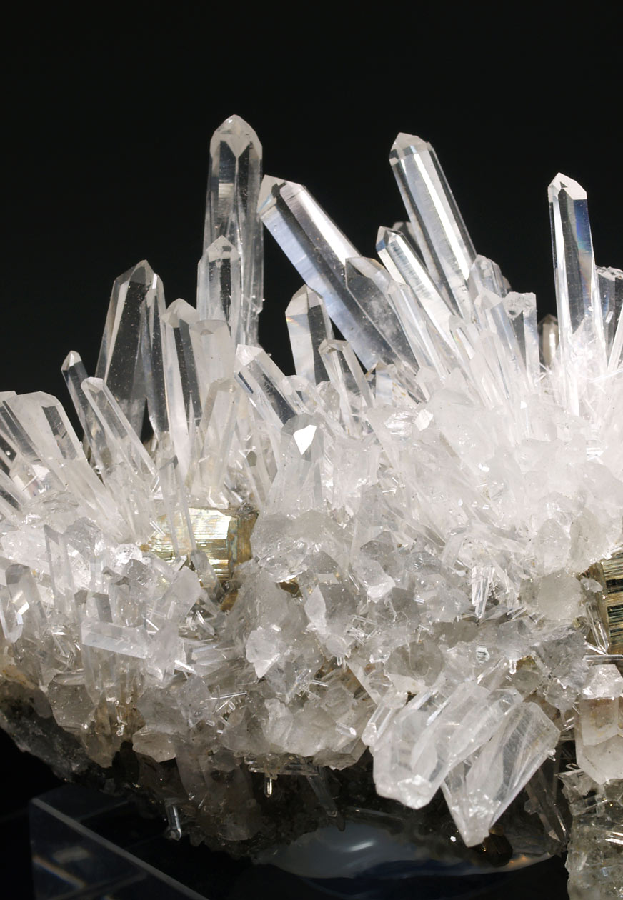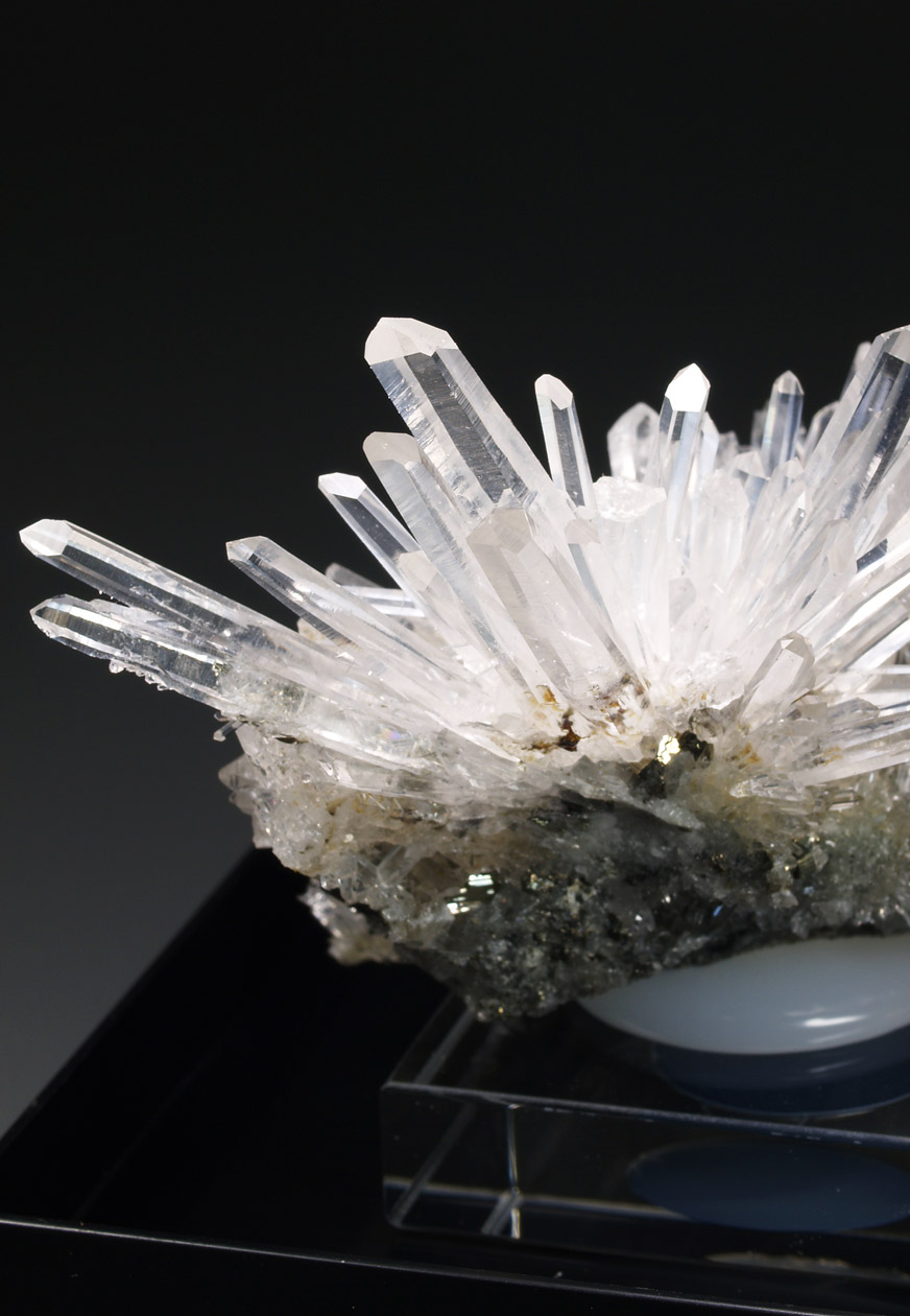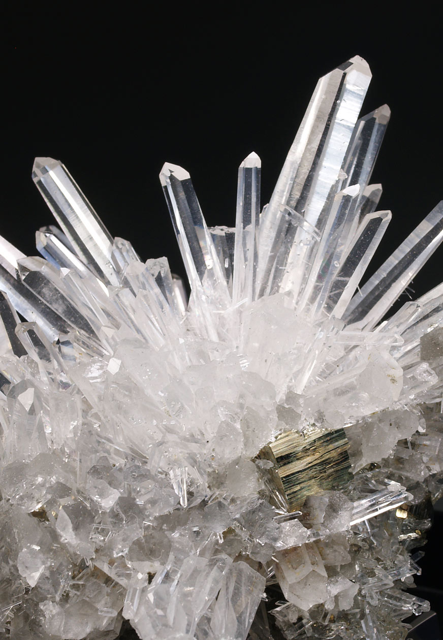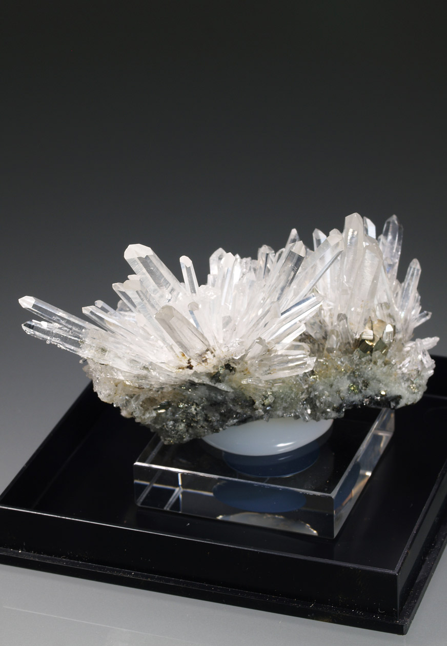 Este ejemplar venia como procedente de Bourg d'Oisans, aunque lo más seguro, por su aspecto y paragénesis, se trata de uno de los ejemplares procedentes de la zona de La Gardette. Se trata de un nutrido grupo de cristales de cuarzo hialino, muy alargados, con el hábito "dauphiné". Se acompaña de diversos cristales de pirita. Una pieza muy estética de una localidad clásica que no puede faltar en cualquier colección.
