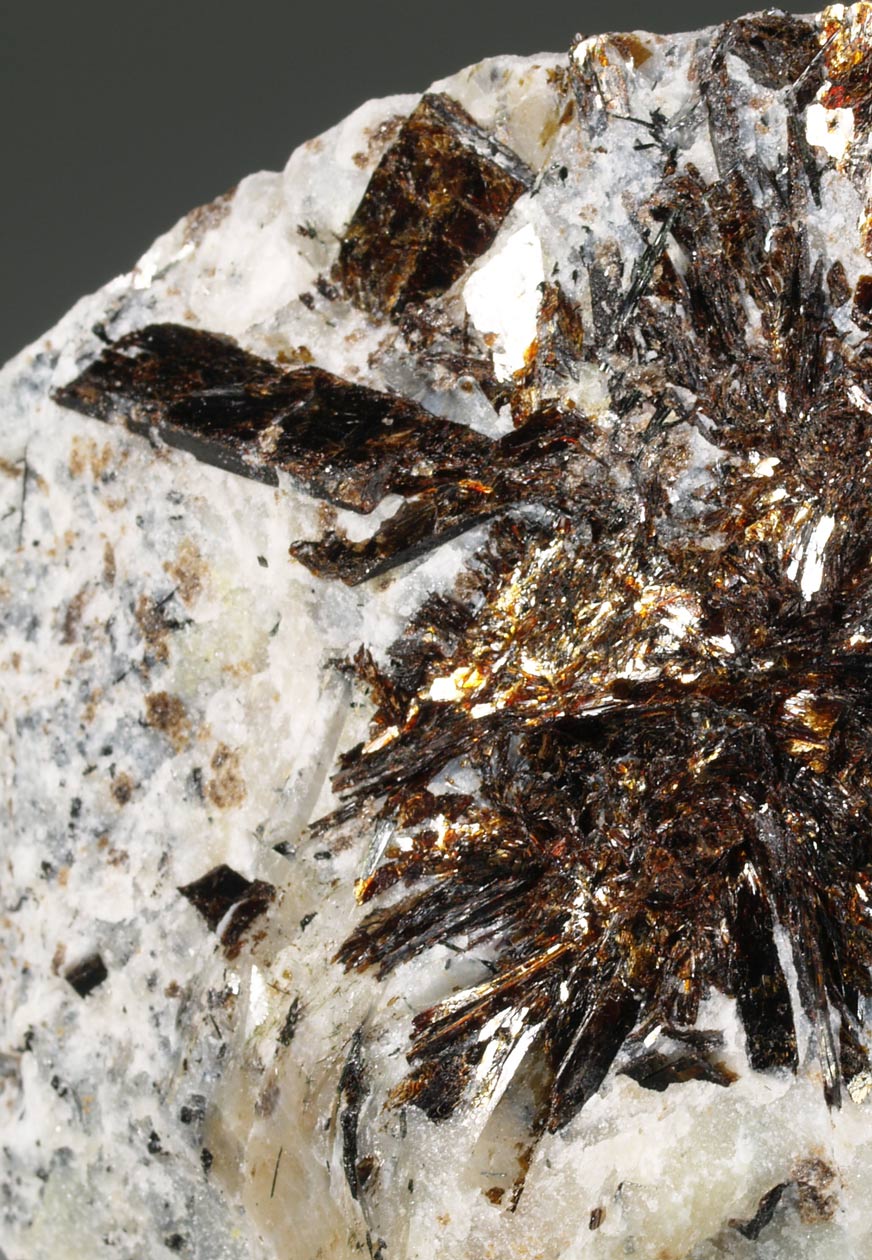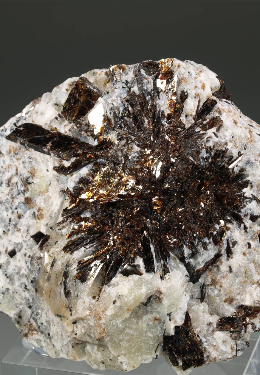 Un ejemplar particularmente estético de esta importante localidad con cristales gruesos, en forma de cristales laminares con brillo metálico, radiando de una parte central, en matriz. De esa estructura su nombre, del griego άστρον ("astron") para "estrella" y φύλλον ("phyllon") para "hoja", en alusión a su hábito de esprays con forma de estrella y aspecto micáceo. Muy buen tamaño.