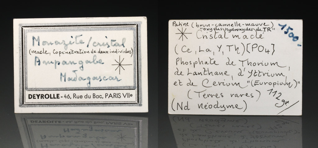 Los cristales de monazita de Madagascar son famosos en el mundo entero. Las localidades son múltiples. Este ejemplar que ofrecemos se acompaña de una etiqueta de Deyrolle (París). La compañía Deyrolle inició su andadura en 1831, de la mano de Jean-Baptiste Deyrolle, con la elaboración y venta de materiales relacionados con las ciencias naturales. Este ejemplar se acompaña de una etiqueta manuscrita por ambos lados.