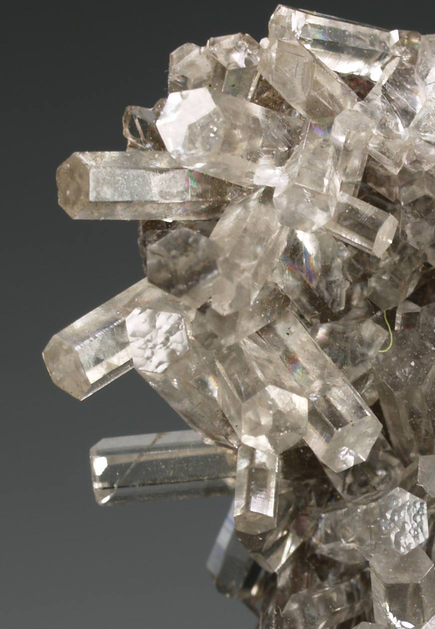 Muy rico grupo de prismas hexagonales incoloros y transparentes de calcita con terminaciones planas del pinacoide. El brillo es excelente y se disponen sobre una matriz de goethita. Muy estético ejemplar.