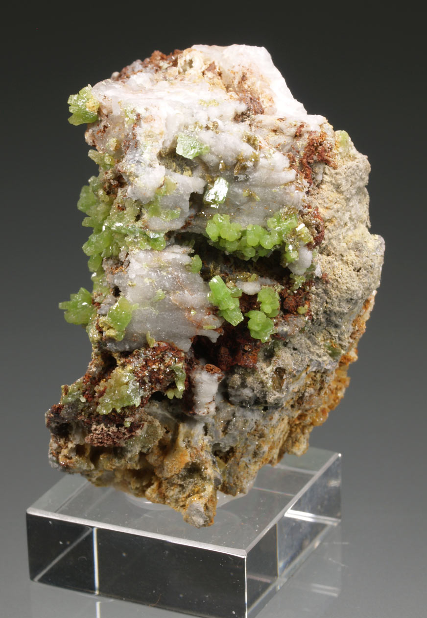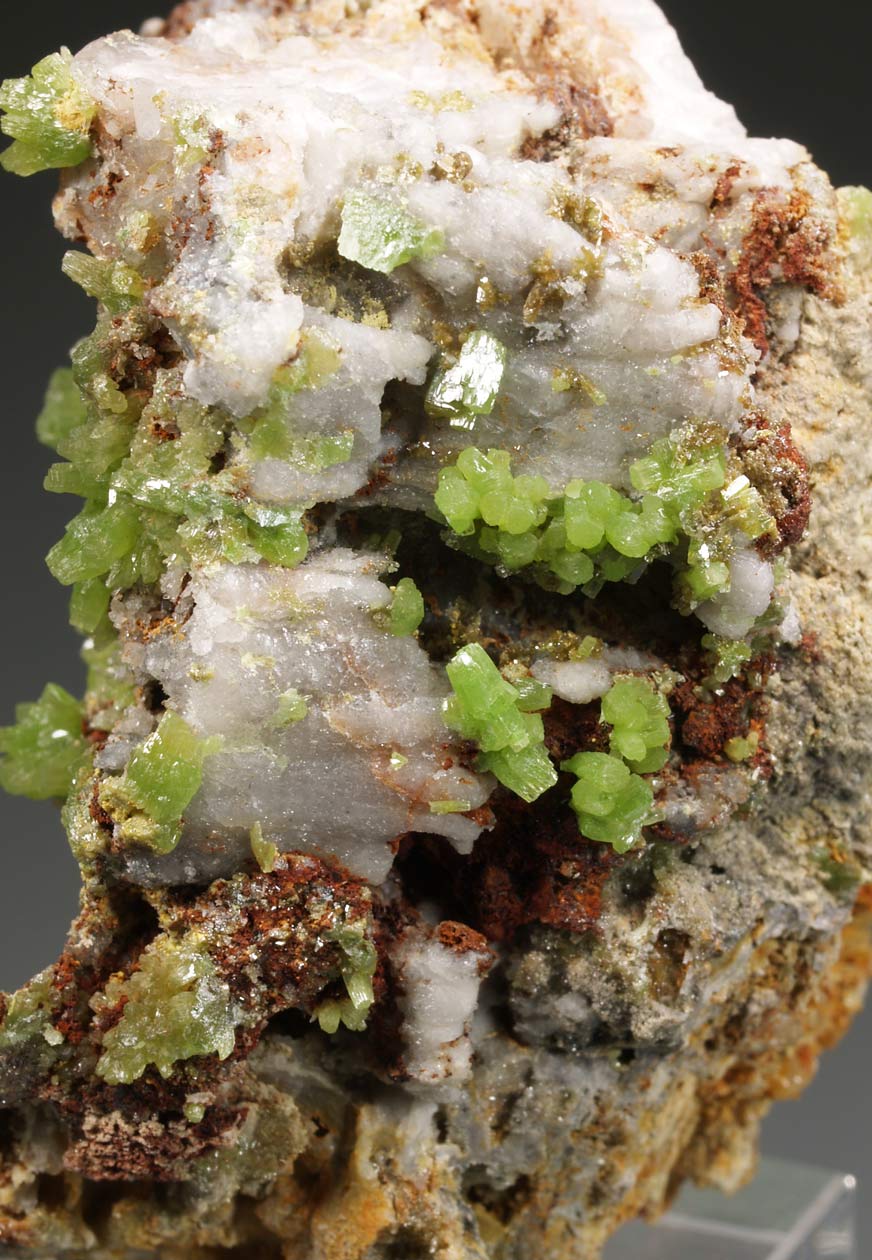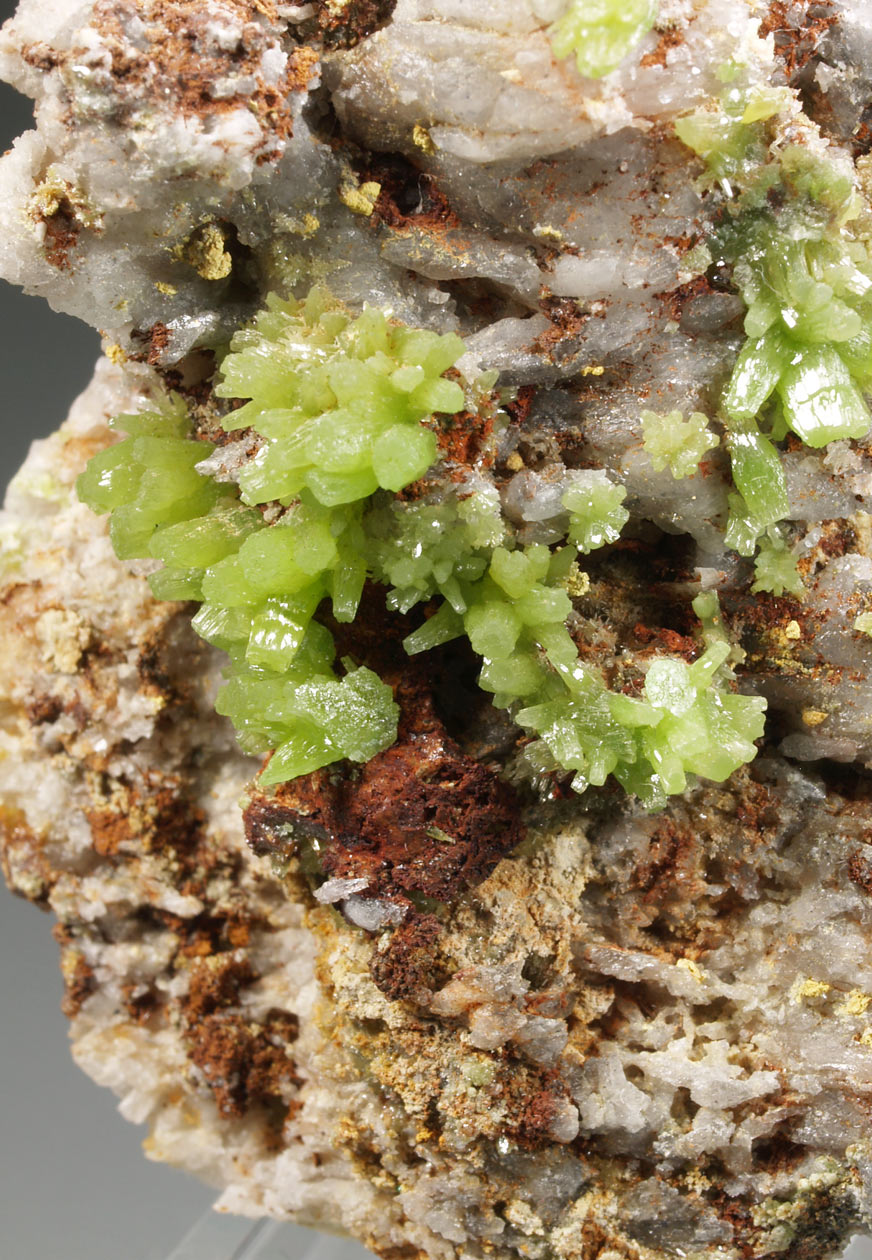 En este ejemplar hemos determinado numerosos agregados de cuprodongchuanita. En todos los ejemplares estudiados se detecta la presencia de As, lo que indicaría que estamos en una serie con la cuprozheshengita. Sería correcto etiquetarlo como cuprodongchuanita-cuprozheshengita. Se presenta como agregados globulares de color verde claro sobre cristales de veszelyita, muy definidos y sobre una matriz con hemimorfoita