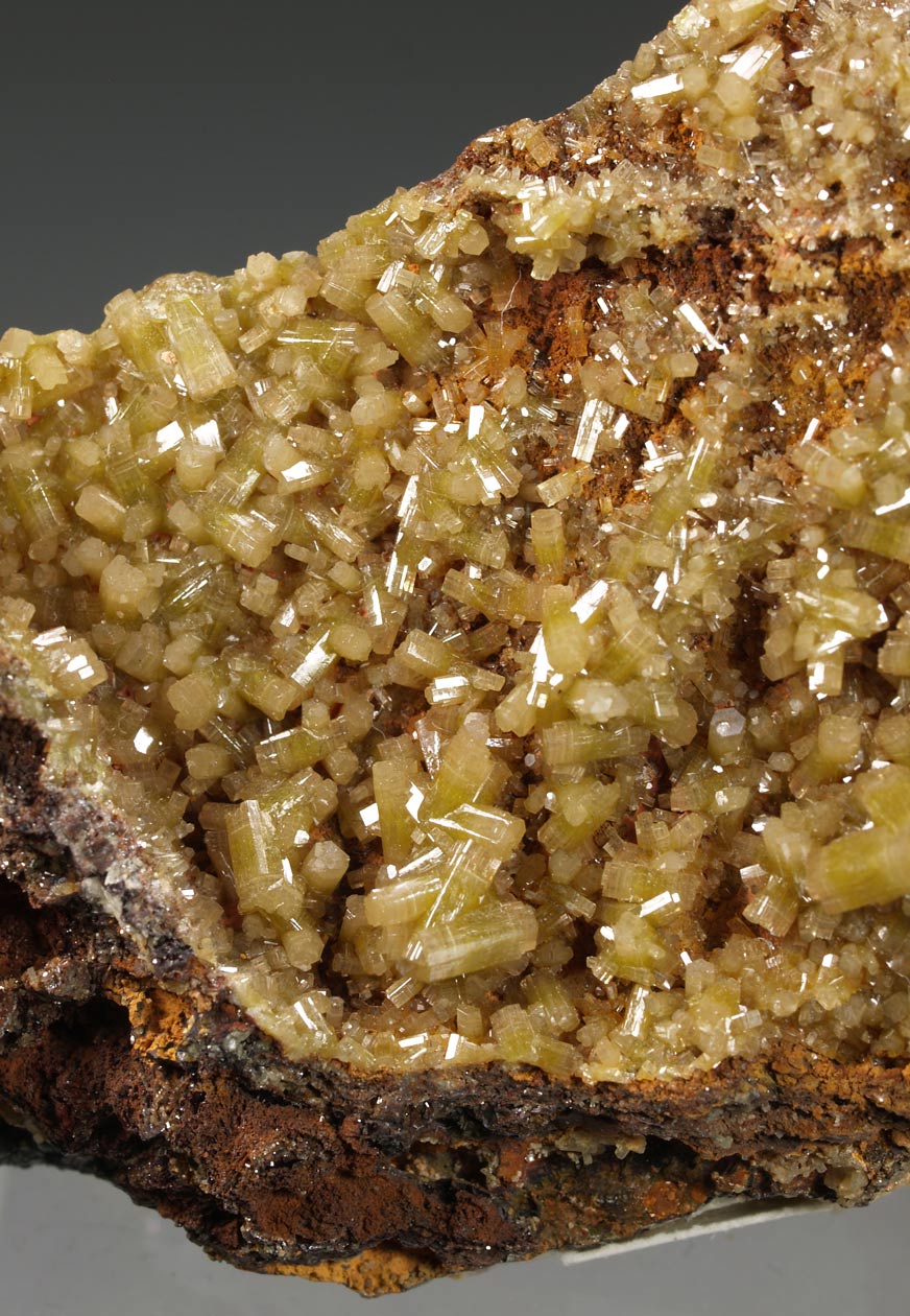 Grupo de cristales de piromorfita de color característico con formas hexagonales muy marcadas y caras y aristas brillantes y definidas. Los cristales recubren de la matriz. Procede de una mina clásica española y de la que han salido ejemplares de buena calidad.