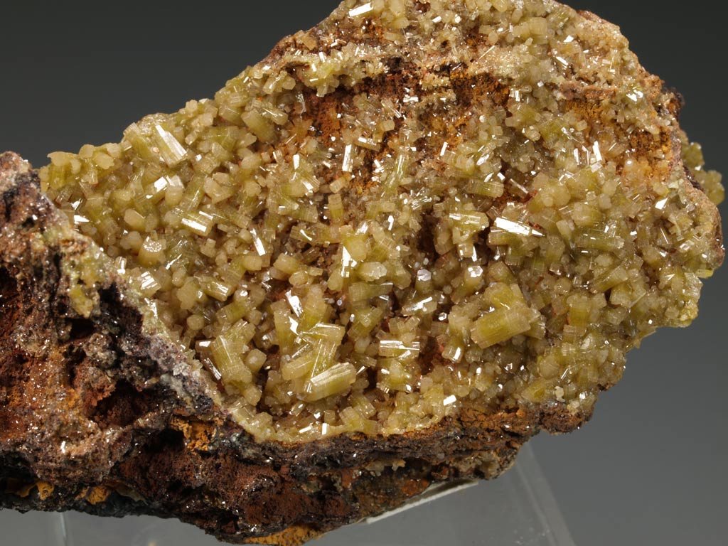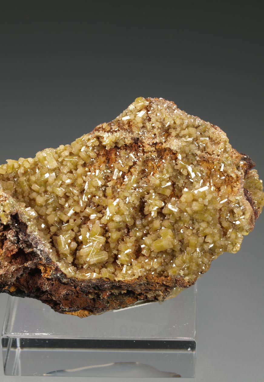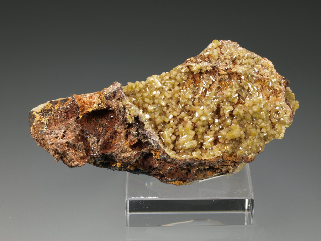 Los ejemplares de piromorfita de la mina San Andrés en Espiel, Córdoba, se conocen desde la primera mitad del siglo XX. A principios de los años 80 del s. XX se recuperaron de la mina numerosos ejemplares de calidad. Este ejemplar, por la fecha de la etiqueta de la colección J. Astor (Barcelona), se puede datar en este periodo. El ejemplar nos muetsra diversos cristales de piromorfita, de buen tamaño, brillantes, gruesos, translúcidos y con formas del prisma hexagonal abarrilado, con un color característico entre verde a verde-amarillento. Rellenan una geoda en la matriz de goethita. Un clásico español.