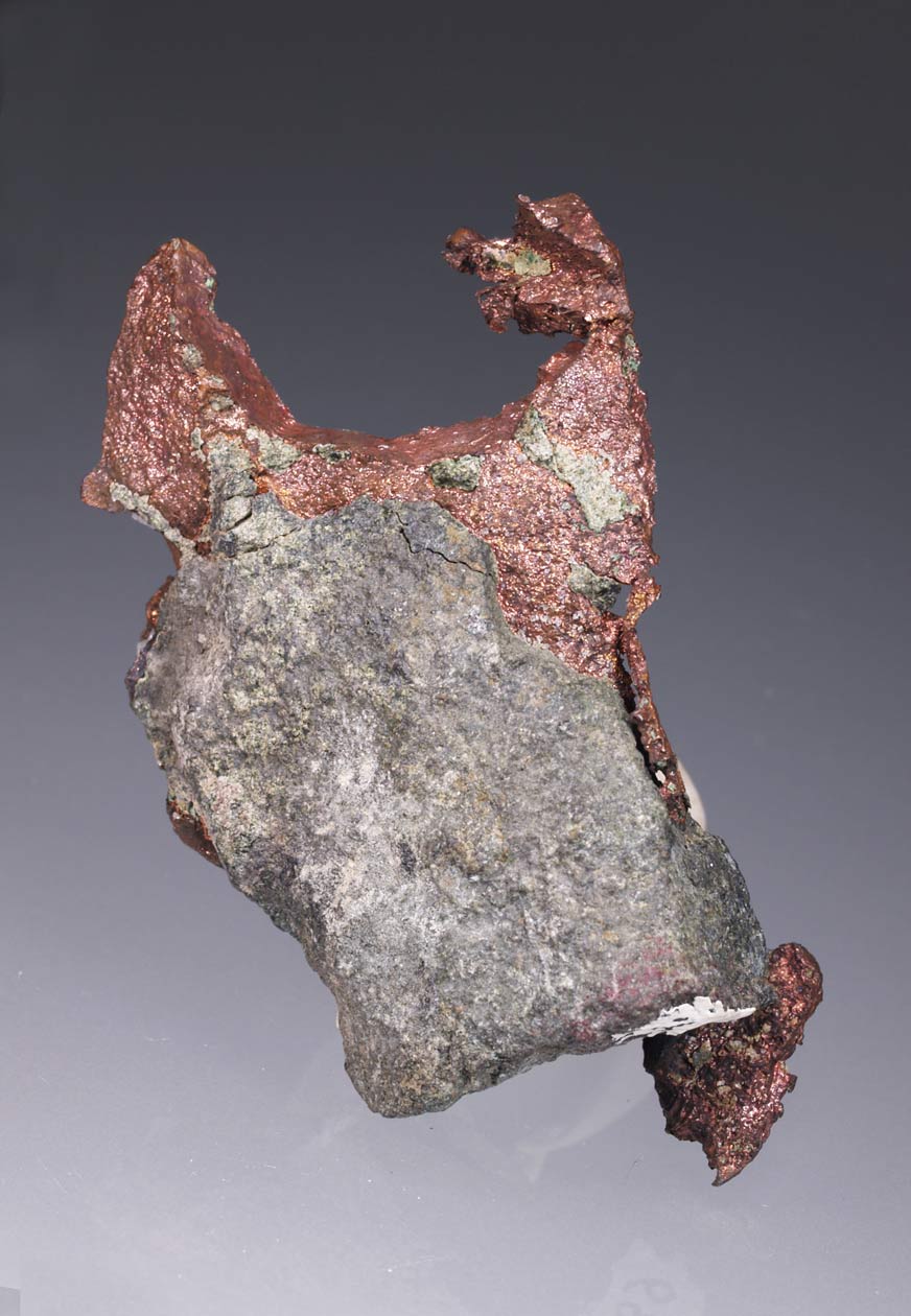 Ejemplar de cobre nativo de buen tamaño, que muestra caras cristalinas, típico de estos ejemplares, con un buen color, brillo y estética. Este ejemplar procede de los hallazgos realizados a mediados de los 90 en esta mina. No ha sido tratada con productos químicos, por lo que su color y brillo son naturales.